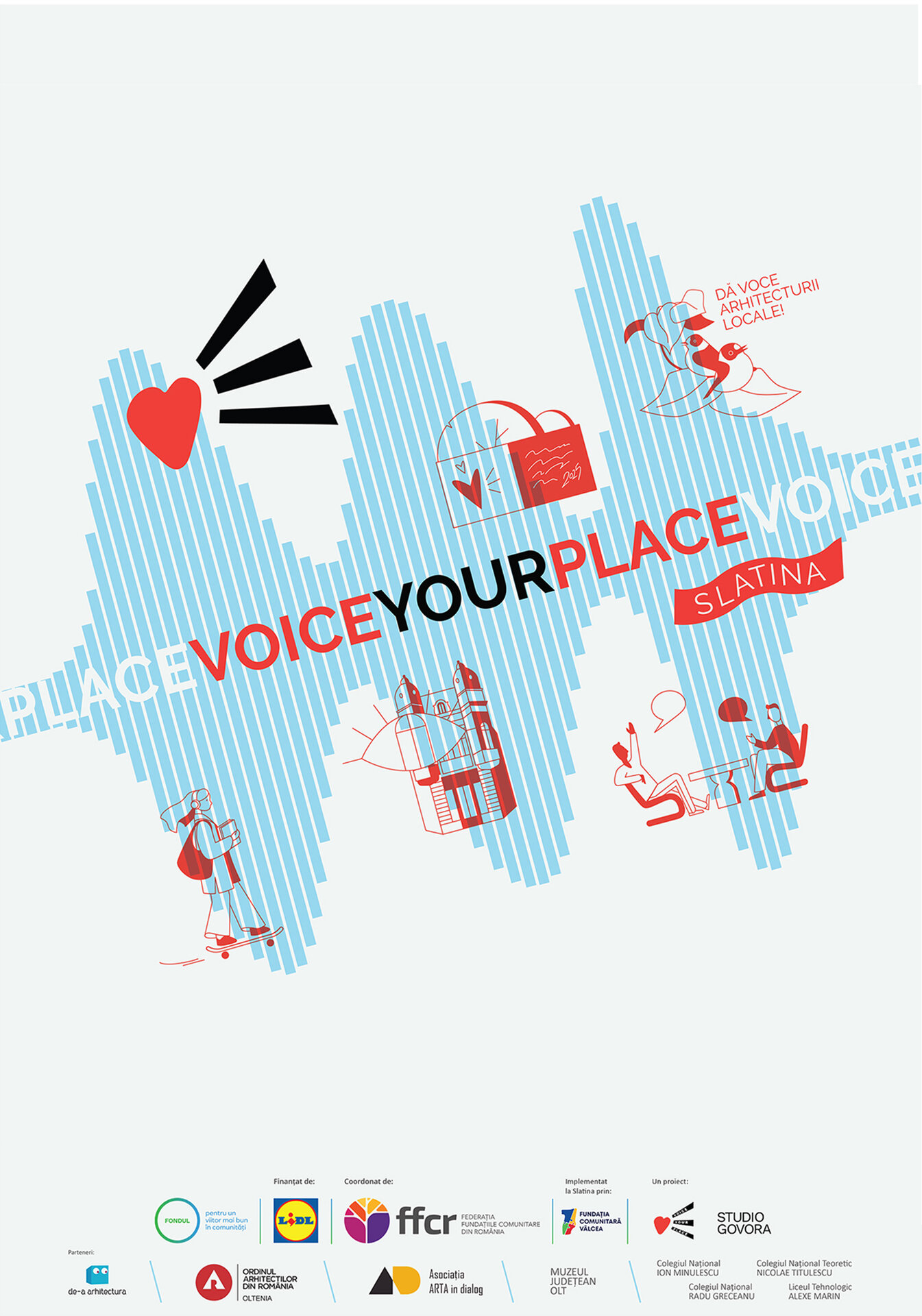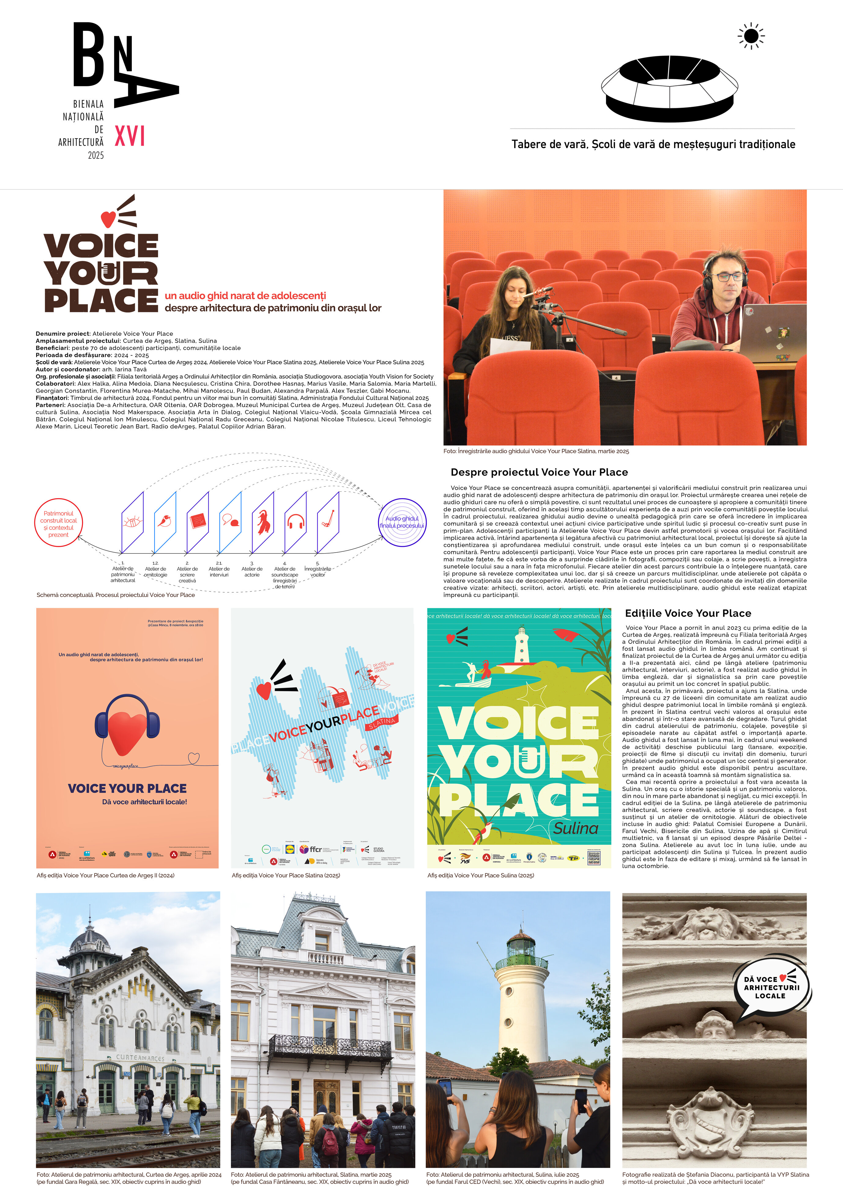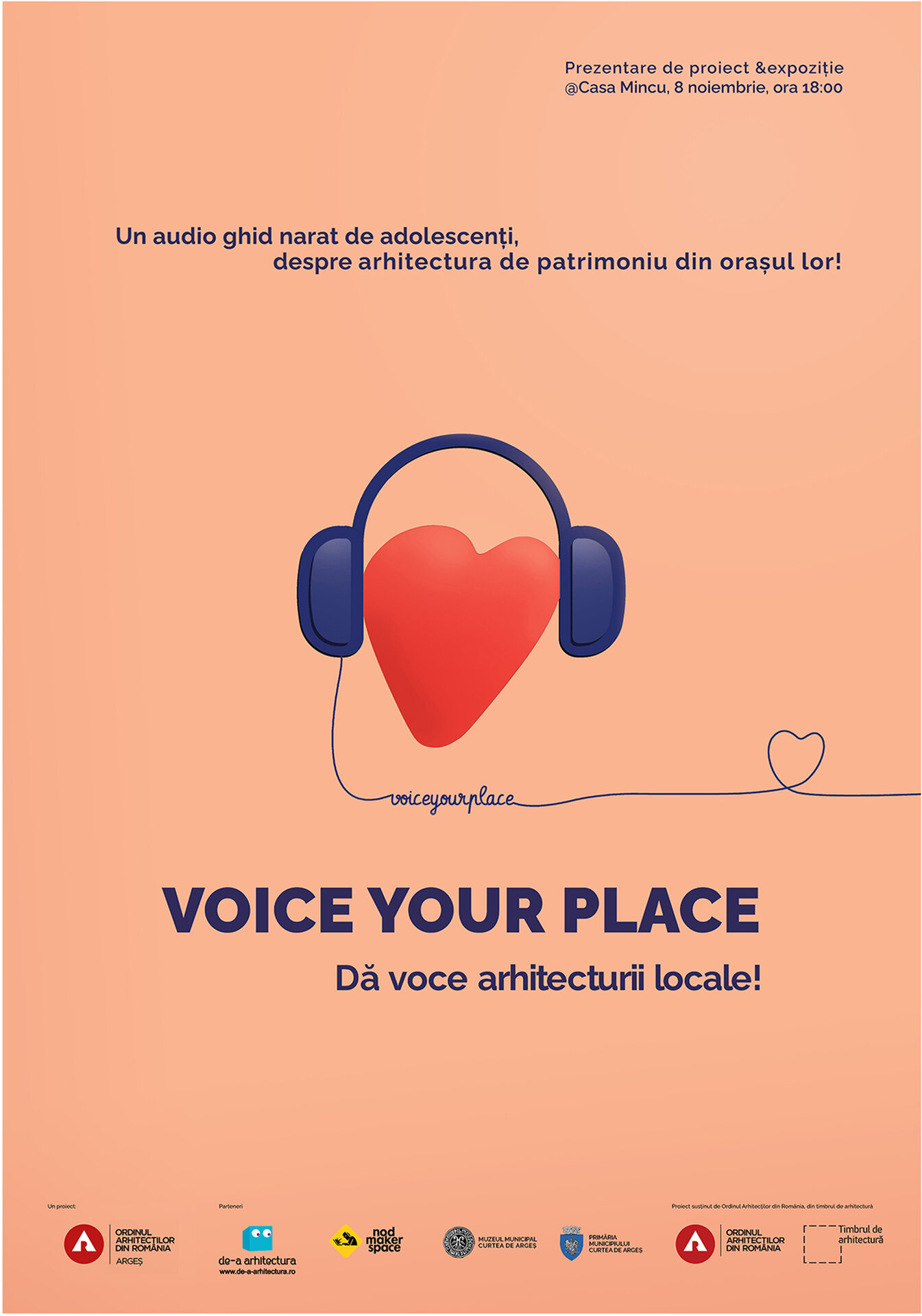 Voice Your Place se concentrează asupra comunității, apartenenței și valorificării mediului construit prin realizarea unui audio ghid narat de adolescenți despre arhitectura de patrimoniu din orașul lor. Proiectul urmărește crearea unei rețele de audio ghiduri care nu oferă o simplă povestire, ci sunt rezultatul unei proces de cunoaștere și apropiere a comunității tinere de patrimoniul construit, oferind în același timp ascultătorului experiența de a auzi prin vocile comunității poveștile locului. În cadrul proiectului, realizarea ghidului audio devine o unealtă pedagogică prin care se oferă încredere în implicarea comunitară și se creează contextul unei acțiuni civice participative unde spiritul ludic și procesul co-creativ sunt puse în prim-plan. Adolescenții participanți la Atelierele Voice Your Place devin astfel promotorii și vocea orașului lor. Facilitând implicarea activă, întărind apartenența și legătura afectivă cu patrimoniul arhitectural local, proiectul își dorește să ajute la conștientizarea și aprofundarea mediului construit, unde orașul este înțeles ca un bun comun și o responsabilitate comunitară.
