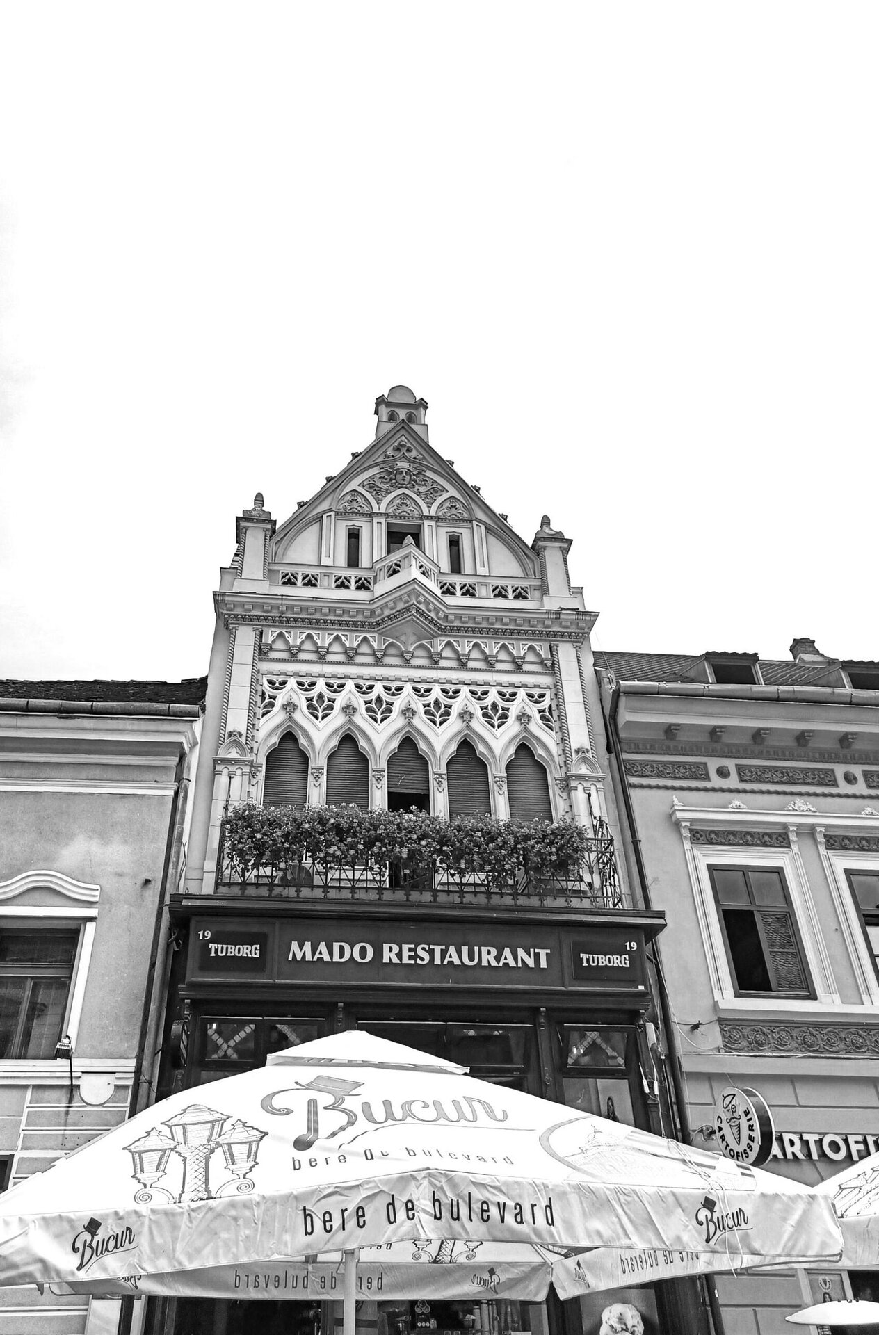 MODEL 1 - Clădire (1902) aflată pe strada Republicii la nr. 10, intrată în memoria colectivă cu numele restaurantului ce funcționează de mai bine de 20 de ani (Mado). Construcție tipică de negustor, cu spațiu comercial la parter și locuință la etaj, este reprezentantă a curentului neogotic, ce a reluat formele arhitecturii gotice medievale, în cadrul curentului istorist. Decorațiunile reiau și reinterpretează în stuc modele ce odinioară erau executate în piatră de meșteri pricepuți. Registrul etajului prezintă la ferestre goluri polilobate la partea superioară, închise în arc frânt - un element specific arhitecturii gotice. Alte elemente de tipul frizelor sprijinite pe console, ogive, simularea unor elemente definitorii goticului, cum este pinaclul, încununează frontonul bogat decorat, la partea superioară a fațadei.