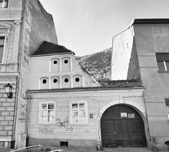 MODEL 4 - Clădire aflată pe strada Castelului la nr. 42 (1581). Cu o arhitectură simplă, specifică vechilor locuințe de factură rurală, dezvoltate de-a lungul lotului, construcția prezintă o particularitate a frontonului dinspre stradă, de factură renascentistă, și anume ritmul de pilaștri angajați ce susțin nișele închise în arc de cerc - ce formează o suită (în acest caz dispusă pe două registre), pe care o mai întâlnim și la alte construcții din Transilvania: biserica evanghelică din Bistrița, biserica evanghelică fortificată din Prejmer, castelul din Lăzarea. Acest tip de decorațiune este considerată a fi o influență italiană, de proveniență lombardă (la Bistrița a lucrat pietrarul Petrus Italus din Lugano). Pinionul teșit, țigla solzi ascuțiți și poarta masivă, ce ascunde privirii curtea interioară, sunt specifice arhitecturii săsești din Țara Bârsei.