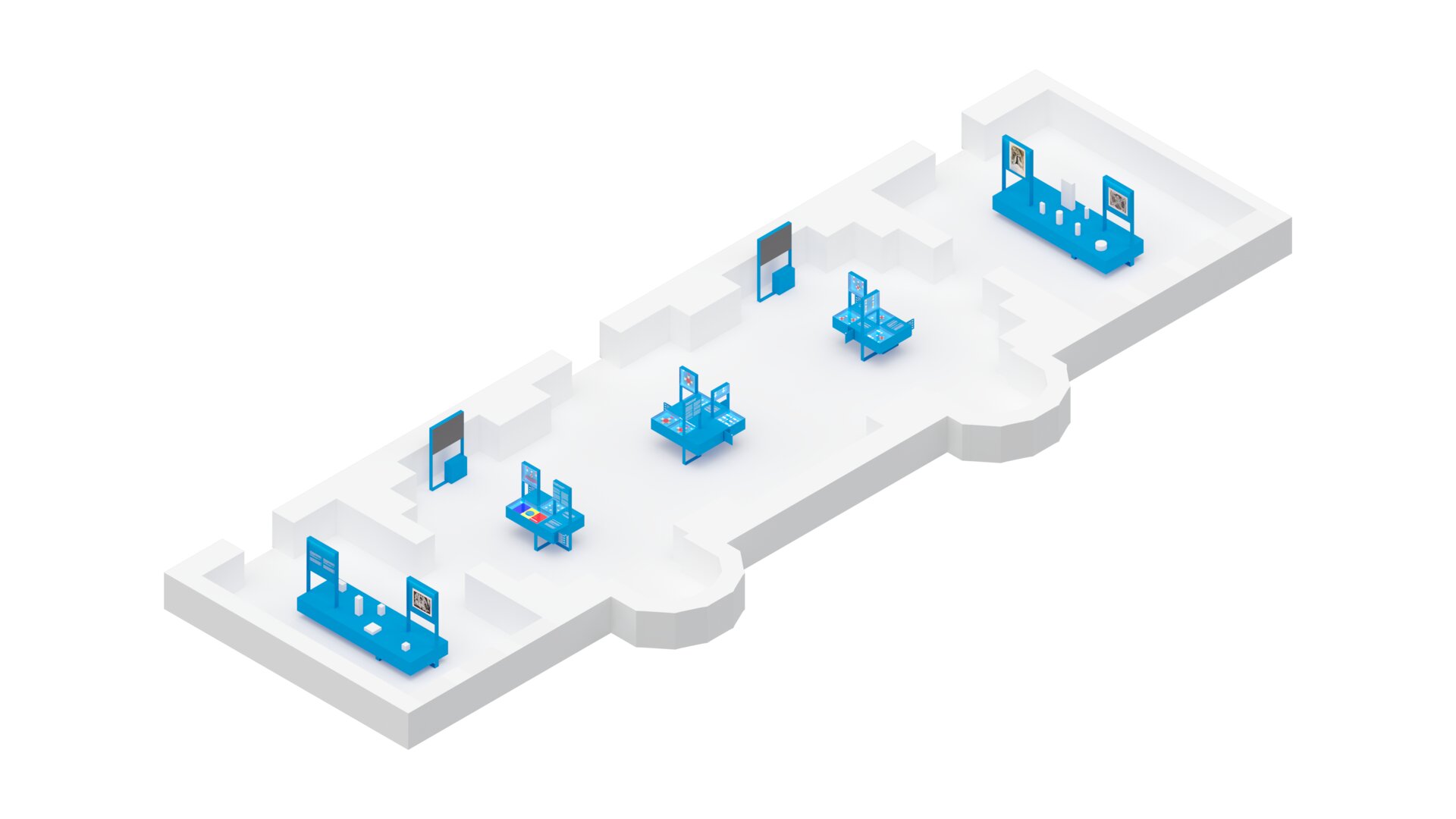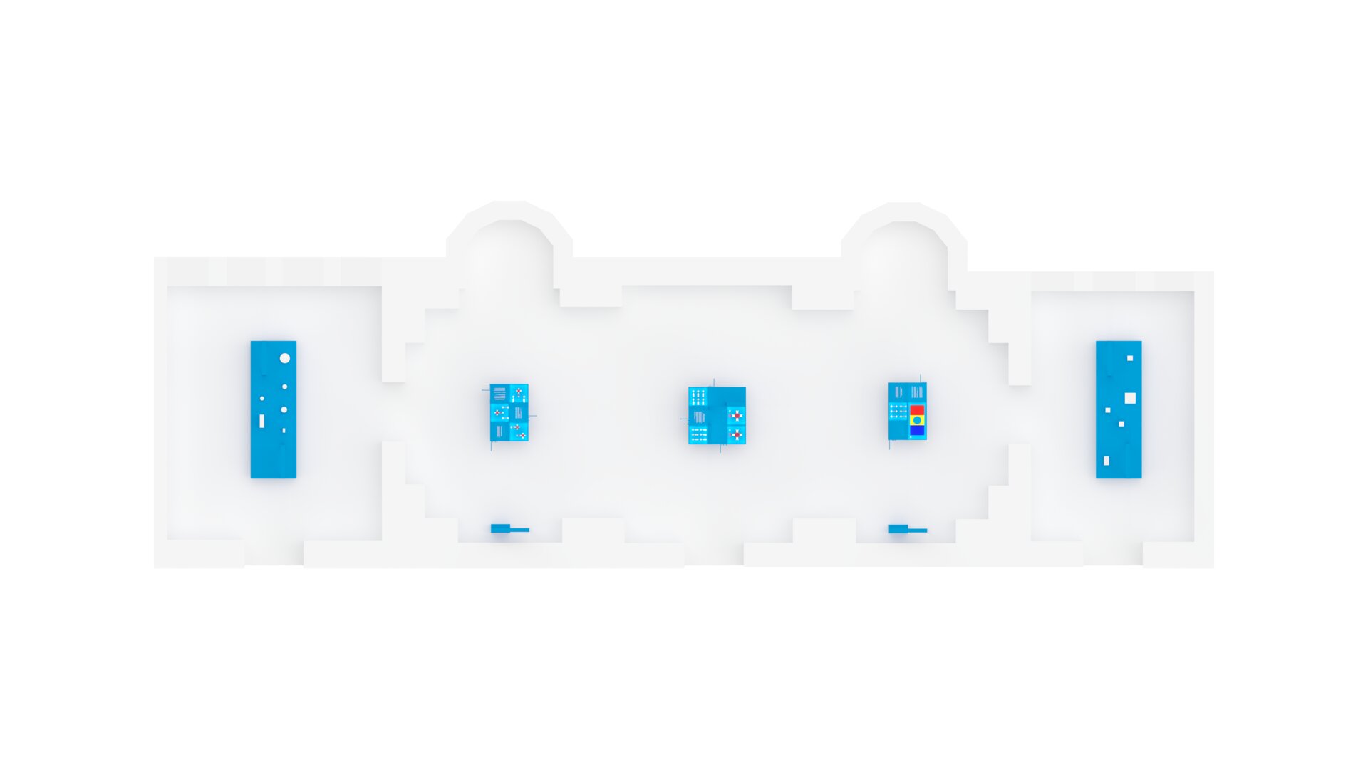 Sistemele de expunere, realizate din module geometrice simple și tratate cromatic monocrom, funcționează ca un contrapunct față de bogăția decorativă a sălilor brâncovenești. Independența lor structurală, cromatica uniformă și iluminatul controlat creează o grilă neutră de lectură pentru obiectele expuse, fără a concura cu detaliile arhitecturale. Acest mobilier contemporan pune în valoare atât obiectele prezentate, cât și contextul istoric în care sunt amplasate.