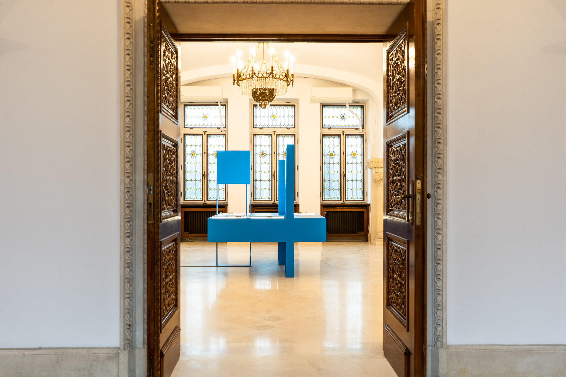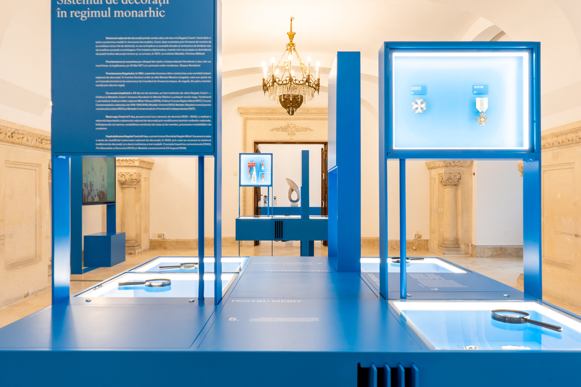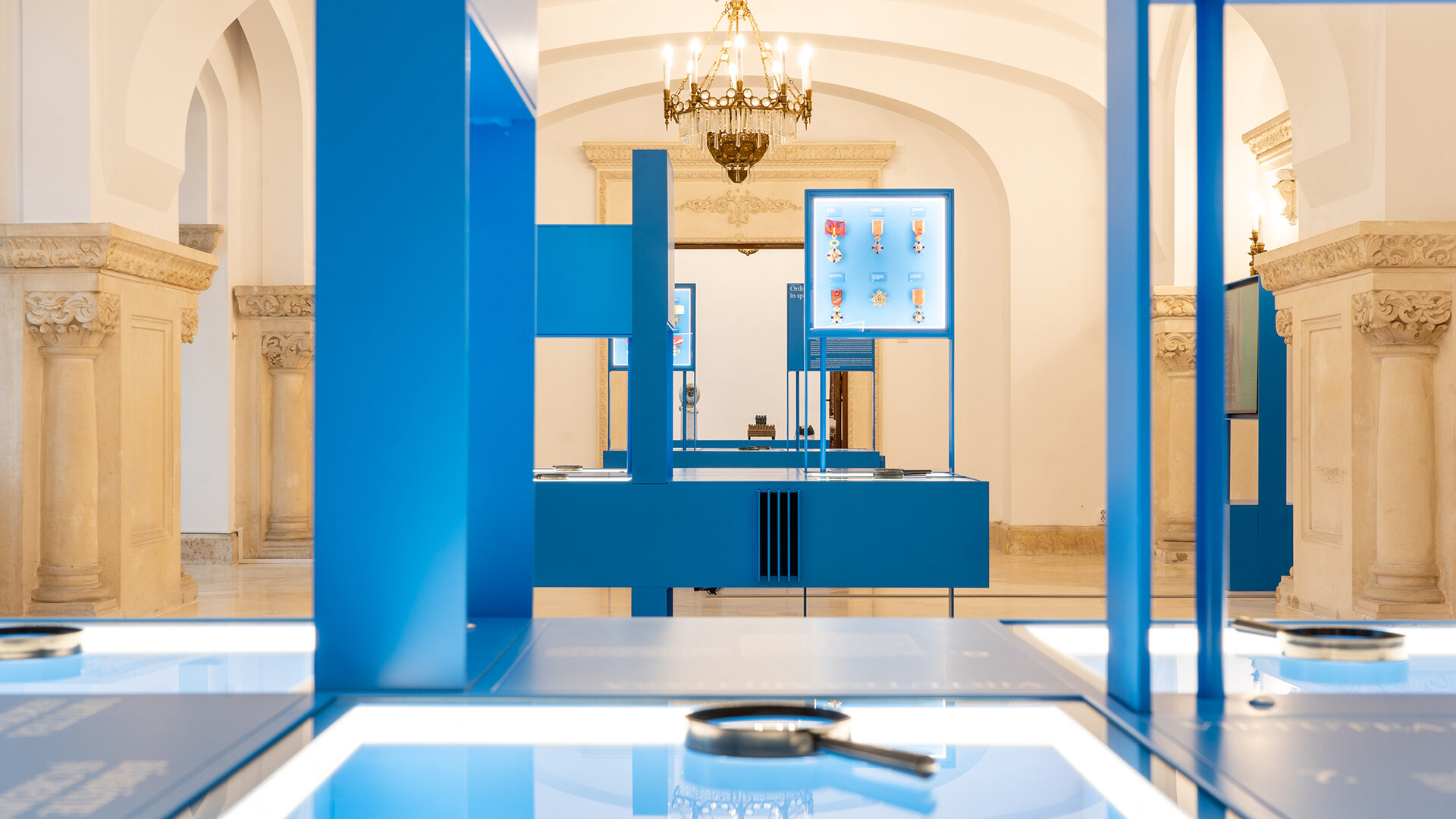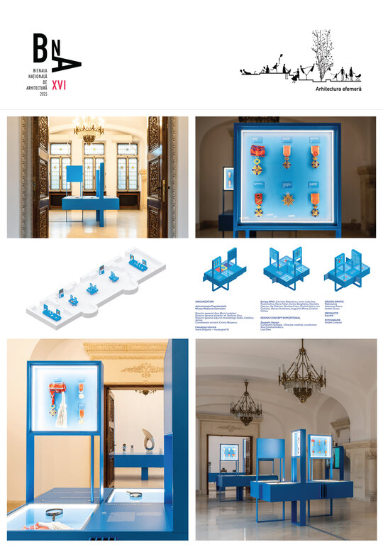 Ansamblul expozițional este conceput pentru a decupa obiectele din densitatea ornamentală a sălilor și pentru a crea perspective clare de observare. Corpurile suspendate, prevăzute cu decupaje ample, asigură atât protecția pieselor, cât și continuitatea vizuală cu spațiul istoric.