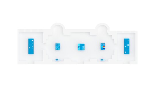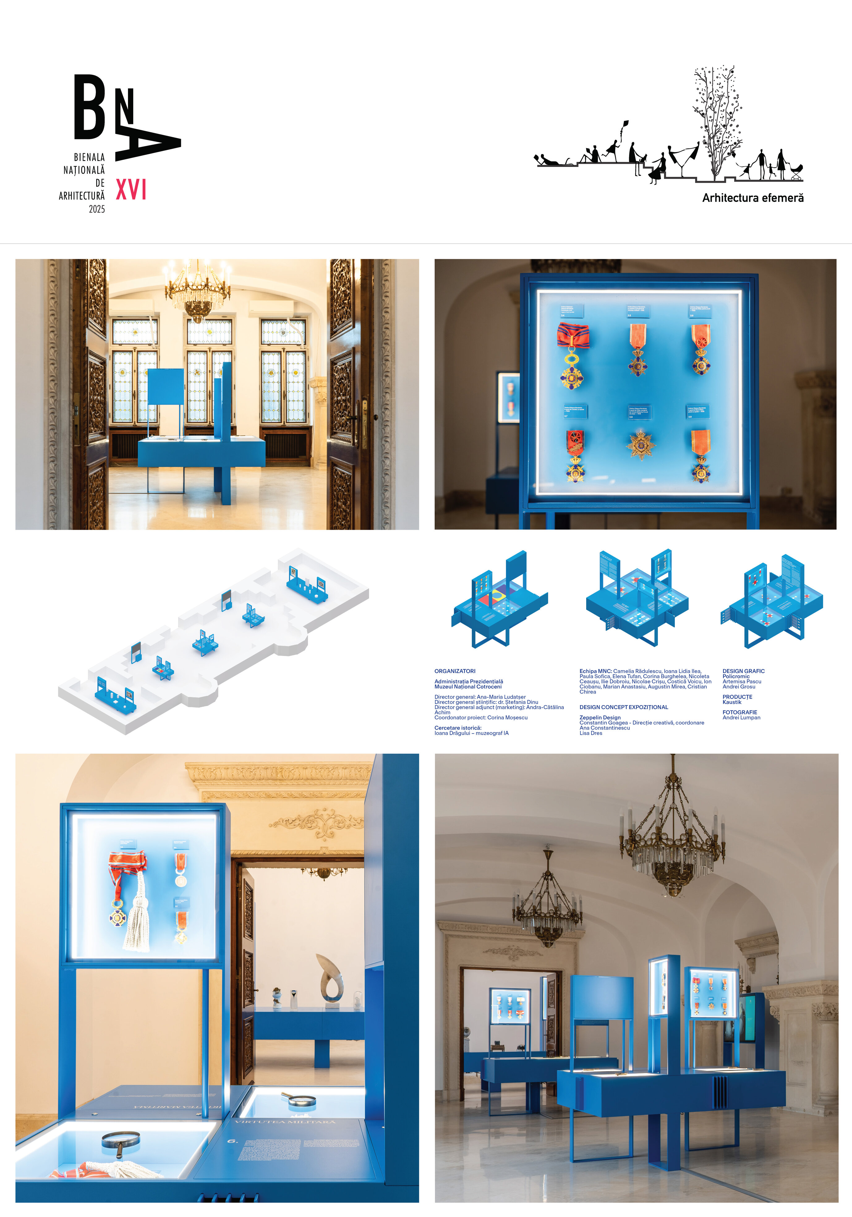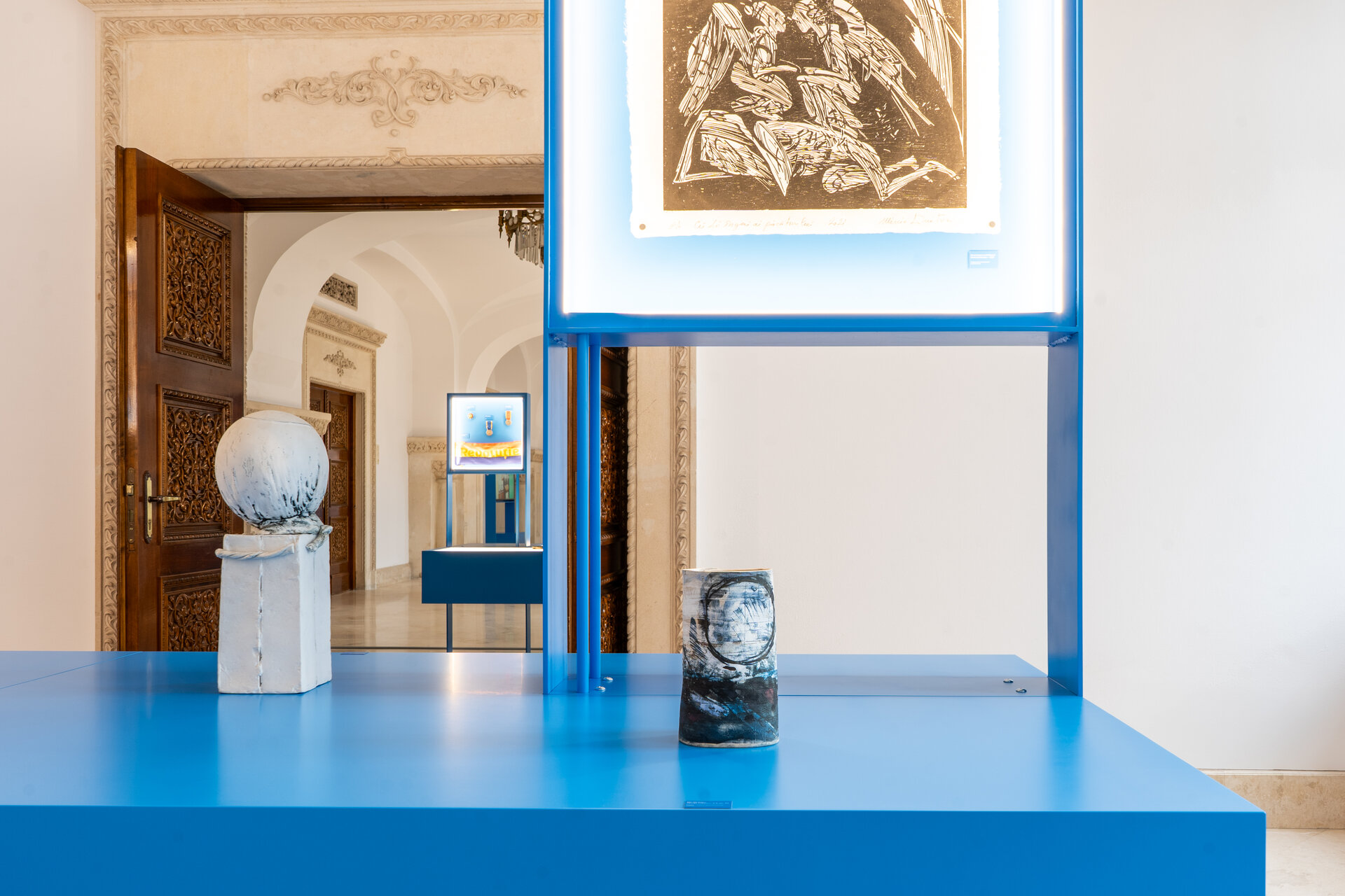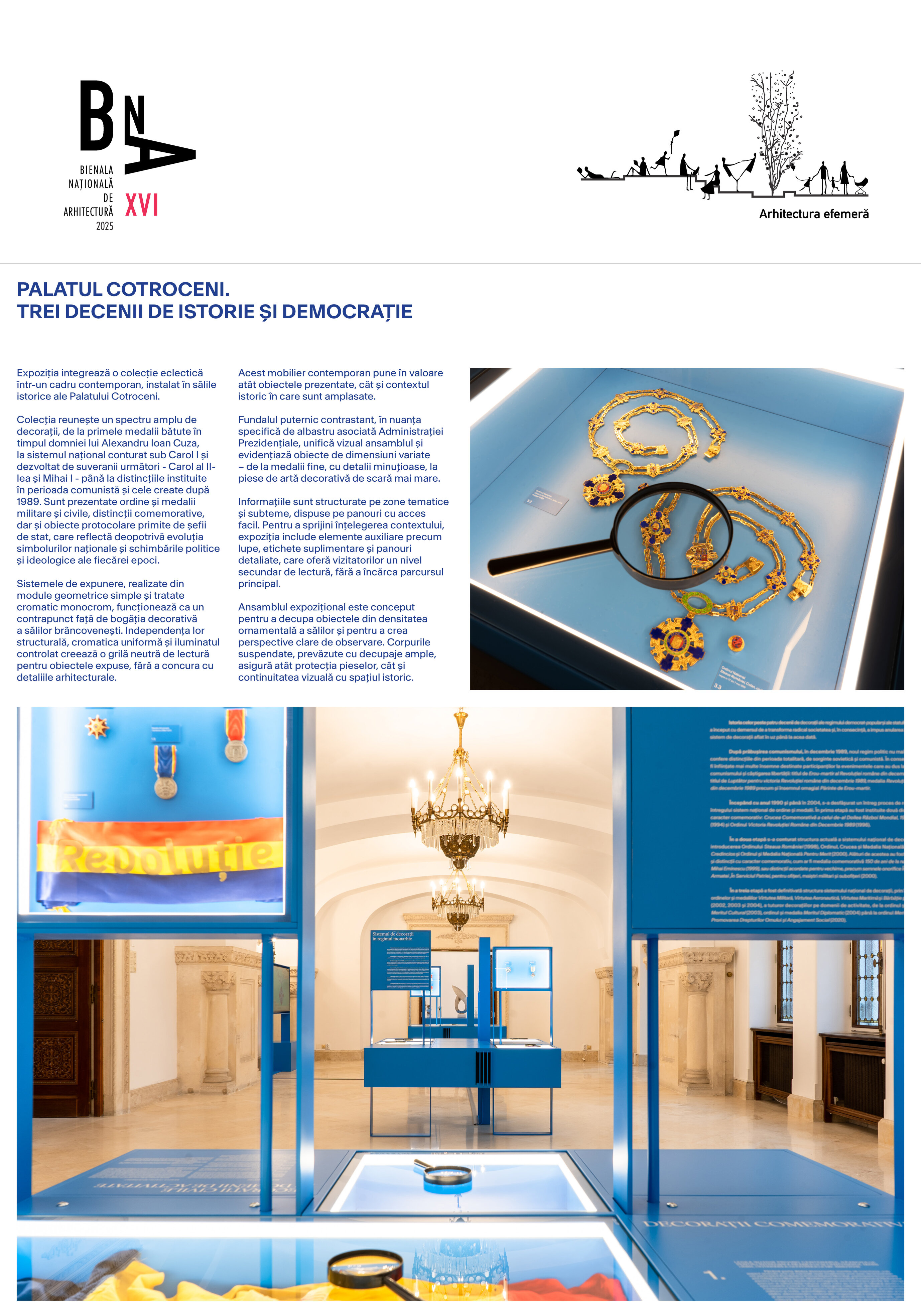 Ansamblul expozițional este conceput pentru a decupa obiectele din densitatea ornamentală a sălilor și pentru a crea perspective clare de observare. Corpurile suspendate, prevăzute cu decupaje ample, asigură atât protecția pieselor, cât și continuitatea vizuală cu spațiul istoric.