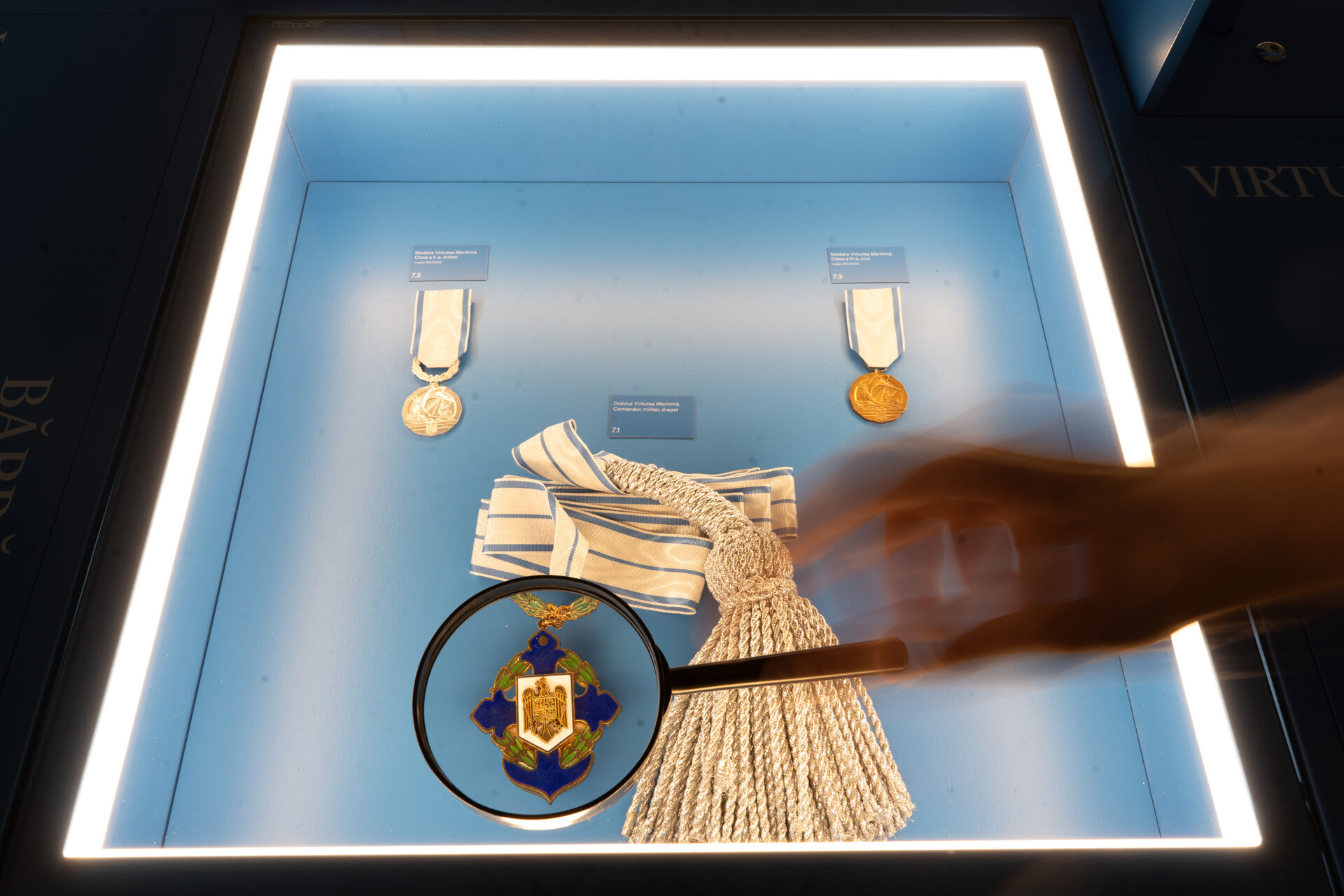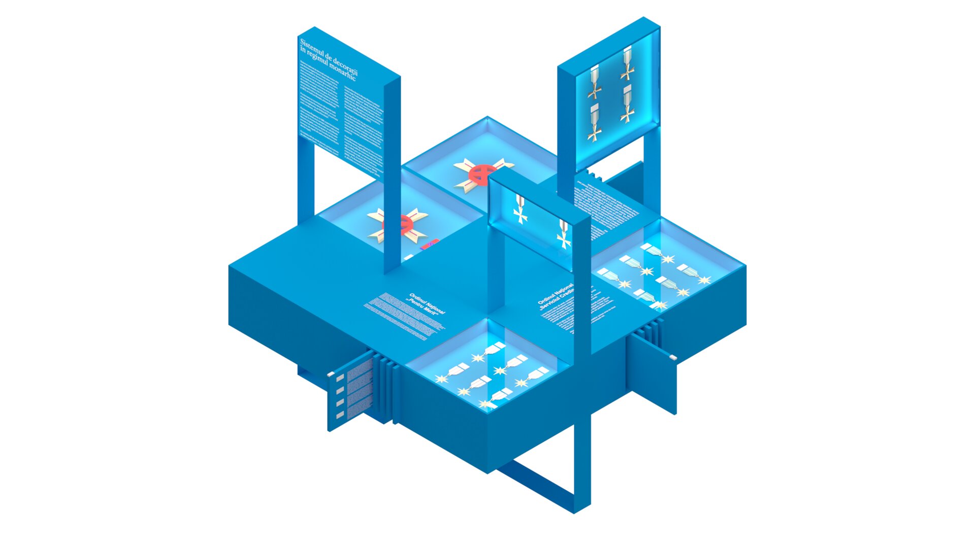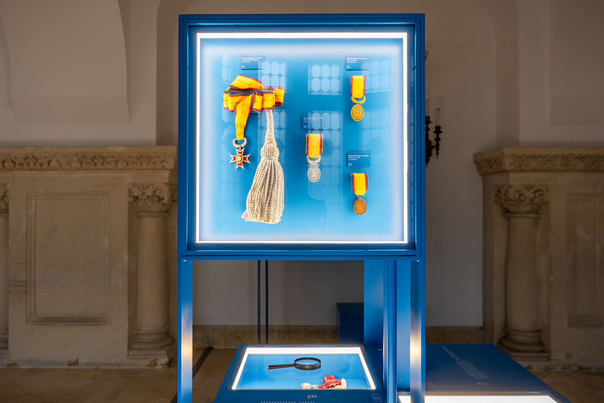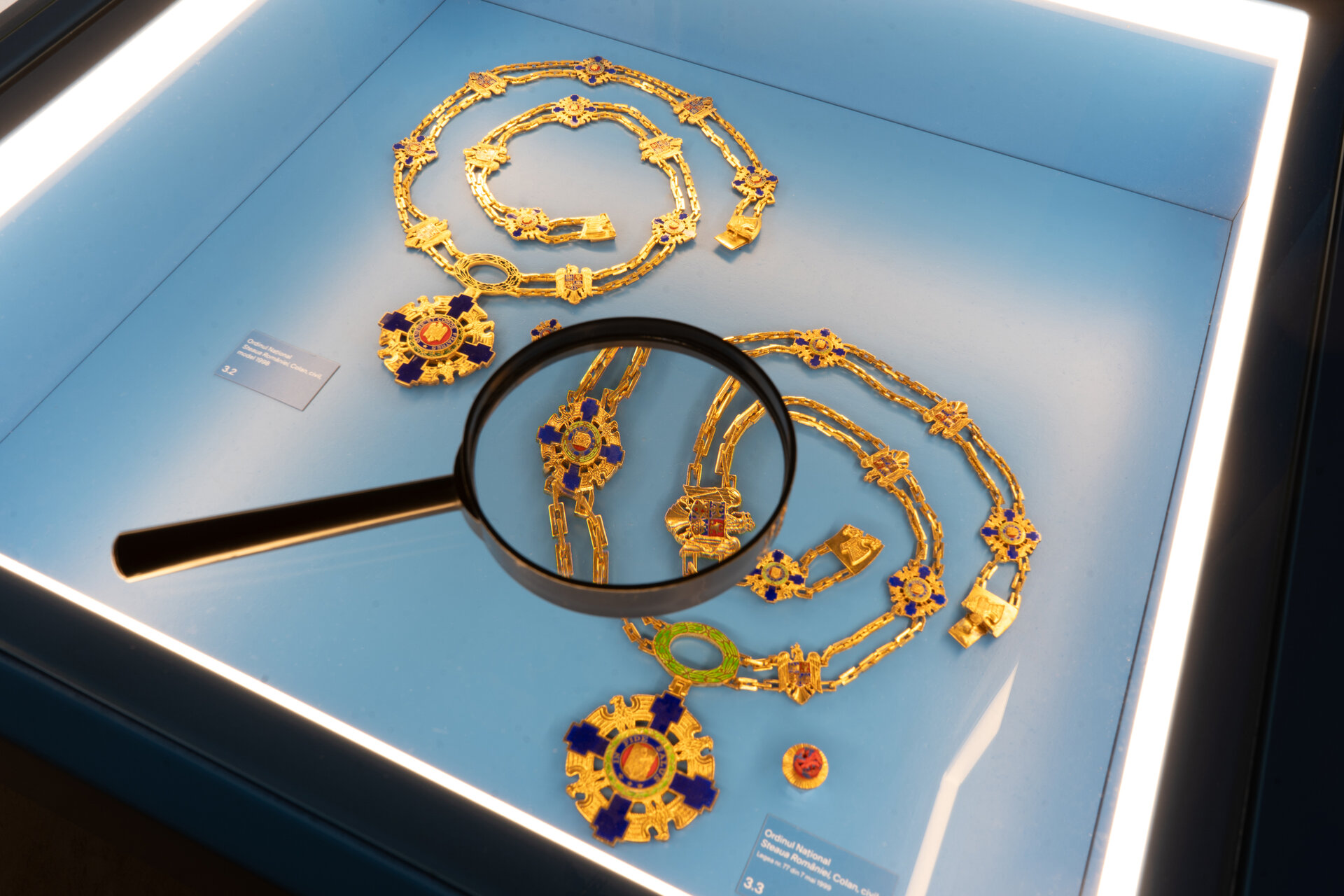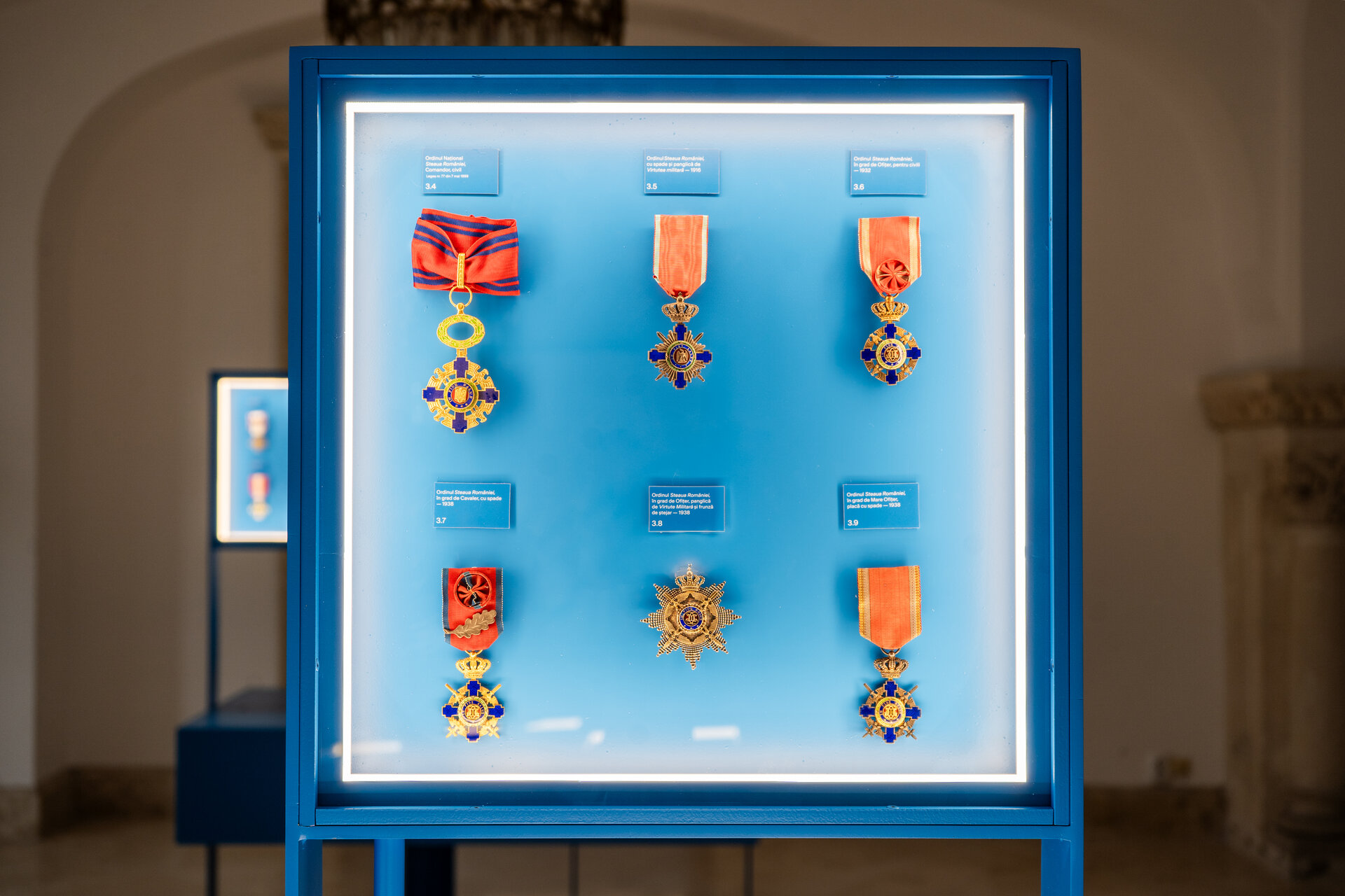 Fundalul puternic contrastant, în nuanța specifică de albastru asociată Administrației Prezidențiale, unifică vizual ansamblul și la medalii fine, cu detalii minuțioase, la piese de artă decorativă de scară mai mare.