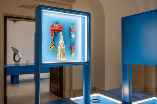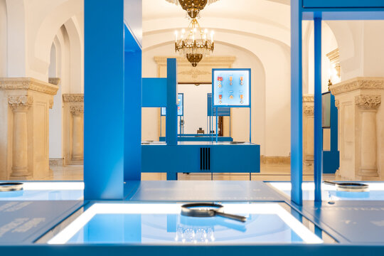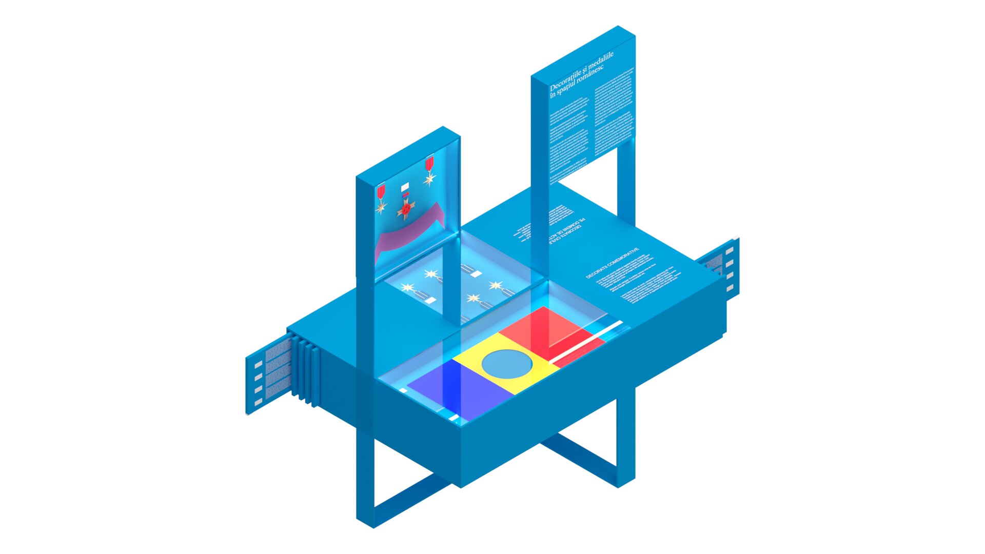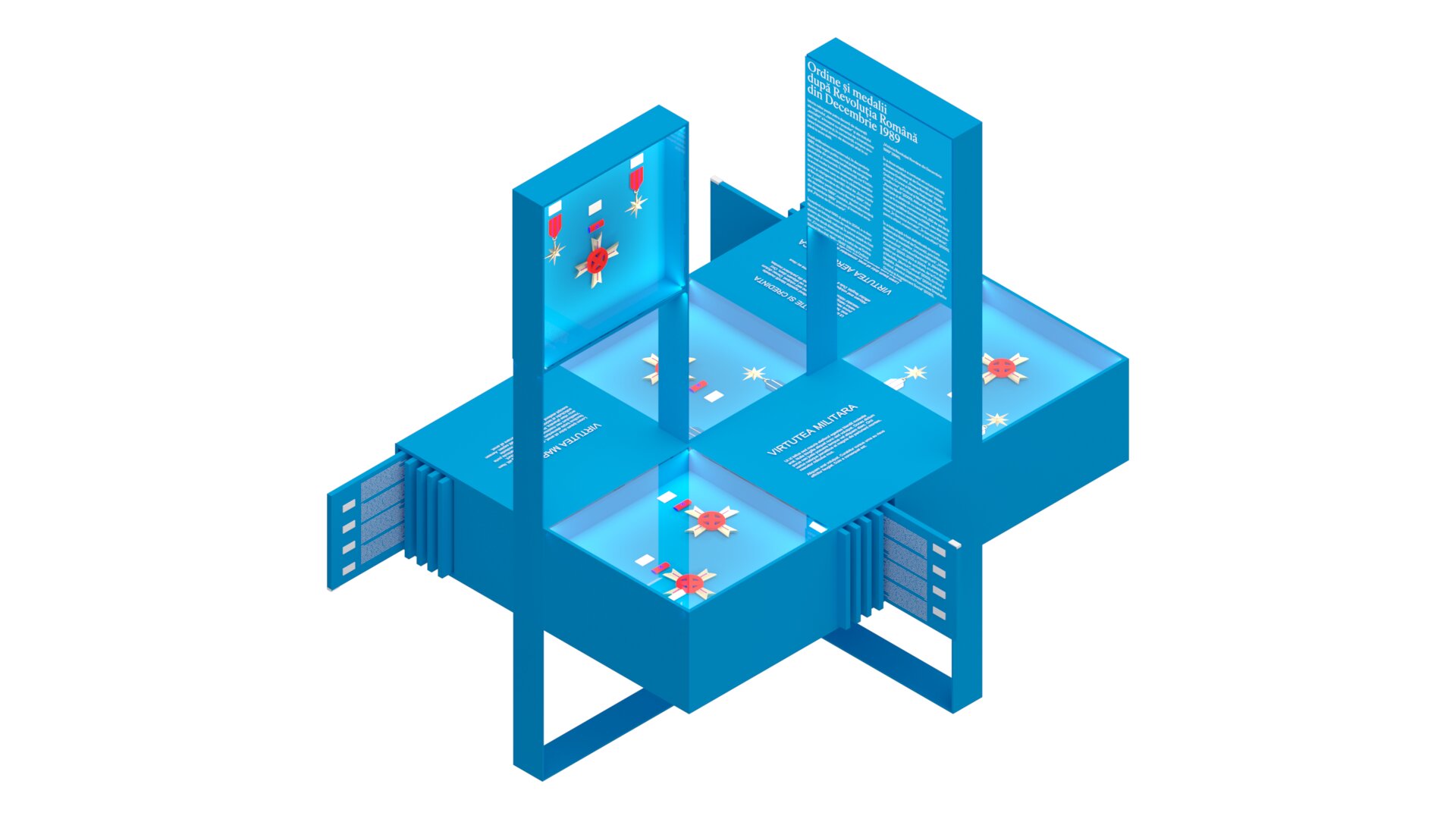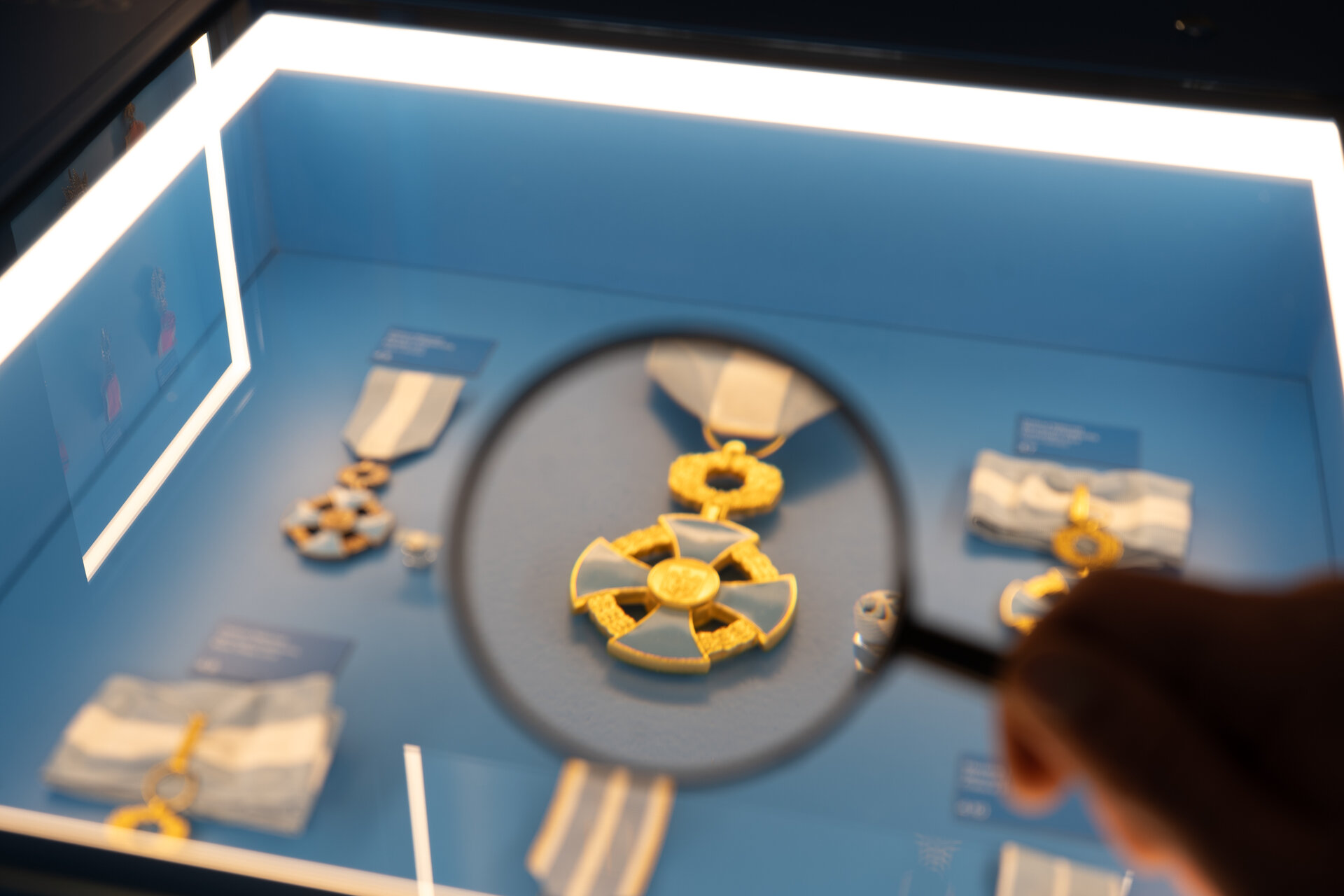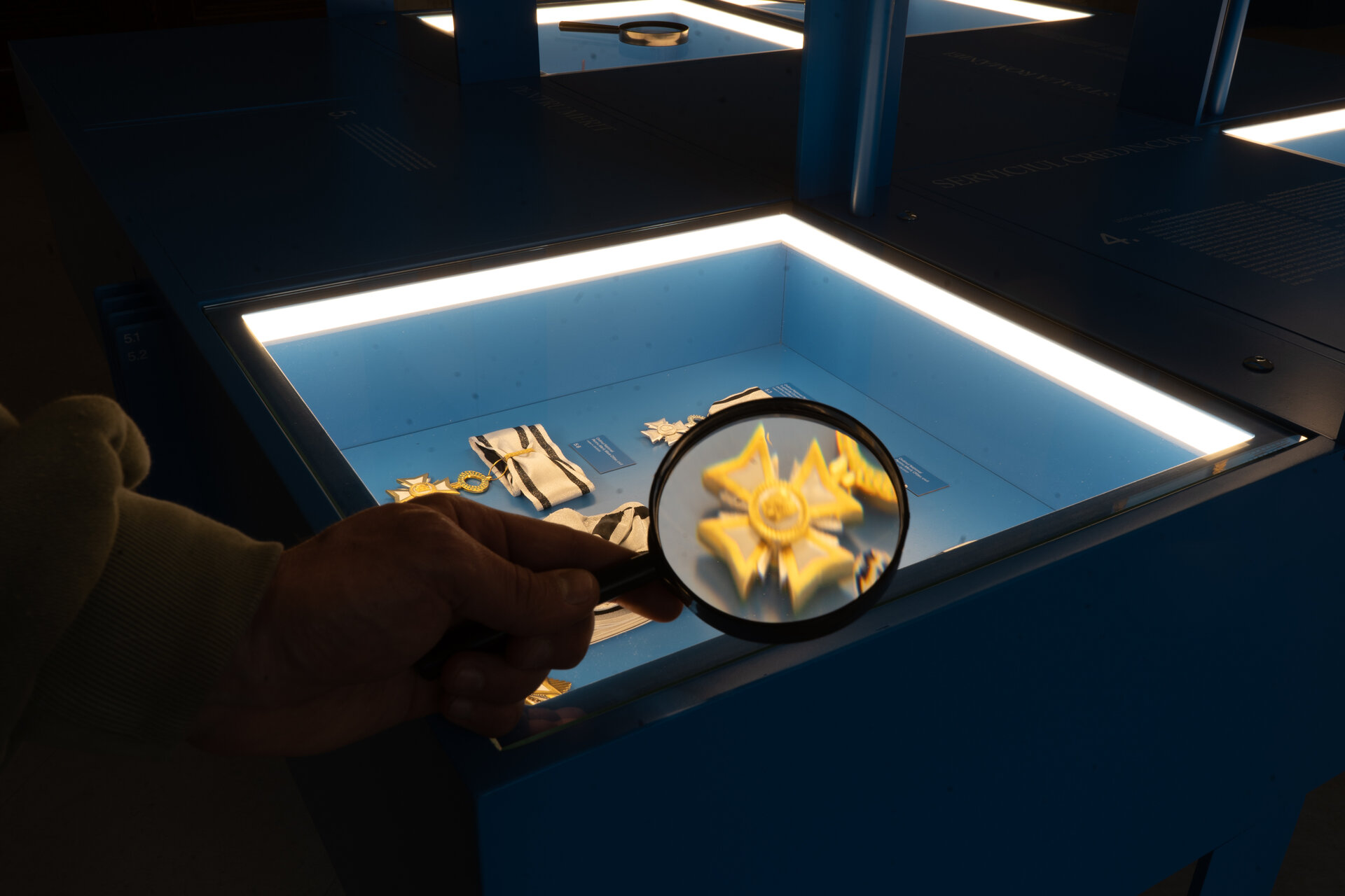 Fundalul puternic contrastant, în nuanța specifică de albastru asociată Administrației Prezidențiale, unifică vizual ansamblul și la medalii fine, cu detalii minuțioase, la piese de artă decorativă de scară mai mare.
