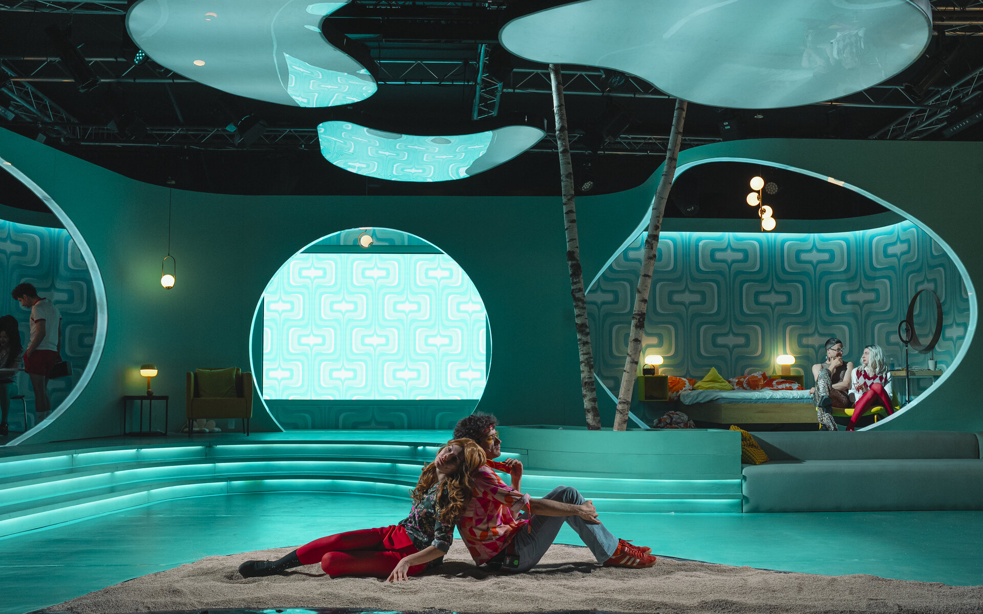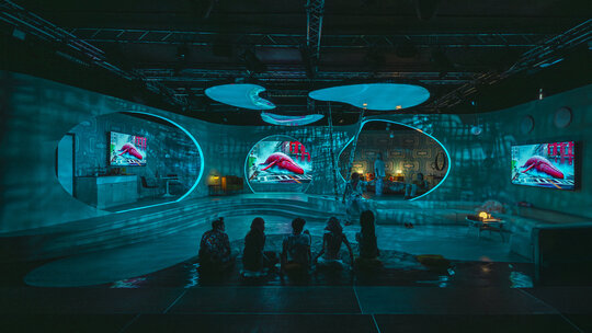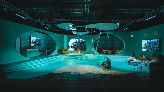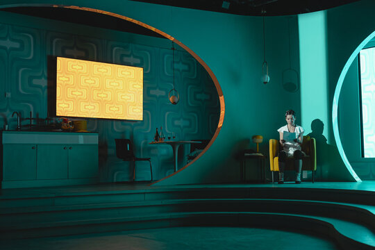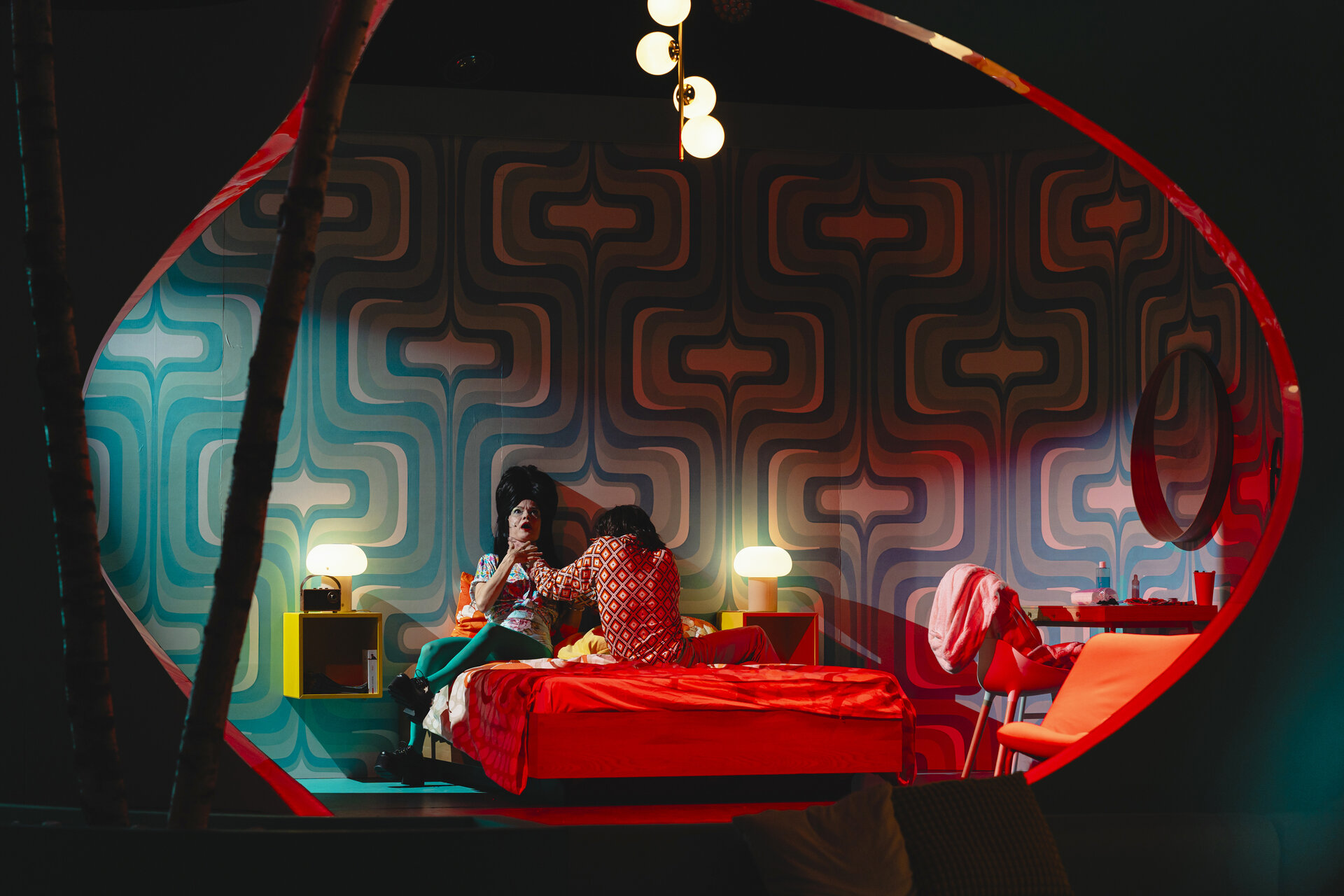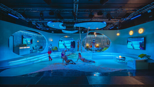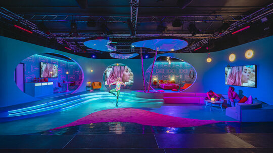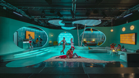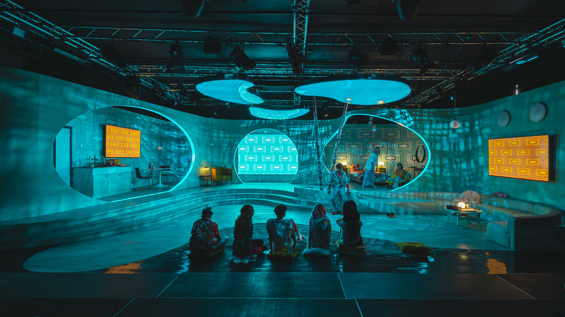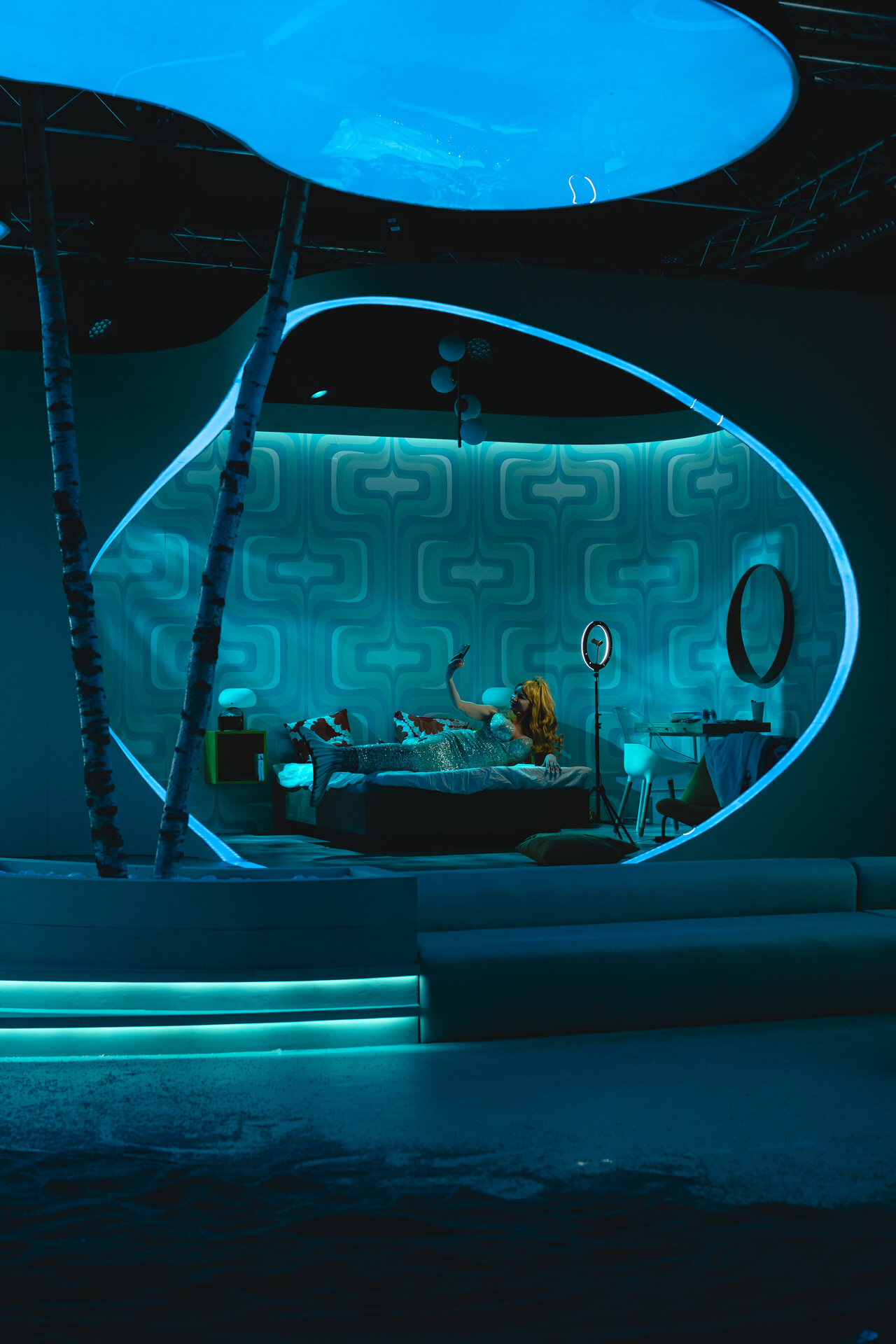 Structura e fragmentată prin ferestre circulare de mari dimensiuni, care deschid perspective către camere paralele – zone de intimitate, de socializare sau de joc –, asemenea unor capsule de realitate coexistente. Texturile grafice retro din tapet și mobilier dialoghează cu proiecțiile video și cu un sistem de lumini LED care transformă permanent spațiul: albastrul marin melancolic, rozurile și violeturile neon, nuanțele acvatice filtrate, fiecare marcând schimbarea de stare și registru dramatic.