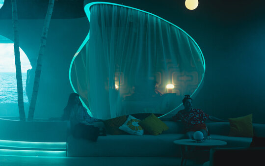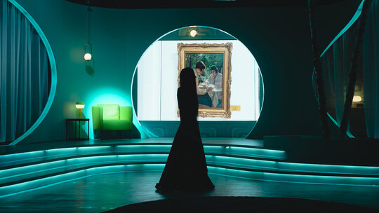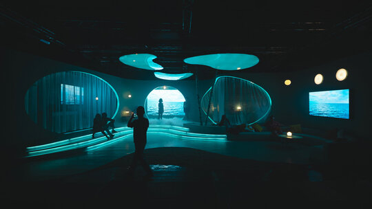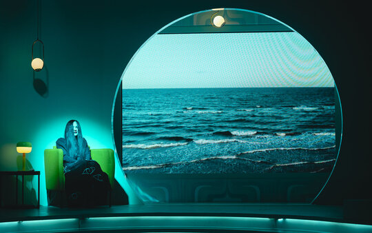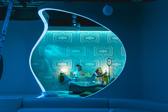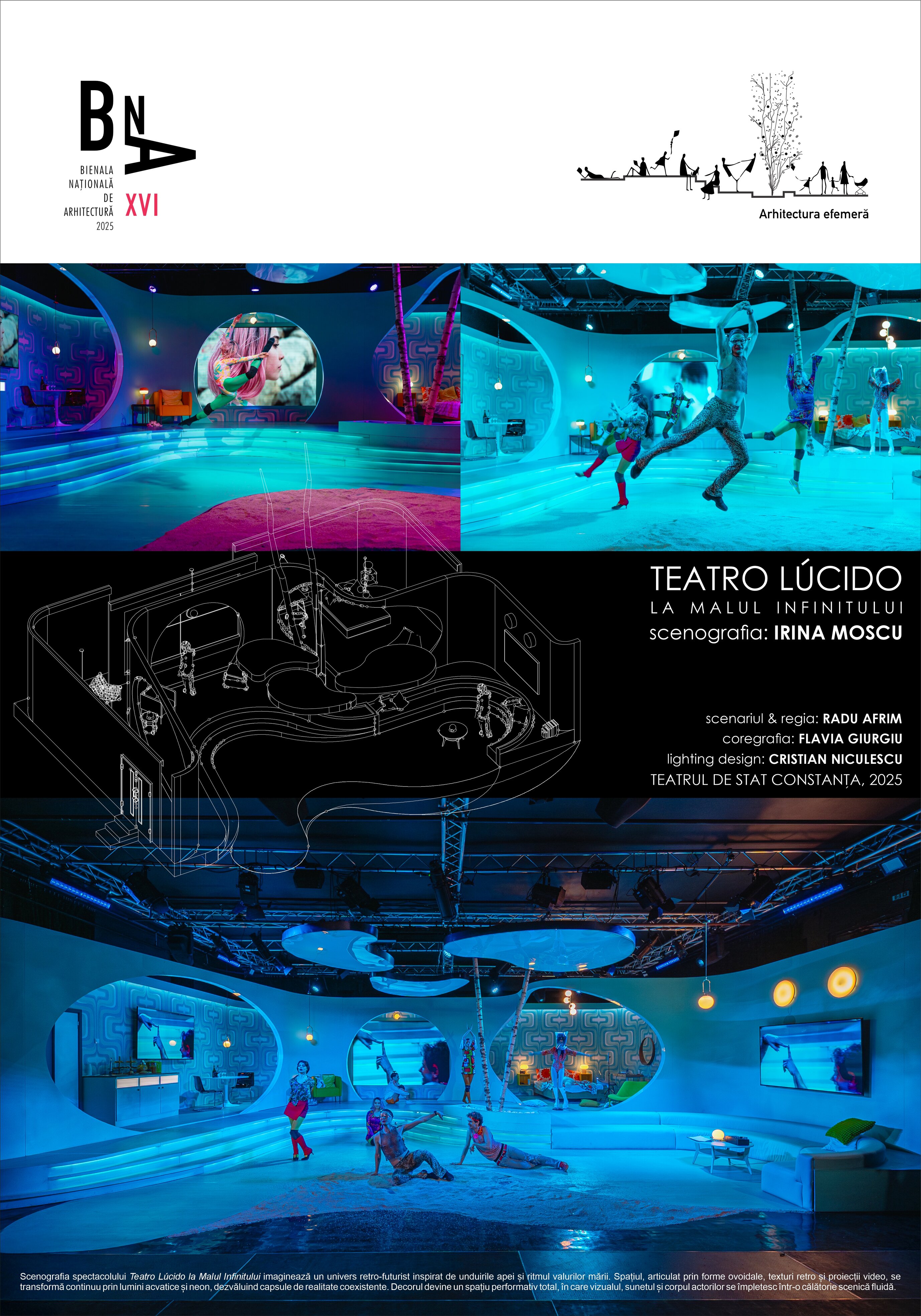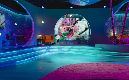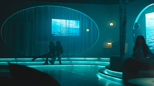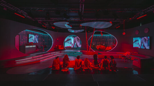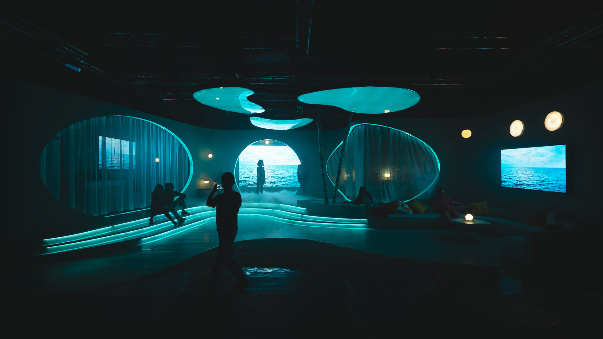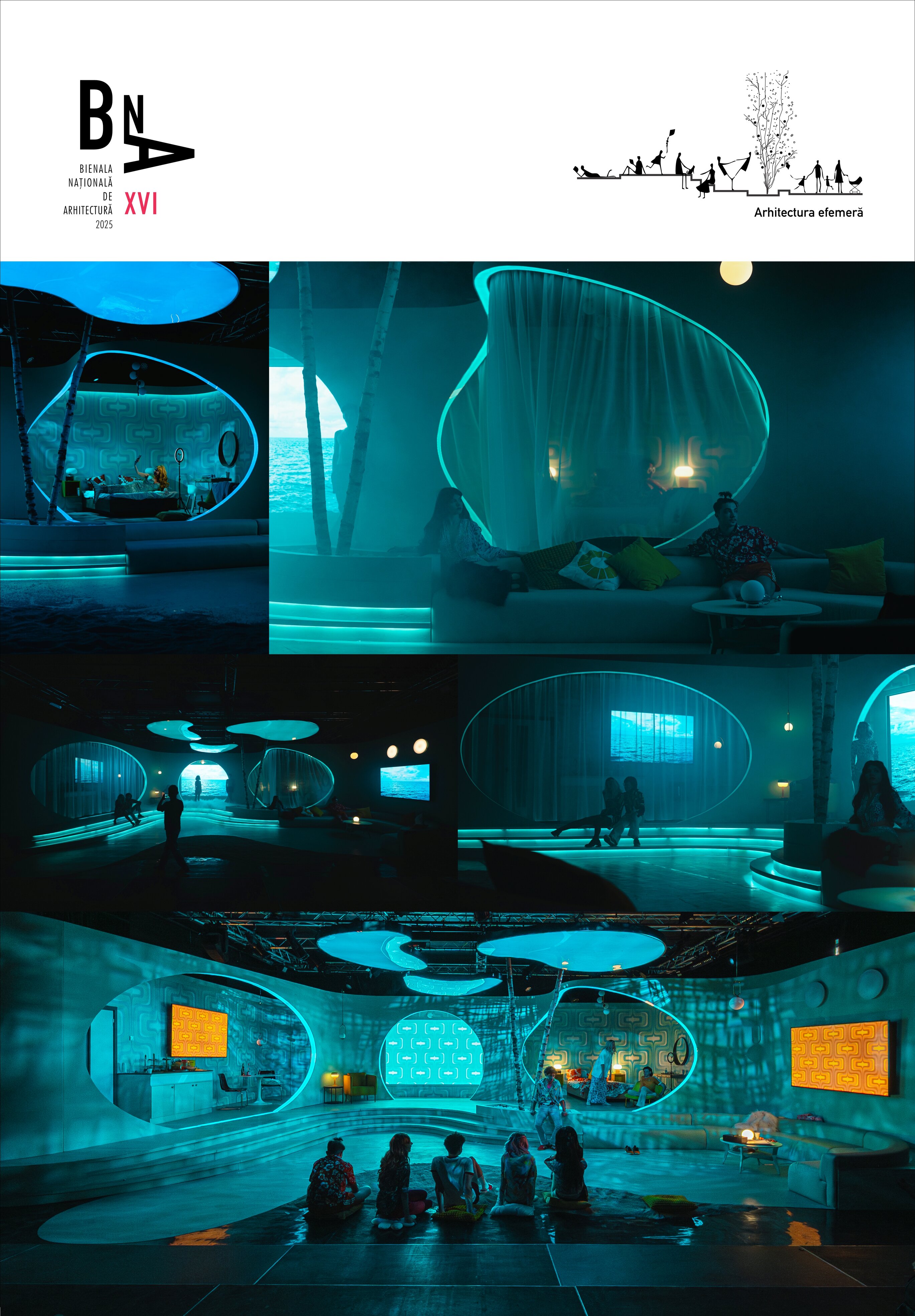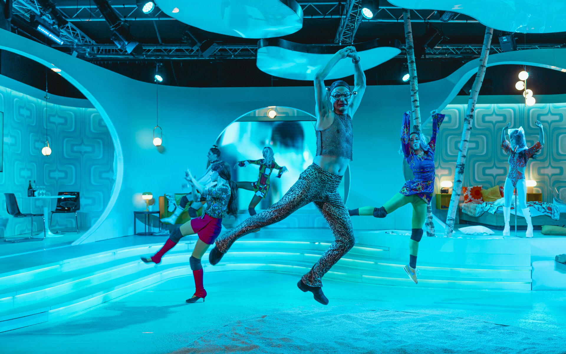 Structura e fragmentată prin ferestre circulare de mari dimensiuni, care deschid perspective către camere paralele – zone de intimitate, de socializare sau de joc –, asemenea unor capsule de realitate coexistente. Texturile grafice retro din tapet și mobilier dialoghează cu proiecțiile video și cu un sistem de lumini LED care transformă permanent spațiul: albastrul marin melancolic, rozurile și violeturile neon, nuanțele acvatice filtrate, fiecare marcând schimbarea de stare și registru dramatic.