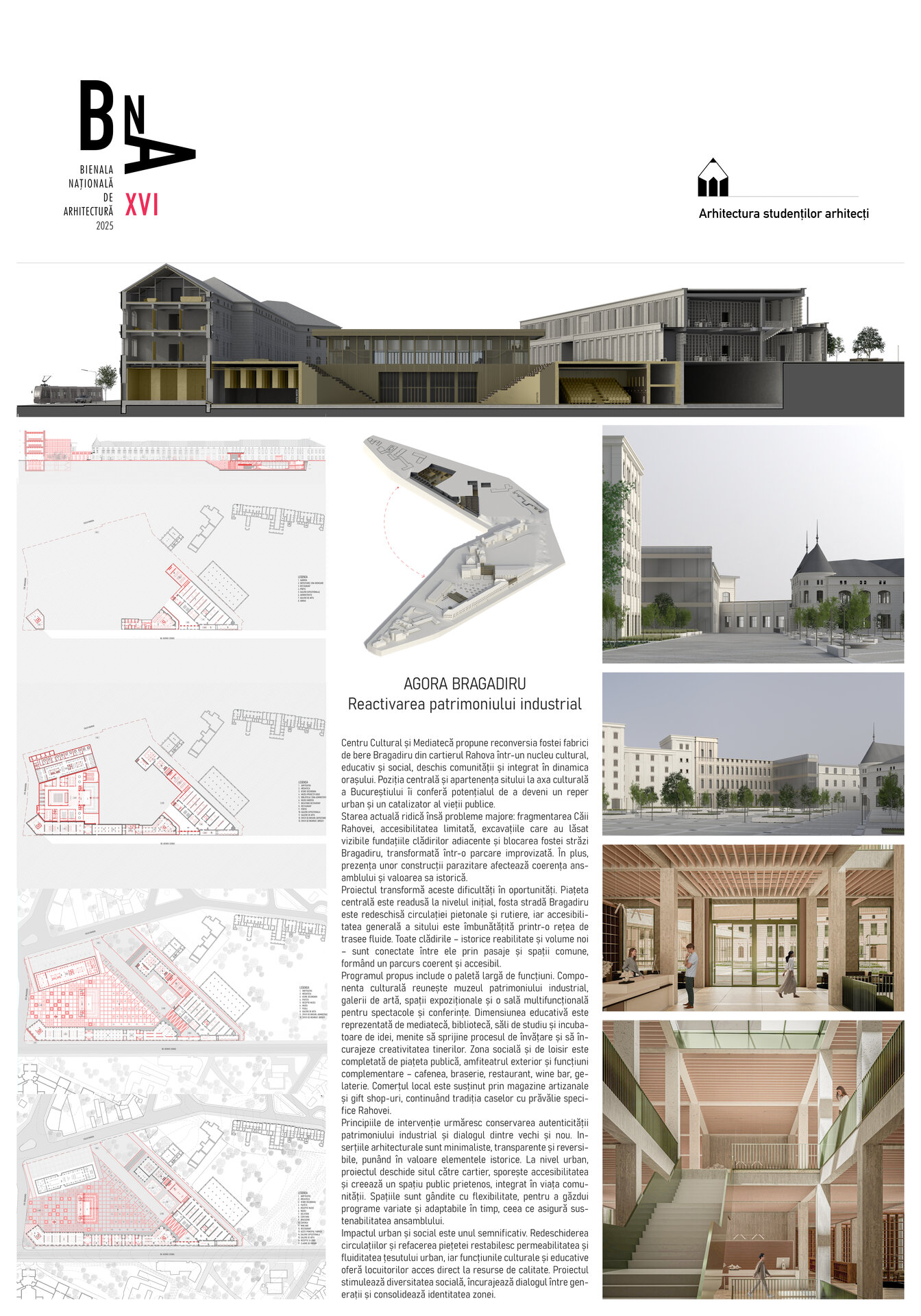 Centru Cultural și Mediatecă este un proiect de reconversie urbană și culturală ce readuce la viață fosta fabrică de bere Bragadiru din cartierul Rahova. Intervenția propune transformarea acestui sit industrial abandonat într-un nucleu public, cultural și educativ, deschis comunității și integrat în dinamica orașului contemporan. Poziția centrală a sitului și apartenența sa la axa culturală a Bucureștiului îl fac un loc ideal pentru un nou reper urban, capabil să atragă atât locuitorii cartierului, cât și vizitatori din întreaga capitală.