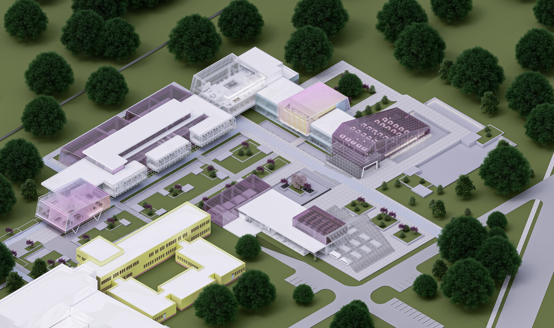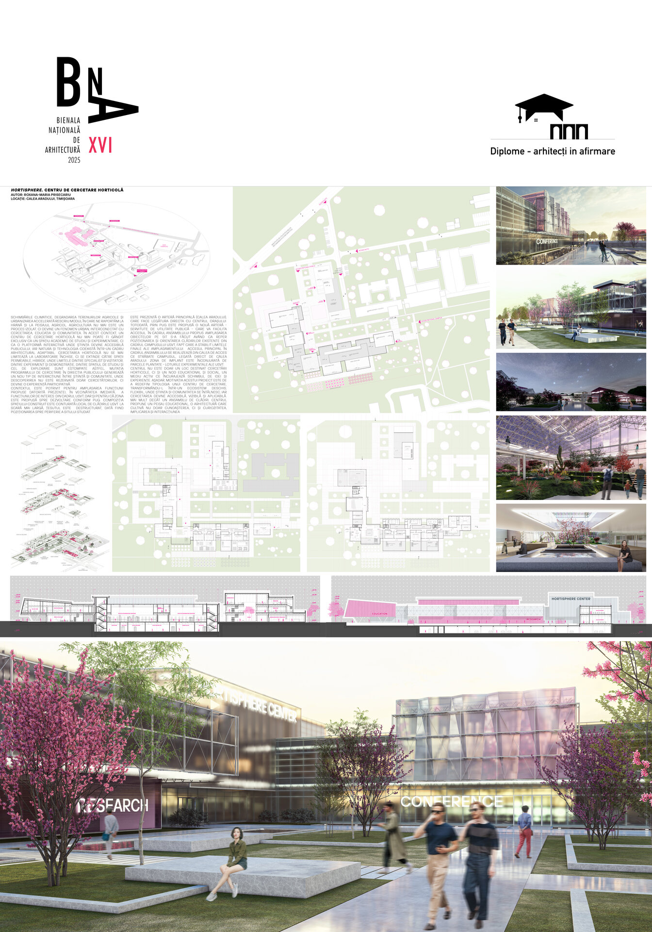 RO. Schimbările climatice, degradarea terenurilor agricole și urbanizarea accelerată rescriu modul în care ne raportăm la hrană și la peisajul agricol. Agricultura nu mai este un proces izolat, ci devine un fenomen urban, interconectat cu cercetarea, educația și comunitatea. În acest context, un Centru de Cercetare Horticolă nu mai poate fi gândit exclusiv ca un spațiu academic de studiu și experimentare, ci ca o platformă interactivă unde știința devine accesibilă publicului, iar natura și tehnologia coexistă într-un cadru arhitectural adaptabil. Cercetarea horticolă nu se mai limitează la laboratoare închise, ci se extinde către spații permeabile, hibride, unde limitele dintre specialist și vizitator, dintre experiment și demonstrație, dintre spațiul de studiu și cel de explorare sunt estompate. Astfel, mutația programului de cercetare în direcția publicului generează un nou tip de interacțiune între știință și comunitate, unde descoperirea nu este rezervată doar cercetătorilor, ci devine o experiență participativă.