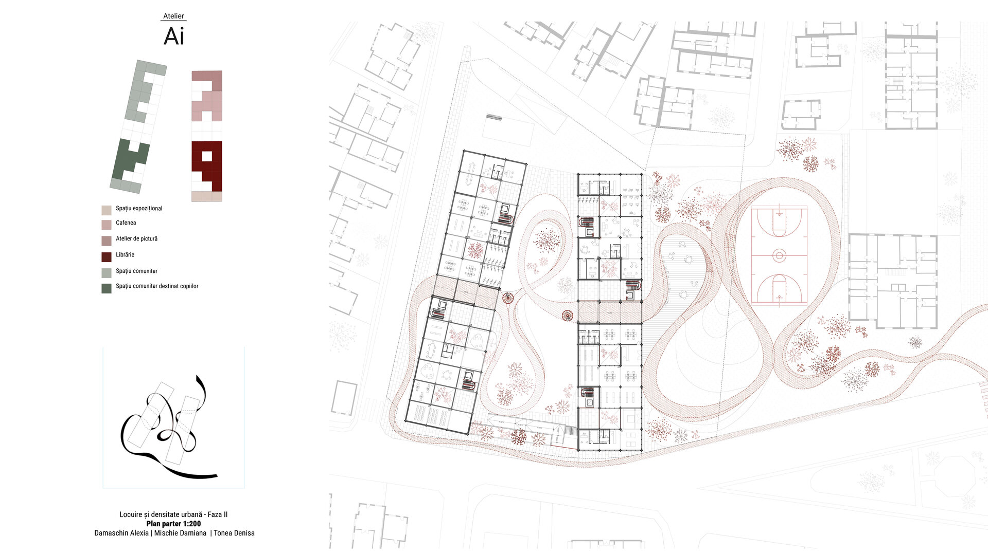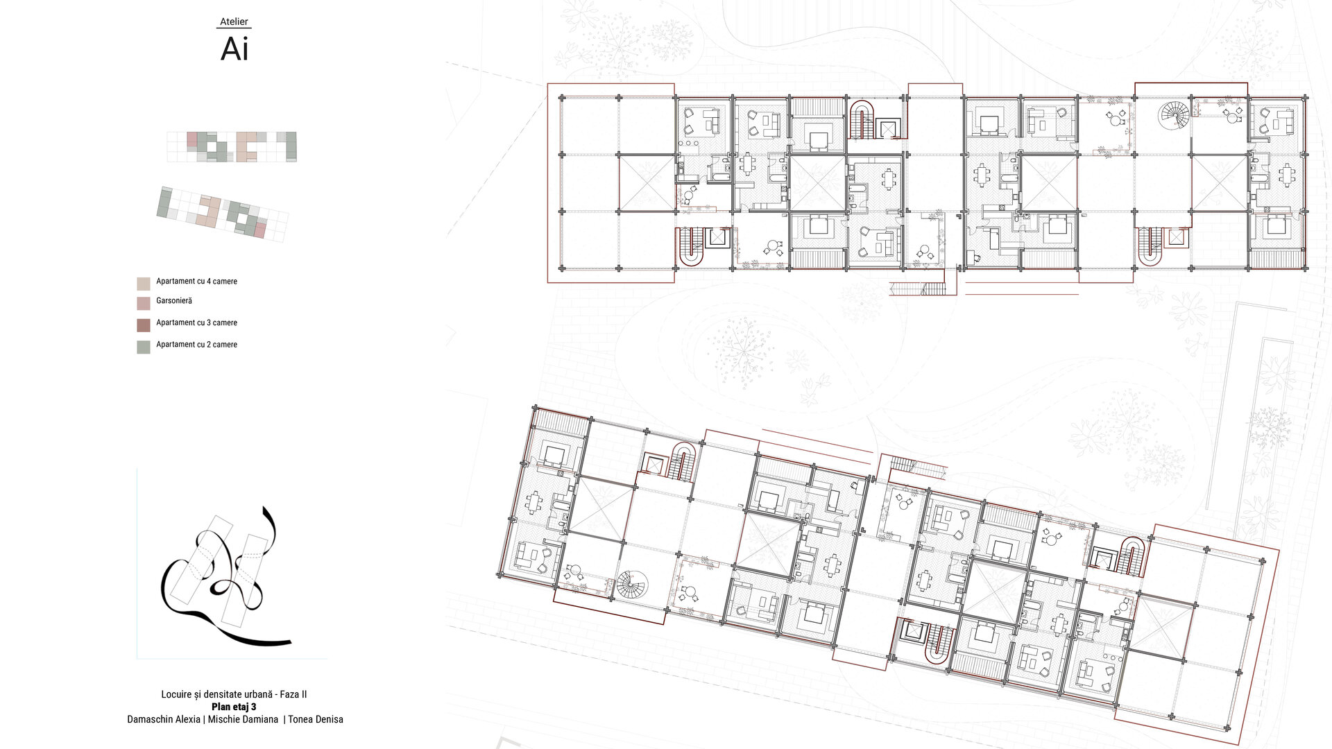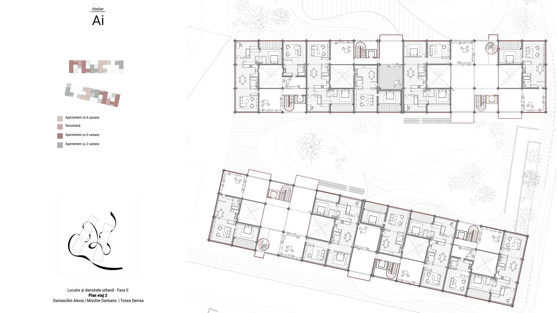 Între aceste două lumi există o frontieră nevăzută, o ruptură în peisajul urban. Străzile caselor se pierd brusc în fața zidurilor masive ale blocurilor, iar dialogul dintre ele lipsește. Această situație, deși problematică, oferă și o oportunitate. Proiectul nostru se plasează exact la granița dintre aceste tipologii, asumându-și rolul de mediator. Am preluat axele de poziționare de la blocurile existente, pentru a menține o continuitate urbană, dar am lăsat volumele apartamentelor să se dispună liber, imitând fragmentarea și diversitatea fronturilor caselor. Astfel, fațada nu este un zid rigid, ci un peisaj care respiră, în care panglica noastră se poate strecura, creând legături vizuale și spațiale. Relația dintre spațiul public și cel comunitar a fost tratată cu o atenție specială. În loc să recurgem la garduri sau bariere vizibile, am ales să marcăm trecerea dintre aceste două lumi prin diferențe subtile de nivel și prin gradări de intimitate. La intrarea în ansamblu, vizitatorii întâlnesc un parc public, un spațiu deschis și prietenos, care invită la relaxare și interacțiune. Pe măsură ce pătrunzi mai adânc, spațiul devine mai protejat, mai intim, până când ajungi în curtea interioară, rezervată locatarilor. Această tranziție este fluidă, naturală, evitând „duritatea” separațiilor clasice. Spațiul comunitar devine astfel o extensie firească a spațiului public, iar locuitorii nu se simt izolați, ci parte a unei rețele mai mari.