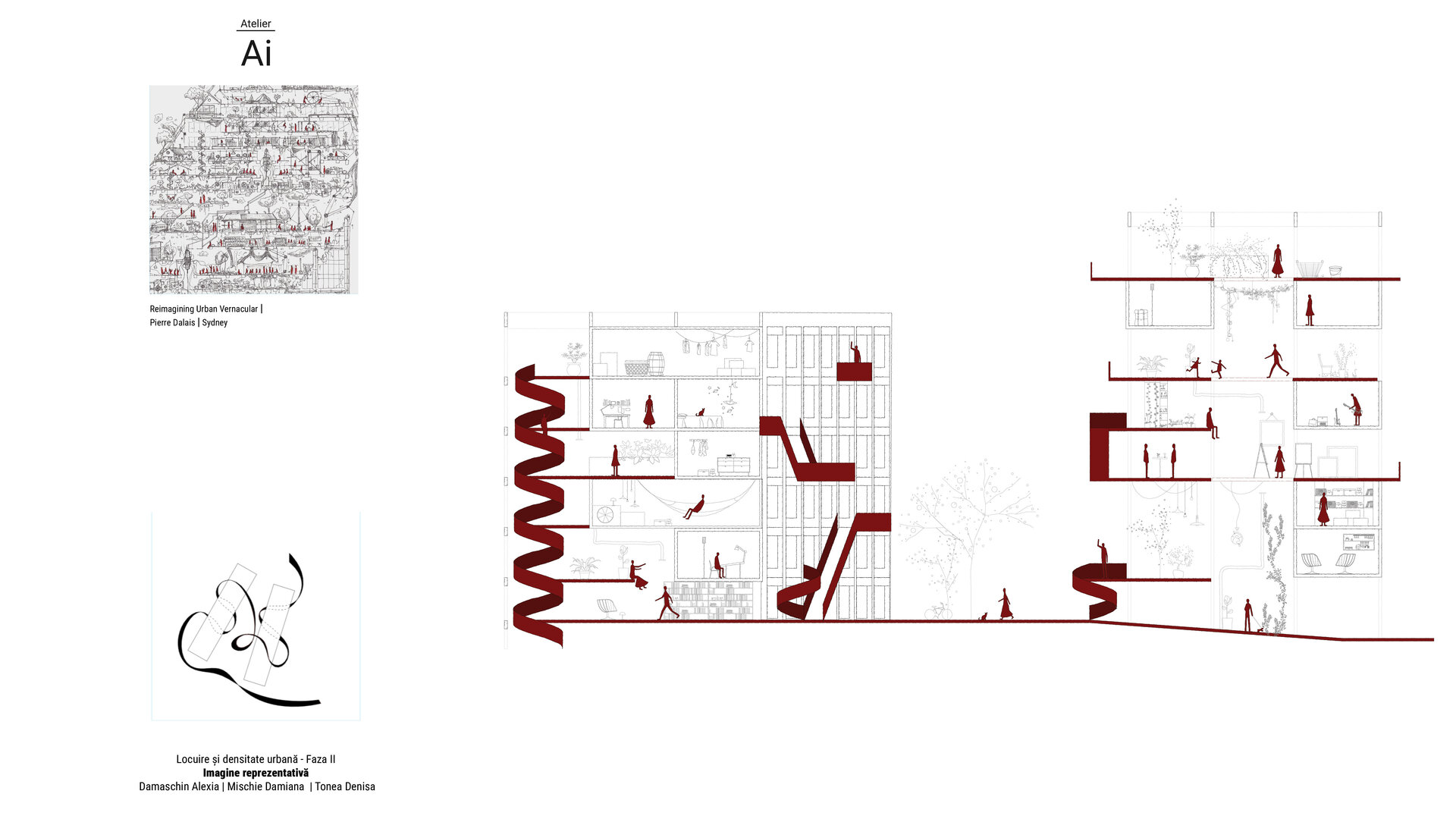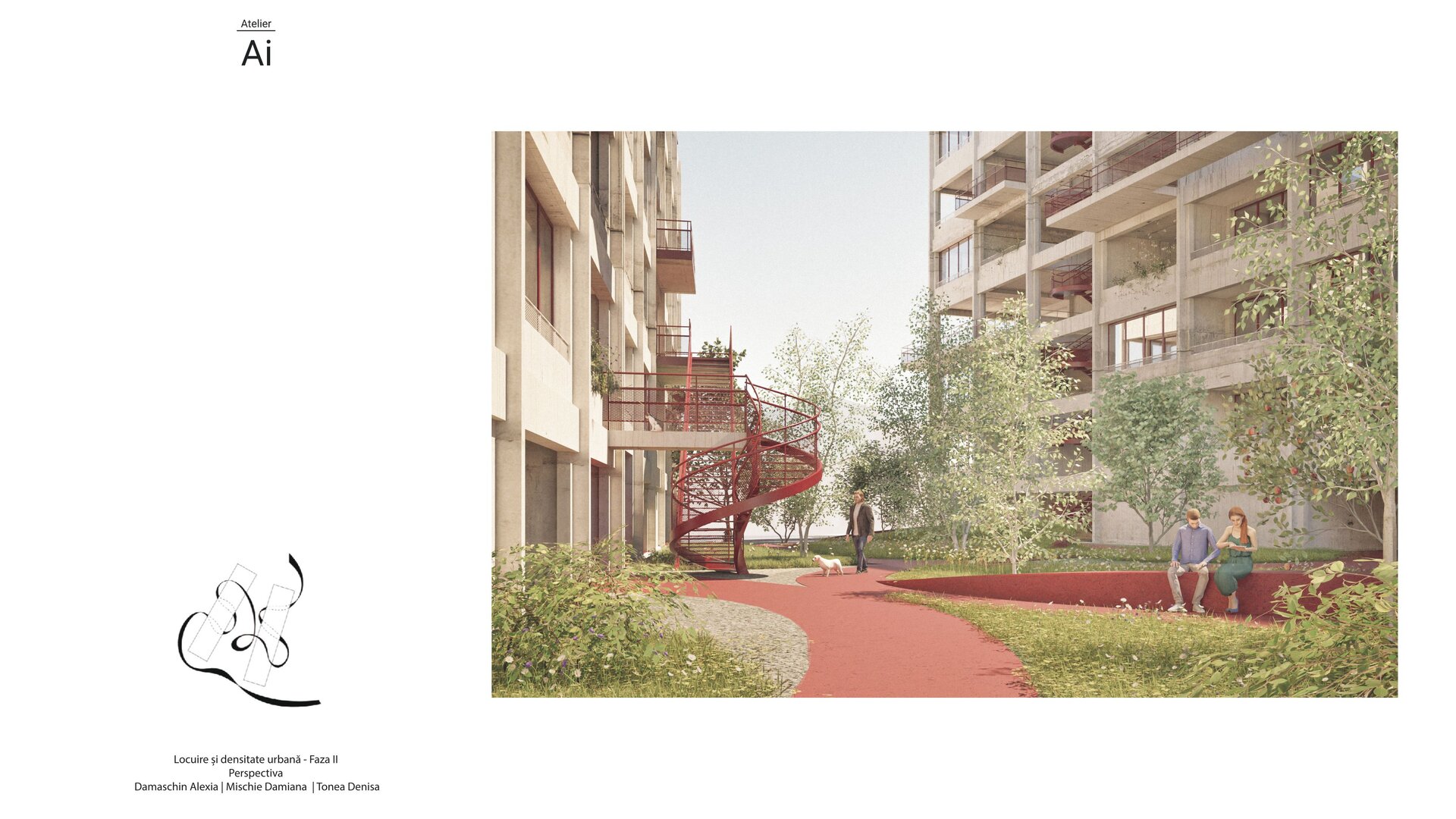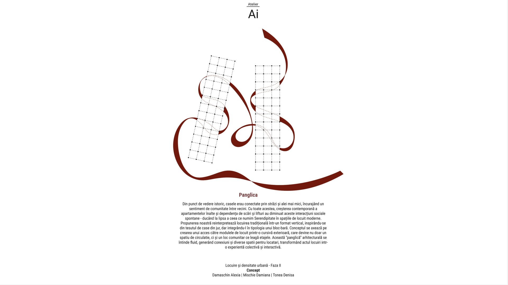 Această lipsă de serendipitate se simte cel mai acut în locuințele colective contemporane. Scările, lifturile și holurile înguste sunt spații de tranziție, nu de întâlnire. În loc să creeze contexte pentru dialog și comunitate, ele funcționează ca simple mecanisme de circulație, menite să ducă oamenii din punctul A în punctul B cât mai rapid și mai eficient. În acest proces, arhitectura și-a pierdut rolul de mediator social. Blocurile înalte au devenit simple depozite de apartamente, în care fiecare locuitor se retrage în propriul său univers, izolat de ceilalți. Orașul a devenit un puzzle de vieți paralele, lipsite de legături vizibile. Proiectul pe care îl propunem pornește de la această problemă profundă și propune o reîntoarcere la ideea de comunitate, dar într-o formă adaptată prezentului. Dorim să readucem în locuirea colectivă acea calitate organică a străzii tradiționale, dar nu prin nostalgie, ci prin inovație. În loc să privim strada ca pe un element strict orizontal, am imaginat-o suspendată, integrată în verticalitatea unei clădiri contemporane. Am creat un concept care nu doar găzduiește oameni, ci creează contexte pentru interacțiune, întâmplare și viață comunitară.
