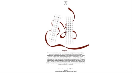 Această panglică nu este doar un coridor de circulație, ci un spațiu comunitar viu, care leagă etajele între ele și creează contexte pentru întâlniri neașteptate. Ea se strecoară printre volume, uneori vizibilă, alteori ascunsă, asemenea unei poteci care se lasă descoperită treptat. Cursiva, elementul central al panglicii, are o formă organică, liberă, care contrastează cu rigurozitatea structurală a blocului. Ea se apropie de curtea comună, apoi se retrage, oferind perspective diferite și surprinzătoare. Prin deschiderile atent plasate, lumina pătrunde pe panglică, iar exteriorul se insinuează în interior. Din punct de vedere simbolic, panglica este expresia vieții comunitare: un fir care leagă oamenii, care creează conexiuni invizibile, care transformă clădirea dintr-o sumă de apartamente într-un organism viu.