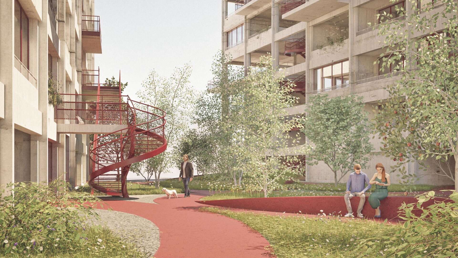 În contrast cu rigurozitatea grilei, panglica este un element liber, fluid, care se strecoară printre apartamente, uneori apropiindu-se de curtea interioară, alteori retrăgându-se către margini. Ea devine un traseu al întâmplării, al întâlnirii neașteptate. Pe panglică, oamenii nu doar se deplasează, ci trăiesc momente împreună: un salut scurt, o discuție spontană, un joc improvizat al copiilor. Panglica este, în acest sens, expresia vieții comunitare, o stradă verticală unde se nasc relații și povești. Curțile interioare joacă un rol esențial în acest ansamblu, ele aduc lumină și aer în profunzimea clădirii, dar și creează locuri de întâlnire. În jurul lor, bucătăriile sunt orientate strategic, astfel încât activitățile zilnice să se conecteze cu viața comunității. Curțile devin spații vii, animate de zgomote cotidiene: râsul copiilor, mirosul de pâine caldă, discuțiile vecinilor. În același timp, ele ajută la orientarea locatarilor, oferind repere vizuale și senzoriale. Prin aceste curți, ansamblul respiră, iar locuințele devin mai sănătoase, mai luminoase și mai conectate.
