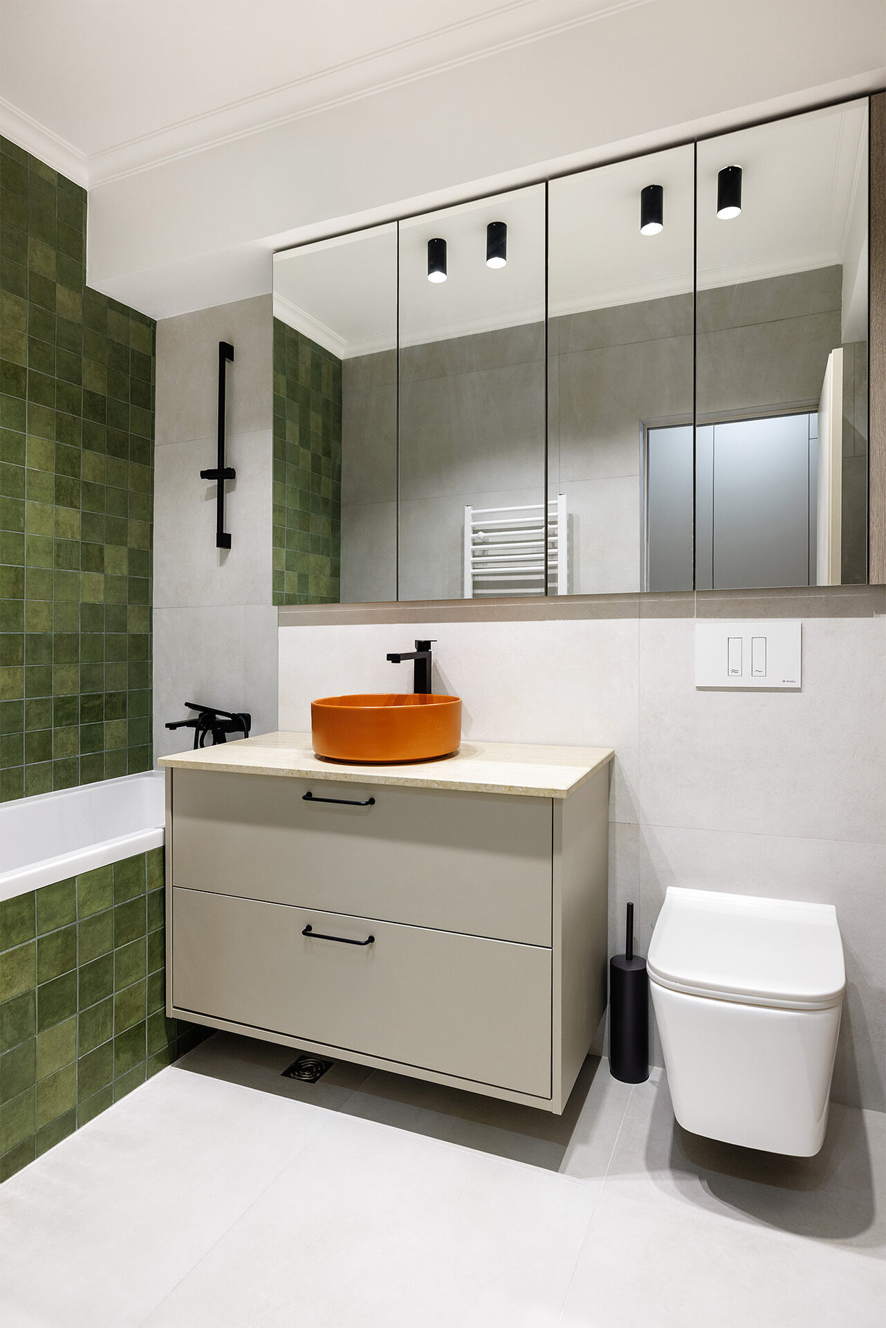 În baie, placările cu oglindă de deasupra rezervorului geberit și din living sunt atât estetice, cât și funcționale, ele contribuie la dilatarea percepției spațiului, mai ales într-o cameră cu suprafață limitată și lumină naturală redusă.
