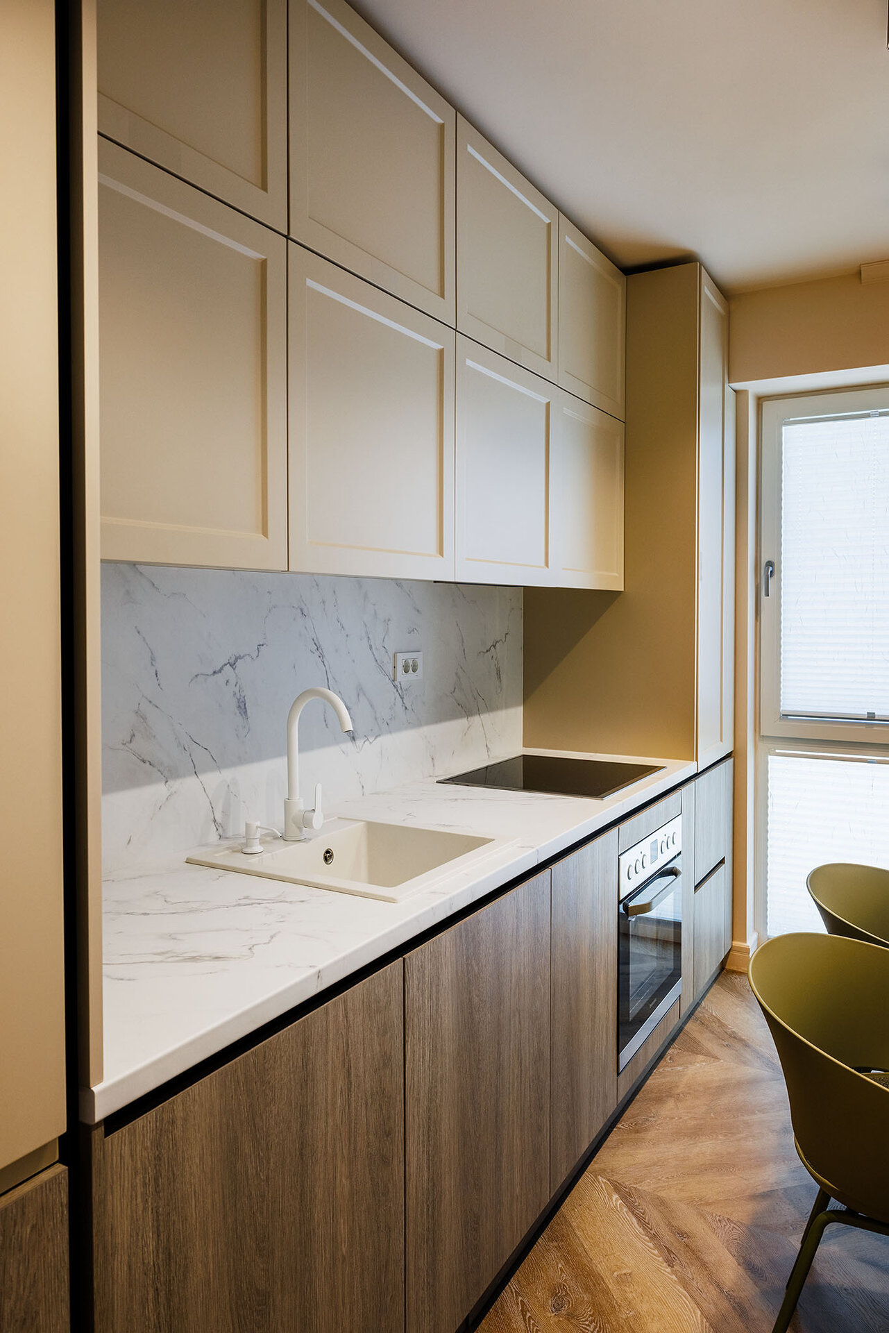 Direcția de design a fost definită printr-o paletă caldă de nuanțe de bej, accente de verde și o canapea portocalie, element statement al zonei de zi. Atmosfera generală este una calmă, dar vibrantă prin contrastul cromatic subtil.