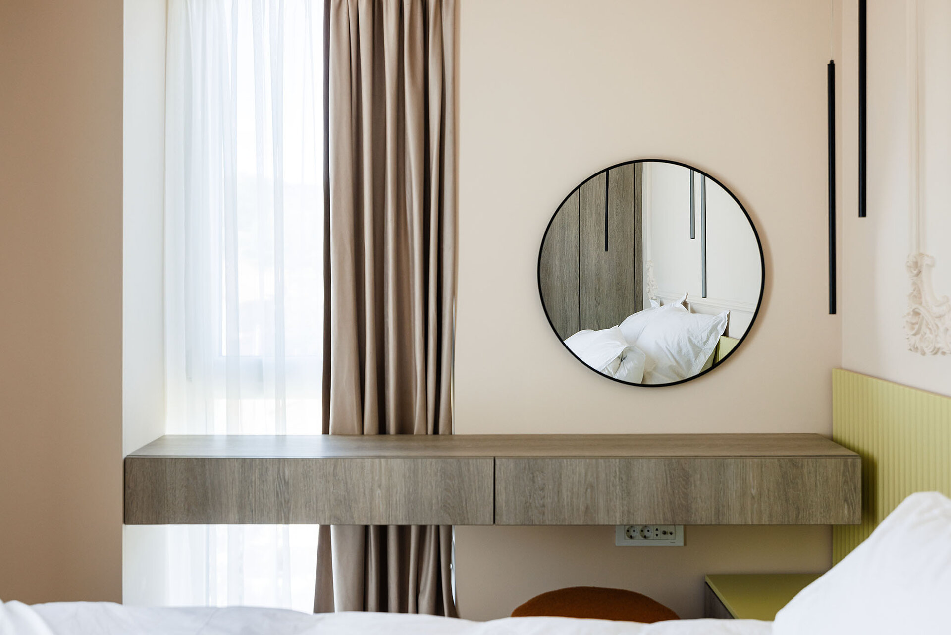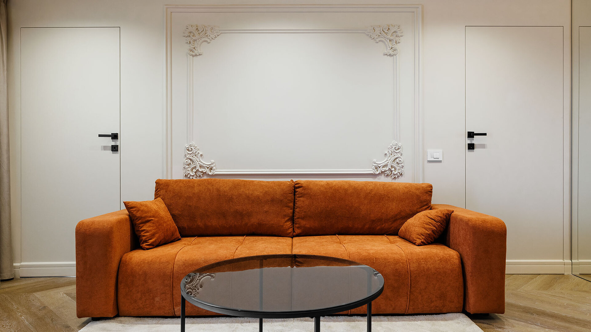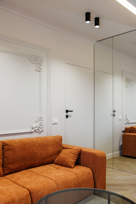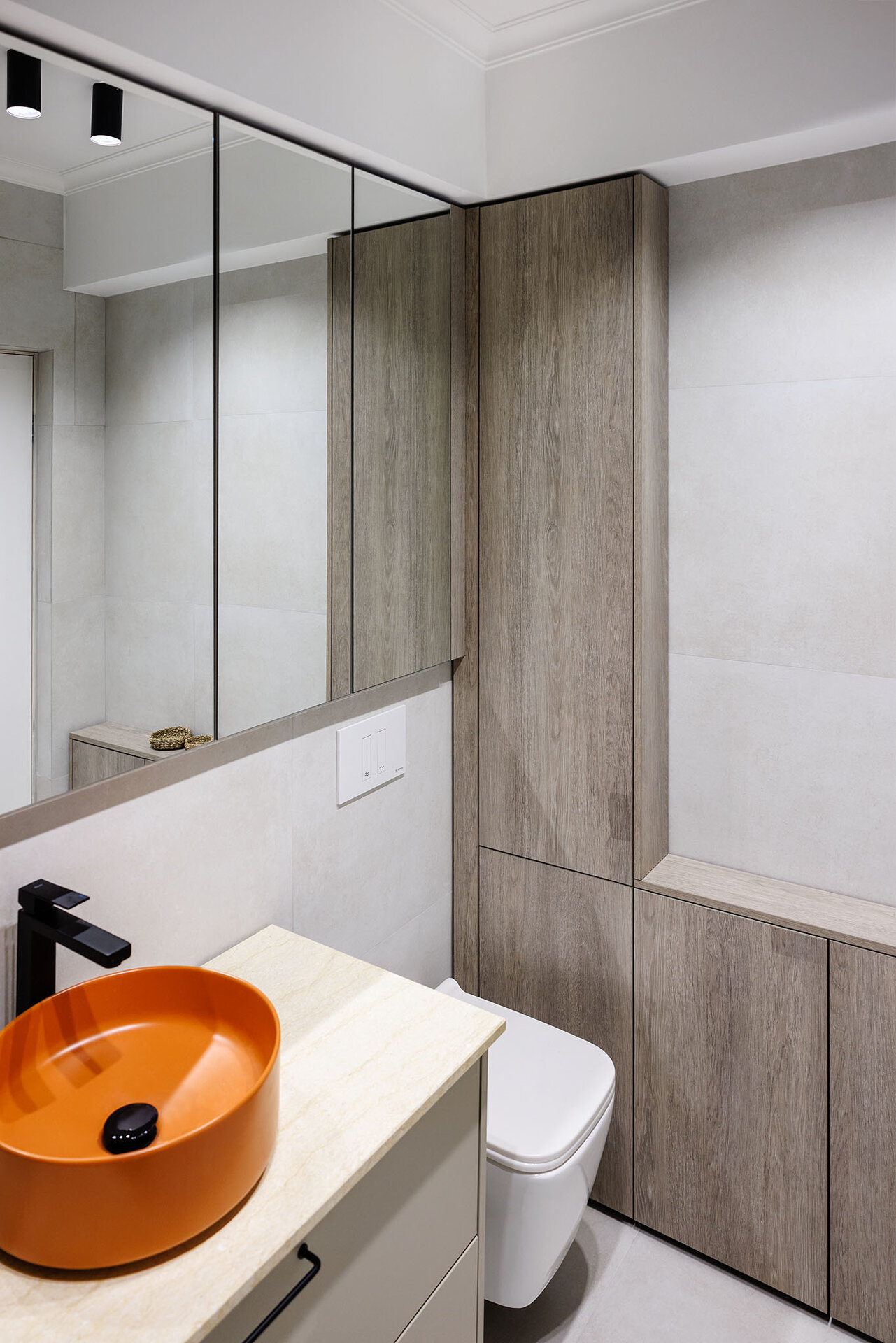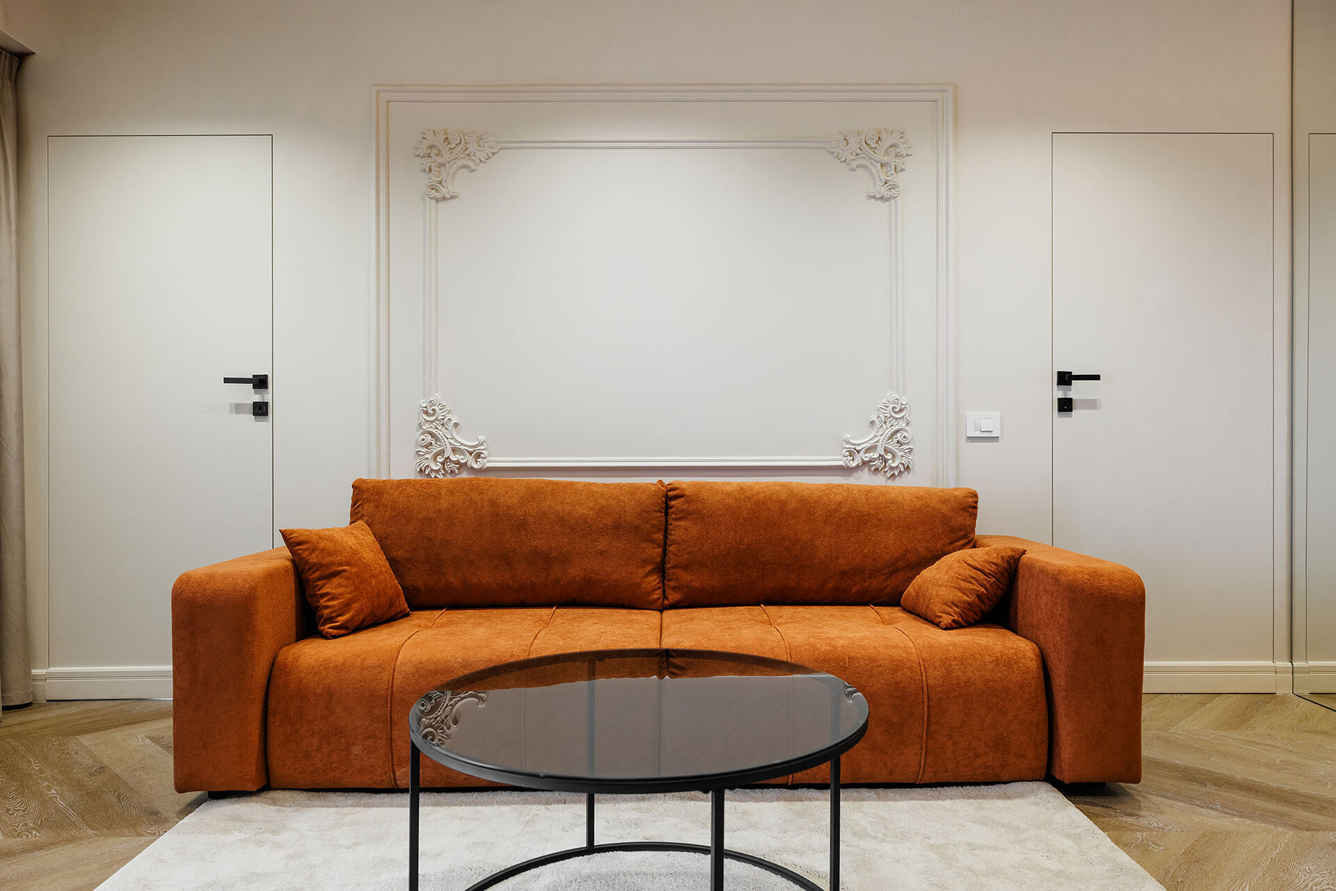 Selecția materialelor a fost ghidată de nevoia de durabilitate și integrare estetică. Am folosit PAL în nuanțe deschise, oglinzi pentru amplificarea senzației de spațiu, textile și finisaje mate. Canapeaua portocalie, element accentuat cromatic, este realizată dintr-o stofă texturată, intr-un ton cald, care creează contrast față de restul paletei neutre.