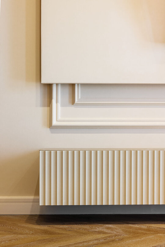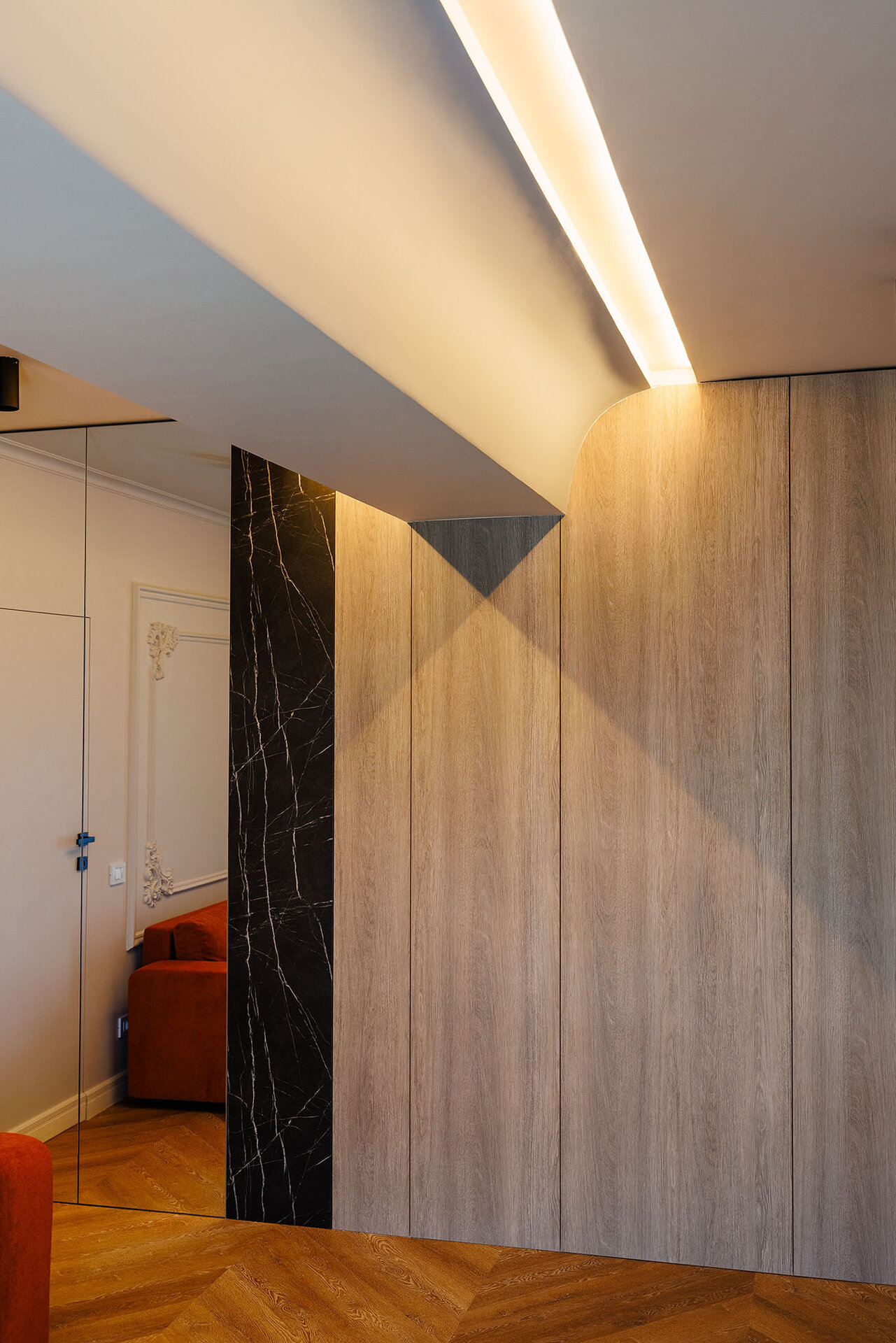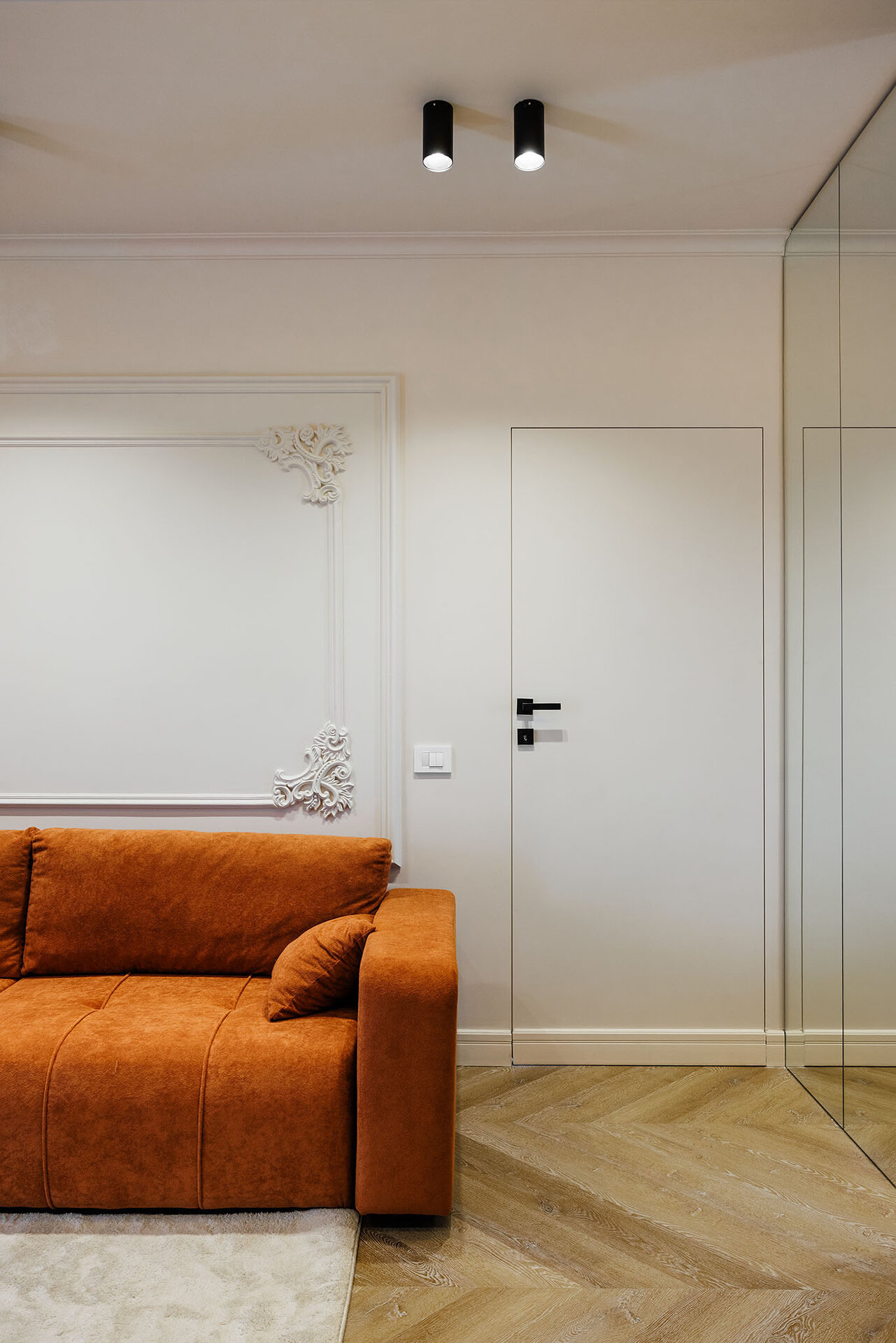 Poziția ușilor a fost tratată cu maximă atenție, întrucât distribuția către zona de noapte și bucătărie se face din living. Pentru a integra într-o manieră cât mai armonioasă aceste accese și a păstra coerența vizuală a peretelui comun, am optat pentru uși filomuro, care devin aproape imperceptibile.