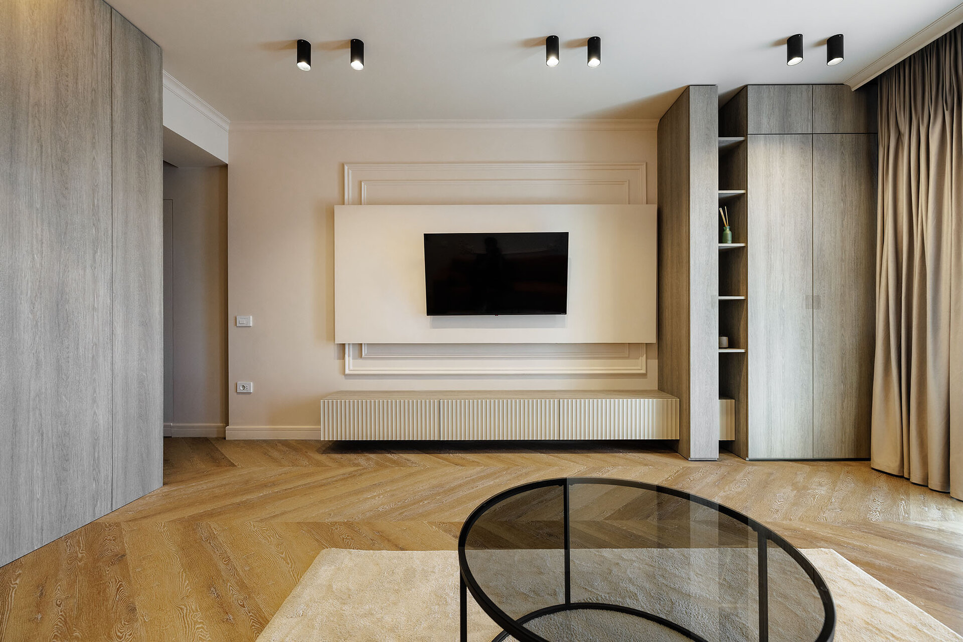 Zona media din living este, fără îndoială, elementul meu preferat din această amenajare. Aici am avut ocazia să îmbin elemente de inspirație clasică cu tehnologia contemporană, într-o compoziție care vorbește despre echilibru și atenție la detalii.