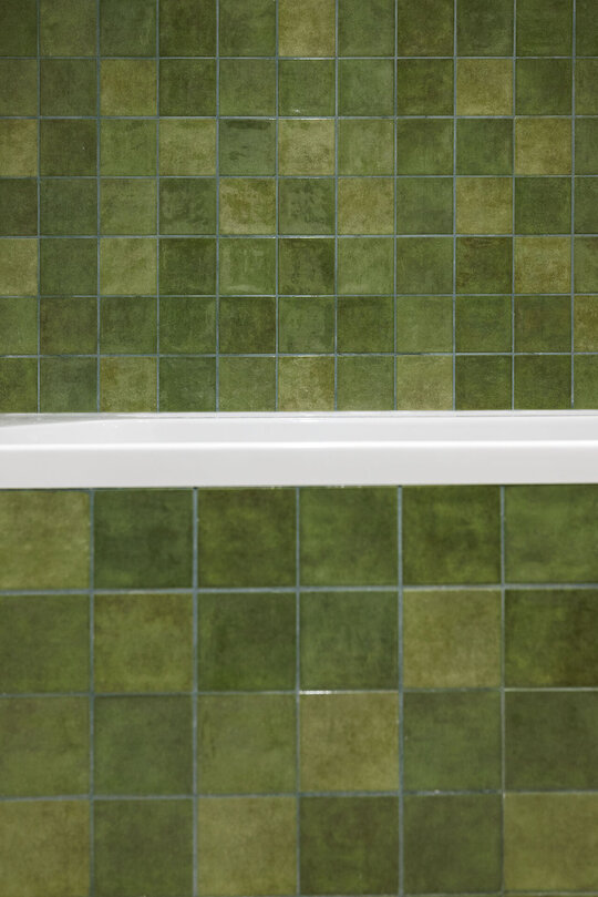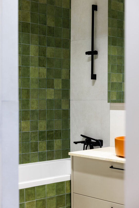 Baia valorifică toate locurile disponibile, cu spații de depozitare integrate în spatele ușii și deasupra rezervorului încastrat, ambele placate cu oglindă pentru a amplifica senzația de spațiu.