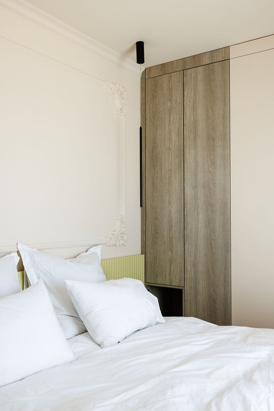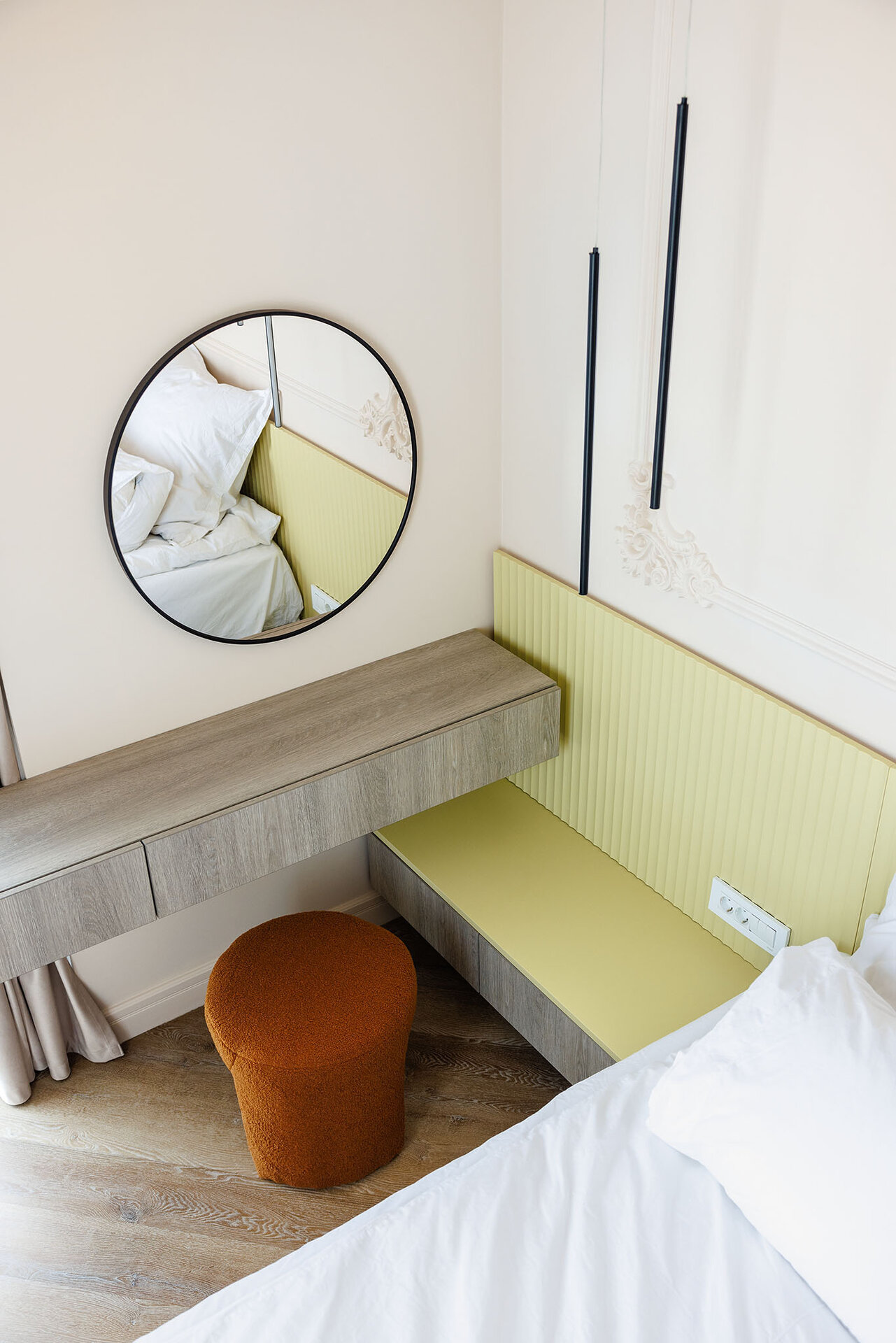 Cea mai complexă intervenție a fost amenajarea dormitorului. Pe lângă pat și dressing, a fost necesară integrarea unei zone de birou. Cea mai mare parte a mobilierului a fost realizat pe comanda, astfel încât noptierele să funcționeze ca elemente de tranziție între pat și spațiul de lucru, fără a fragmenta compoziția.