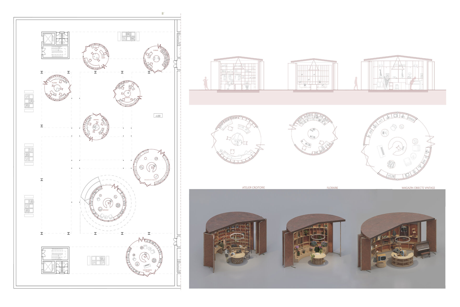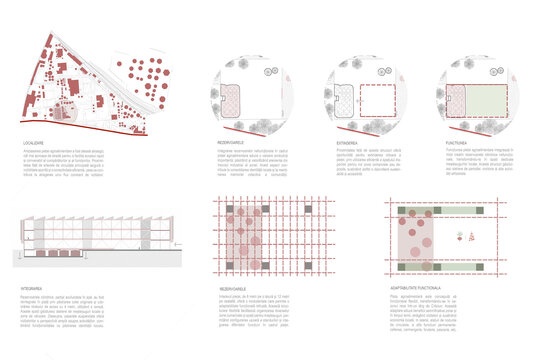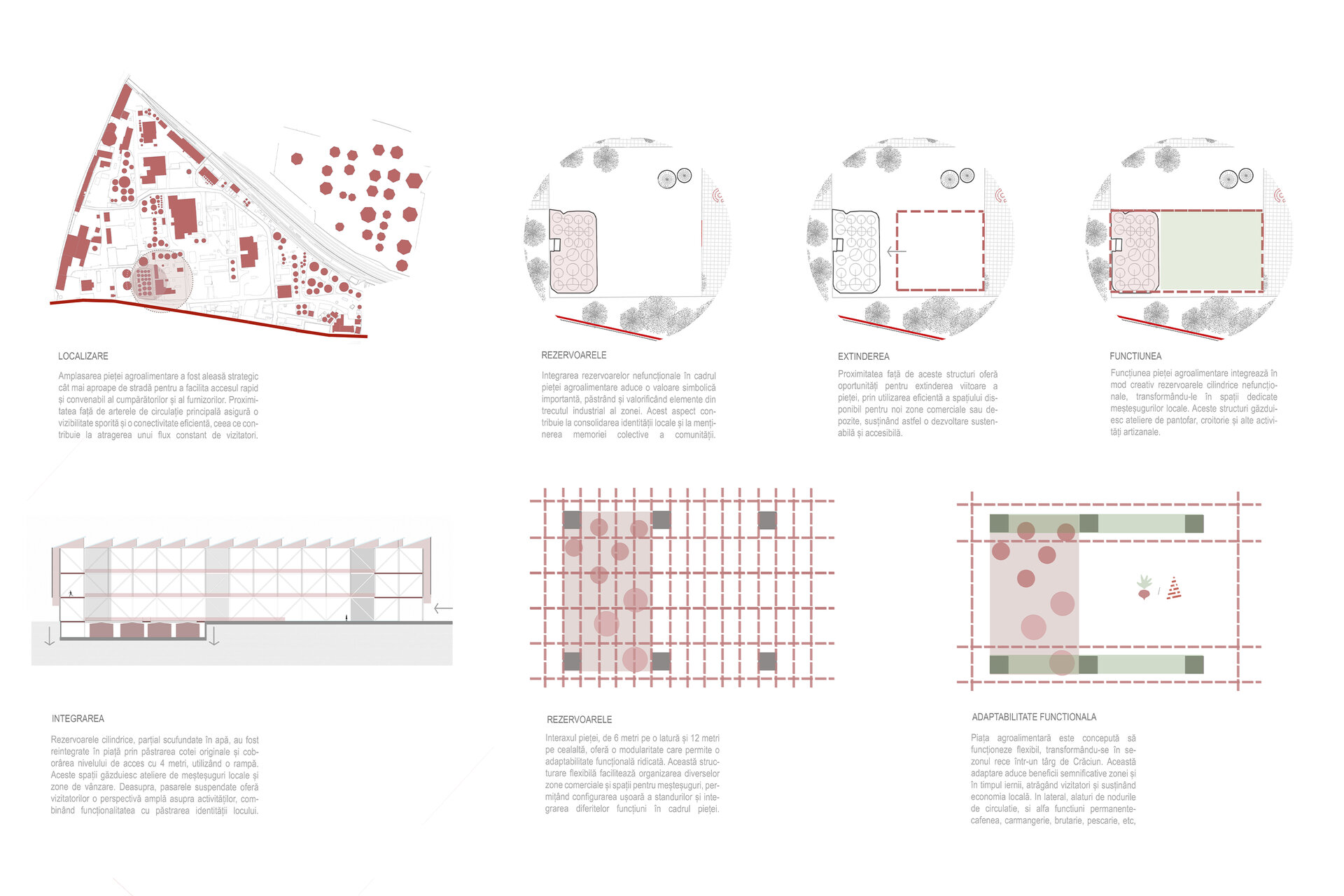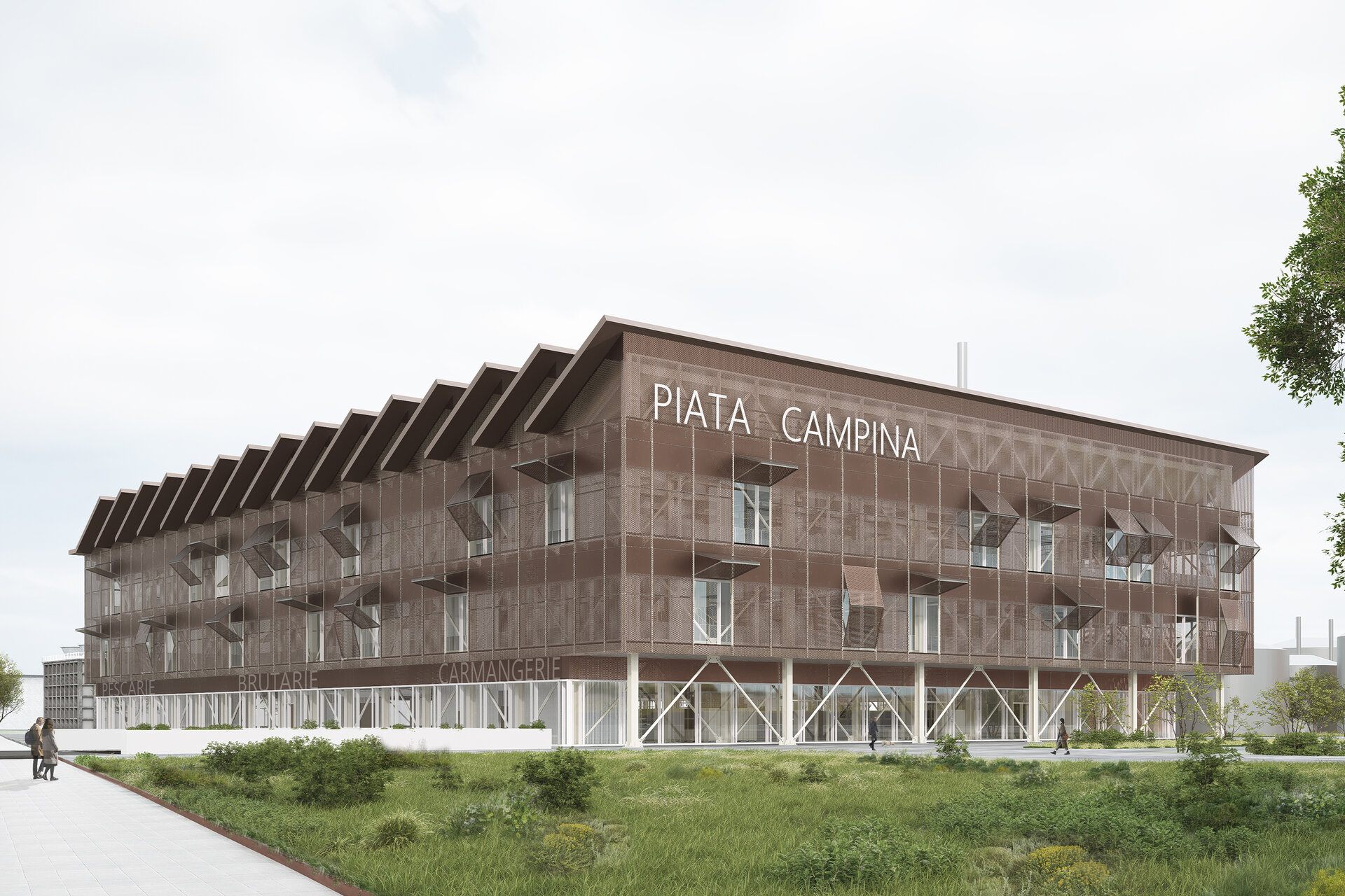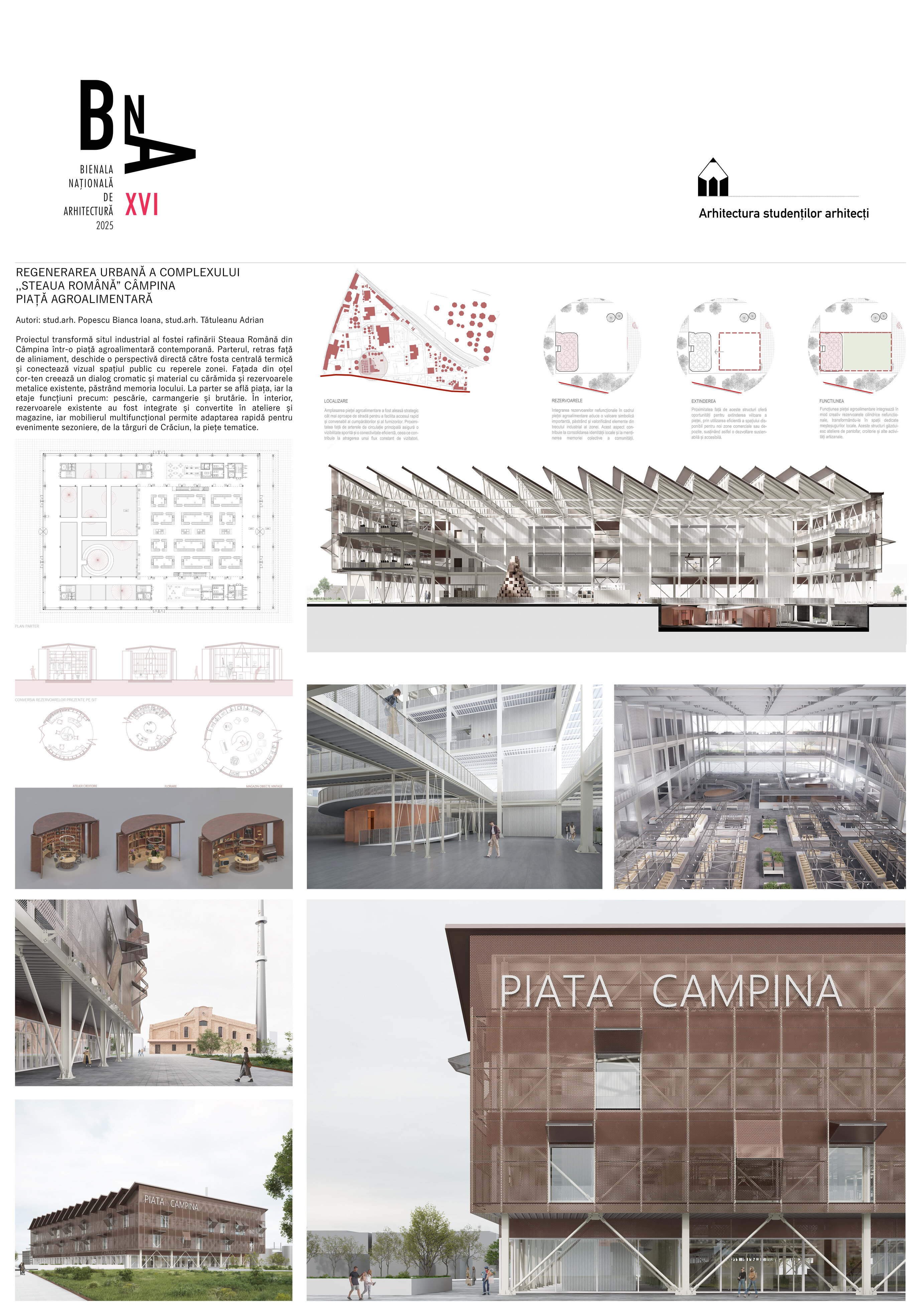 Proiectul transformă situl industrial al fostei rafinării Steaua Română din Câmpina într-o piață agroalimentară contemporană. Parterul, retras față de aliniament, deschide o perspectivă directă către fosta centrală termică și conectează vizual spațiul public cu reperele zonei. Fațada din oțel cor-ten creează un dialog cromatic și material cu cărămida și rezervoarele metalice existente, păstrând memoria locului. La parter se află piața, iar la etaje funcțiuni precum pescăria, carmangeria și brutăria. În interior, rezervoarele existente au fost integrate și convertite în ateliere și magazine, iar mobilierul multifuncțional permite adaptarea rapidă pentru evenimente sezoniere, de la târguri de Crăciun, la piețe tematice.