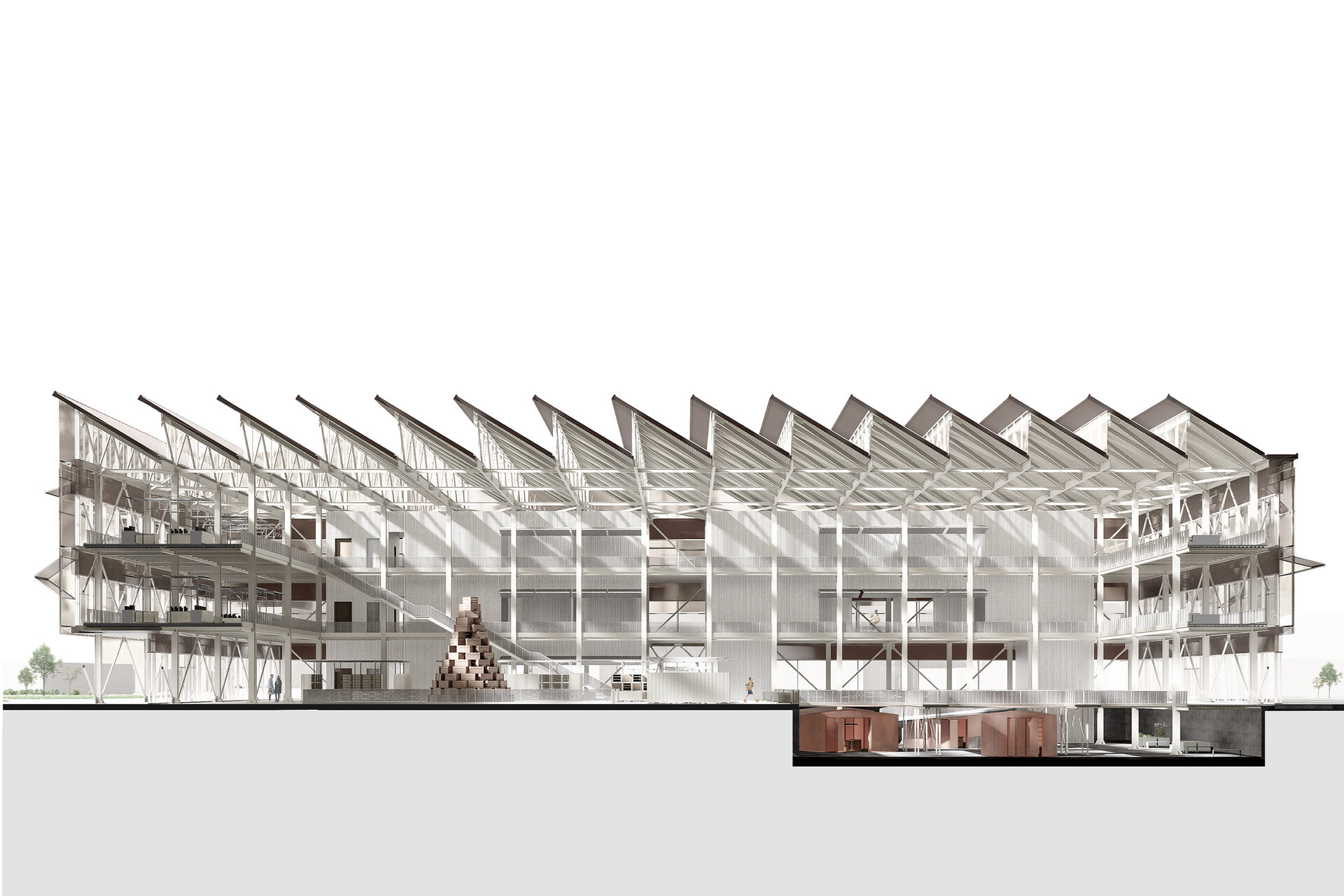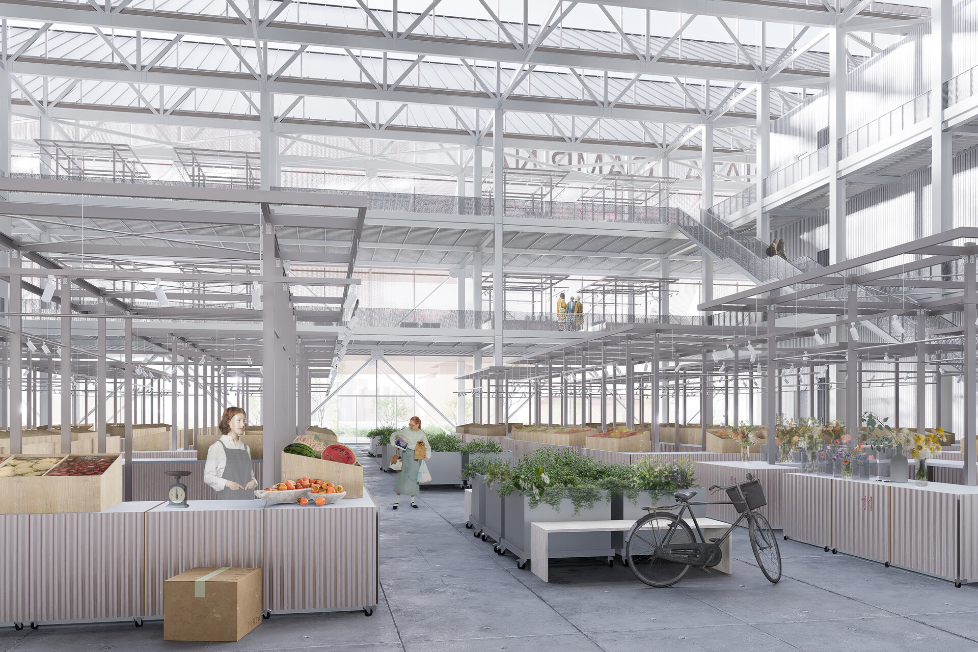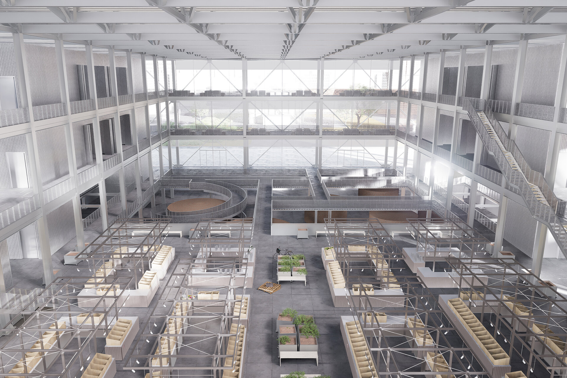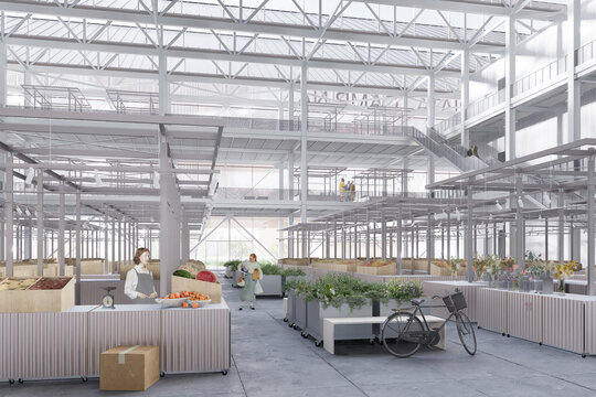 Spațiul pieței este gândit ca un loc deschis și flexibil, unde lumina naturală joacă un rol esențial. Acoperișul înclinat, alcătuit din module repetitive, funcționează ca un filtru al luminii și creează un ritm vizual puternic. Interiorul este organizat în jurul unei mari hale centrale, care permite vizibilitate și accesibilitate către toate zonele funcționale. Circulațiile sunt clare și eficiente, favorizând interacțiunea vizitatorilor și oferind multiple perspective asupra întregului ansamblu.