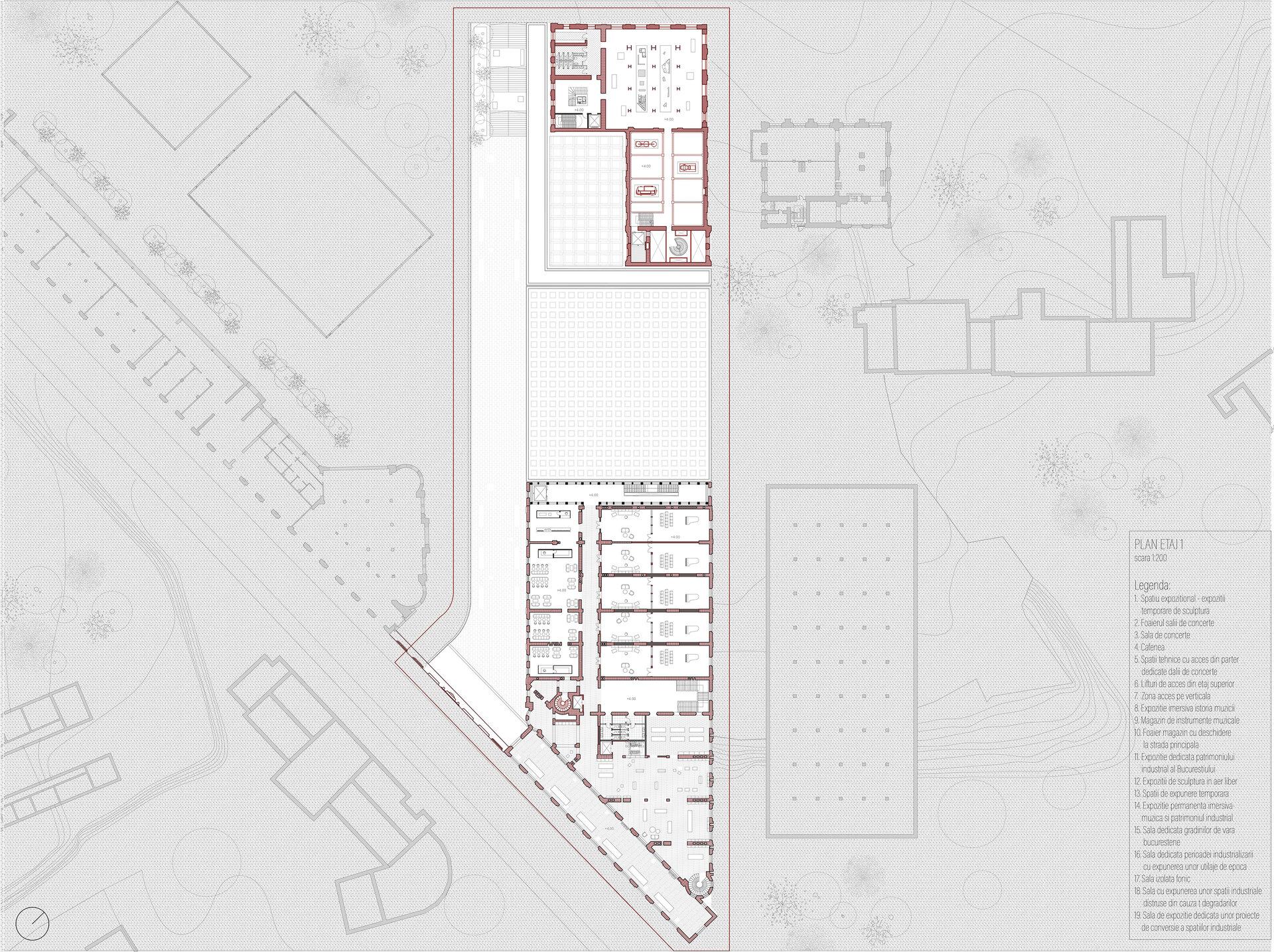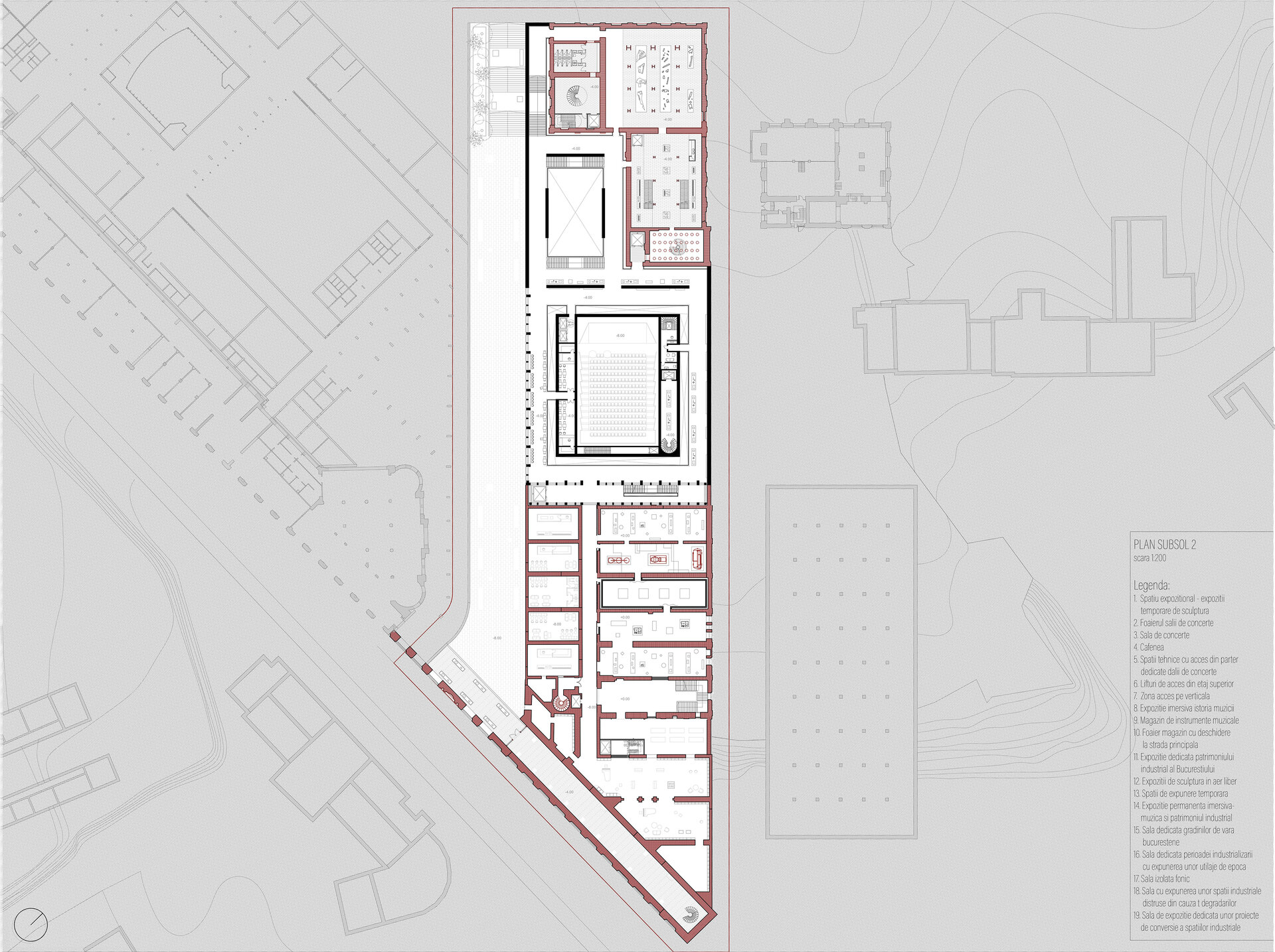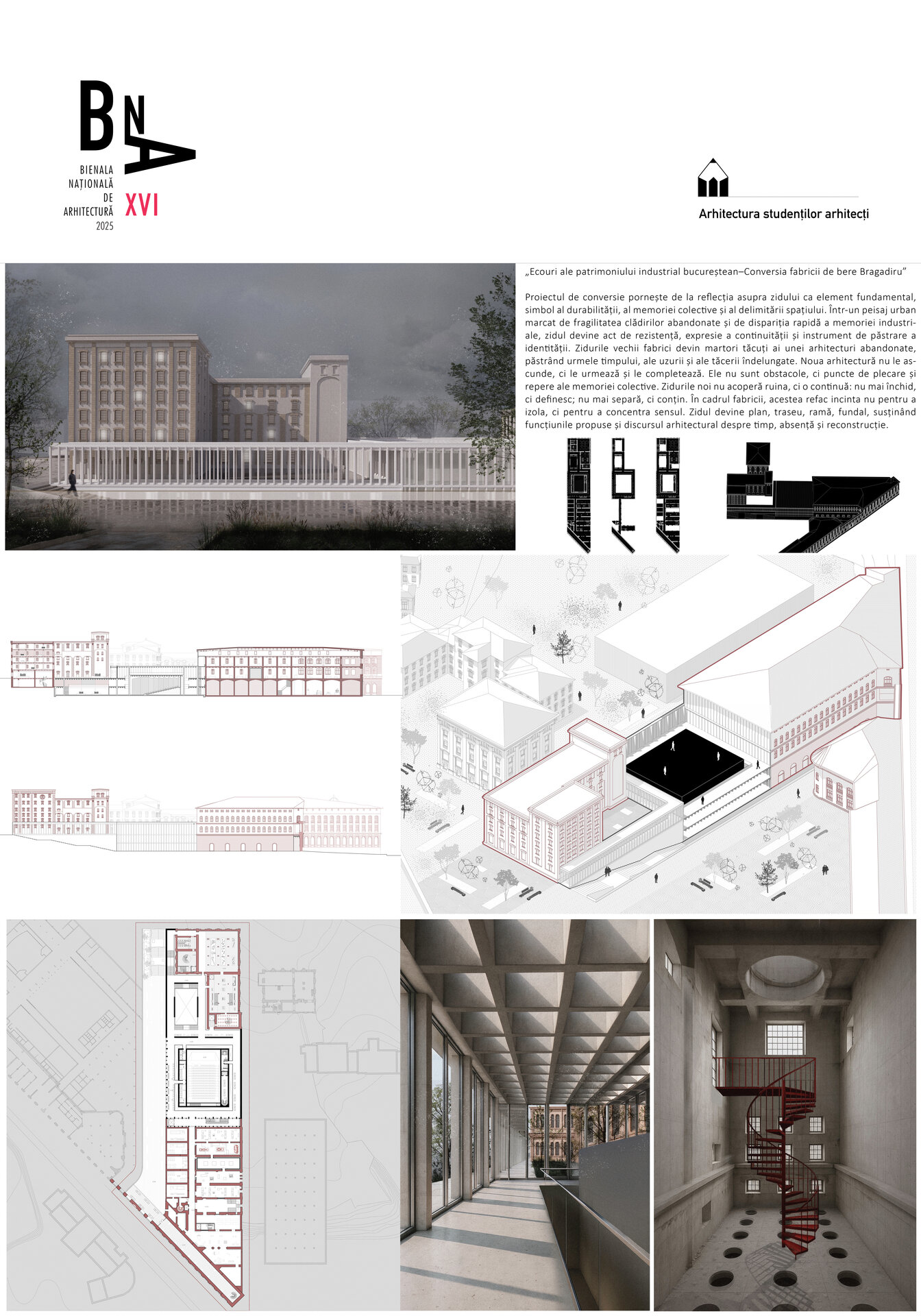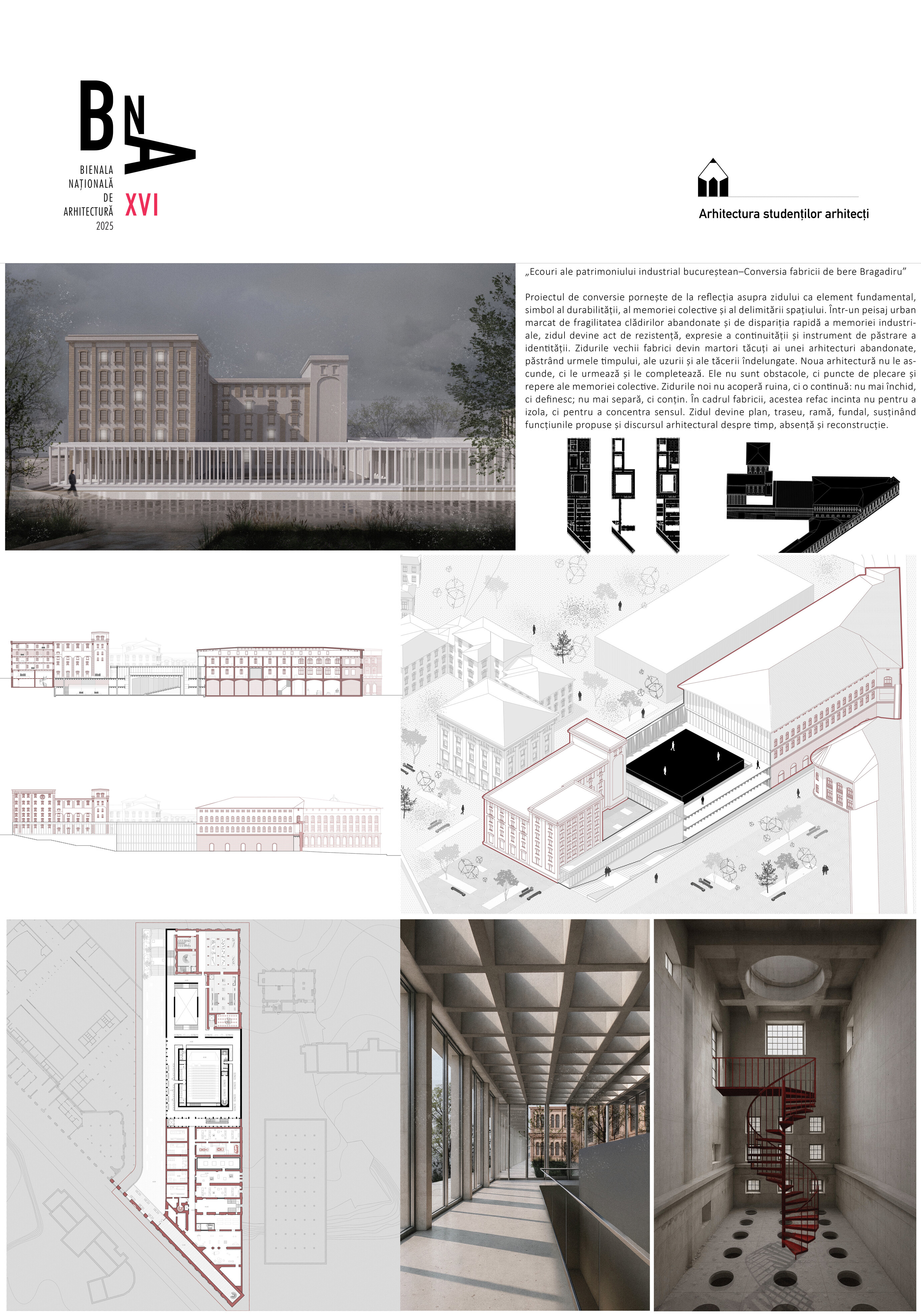 Fabrica de bere Bragadiru reprezintă un simbol important al patrimoniului industrial al Bucureștiului, un ansamblu care evocă sfârșitul secolului XIX, perioadă în care modernizarea orașului prindea contur printr-o arhitectură industrială ambițioasă. Ridicată ca un complex integrat, fabrica a devenit un reper al timpului său, martor al transformărilor urbane și punct de plecare pentru dialogul cu contextul contemporan. Proiectul de conversie pornește de la reflecția asupra zidului ca element fundamental – simbol al durabilității, al memoriei colective și al delimitării spațiului. Într-un peisaj urban marcat de fragilitatea clădirilor abandonate și de dispariția rapidă a memoriei industriale, zidul devine act de rezistență, expresie a continuității și instrument de reconstrucție identitară. Zidurile vechii fabrici devin martori tăcuți ai unei arhitecturi abandonate, păstrând urmele timpului, ale uzurii și ale tăcerii îndelungate. Noua arhitectură nu leacopera, ci le urmează și le completează. Ele nu sunt obstacole, ci puncte de plecare și repere ale memoriei colective. Zidurile noi nu ascund ruina, ci o continuă: nu mai închid, ci definesc; nu mai separă, ci conțin. În cadrul fabricii, acestea refac incinta nu pentru a izola, ci pentru a concentra sensul. Zidul devine plan, traseu, ramă, fundal, susținând funcțiunile propuse și discursul arhitectural despre timp, absență și reconstrucție. Fabrica păstrează astăzi o „muzică tăcută”, o vibrație latentă care pulsează în ziduri, hale și curți interioare. Alegerea funcțiunii este în armonie cu această muzică ascunsă, fără a șterge memoria industrială, ci oferindu-i o nouă voce. Astfel, școala de muzică și muzeul dedicate muzicii apar ca o continuitate firească: sunetele instrumentelor și ritmul lecțiilor trezesc spațiul la viață, transformând tăcerea într-un dialog vibrant între trecut și prezent. Fiecare sală de repetiții, coridor sau curte devine parte a unei simfonii urbane, iar clădirea își redescoperă rolul nu doar ca martor al istoriei, ci și ca generator de cultură, educație și emoție. Noile ziduri devin trasee, suporturi de expunere, ecrane acustice sau fundaluri tăcute, evidențiind ruina și integrând-o într-un discurs contemporan. Proiectul se concentrează pe cele două corpuri principale ale fabricii, spații care au găzduit inițial producția și care se remarcă printr-o arhitectură specifică, foarte expresivă, rezultată din necesități funcționale clare. Aceste clădiri, cu structuri robuste și ritmuri atent calibrate de gol si plin, constituie elementele de bază ale sitului, purtătoare ale identității industriale. Intervenția păstrează și valorifică interioarele existente, restaurându-le și revitalizându-le prin introducerea funcțiunii culturale. Spațiile interioare devin astfel suport pentru expunerea patrimoniului sonor și muzical și pentru experimentarea relației dintre arhitectura industrială și activitatea culturală. Extensia este concepută pe principiul „cub în cub”, facilitând realizarea unei săli de concerte izolate fonic, în exteriorul căreia se dezvoltă o varietate de trasee și pante. Această organizare rezonează cu experiența spațială a vechilor corpuri ale fabricii, amintind de circulația internă și ritmul funcțional al producției. Spațiile comune, circulațiile și pantele create în jurul sălii de concerte contribuie la o experiență complexă și dinamică pentru vizitatori, evocând labirintul intern al vechilor hale și păstrând proporțiile originale ale complexului. Extensia nu este doar un element de legătură, ci un catalizator pentru revitalizarea întregului ansamblu, stimulând interacțiunea între funcțiunea muzeală și experiența arhitecturală. Prin această abordare, proiectul integrează patrimoniul industrial cu o funcțiune culturală contemporană, evidențiind valoarea istorică a sitului și oferind un cadru activ pentru educație și cultură muzicală. Transformarea spațiilor de producție în muzee și săli de concerte permite conservarea și reinterpretarea arhitecturii originale, în timp ce extensia contemporană susține funcționalitatea și creează un dialog vizual și conceptual între trecut și prezent.
