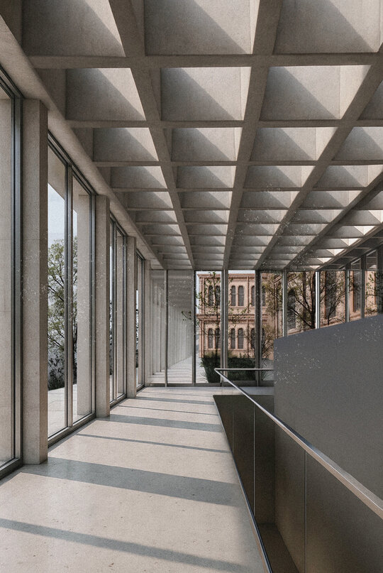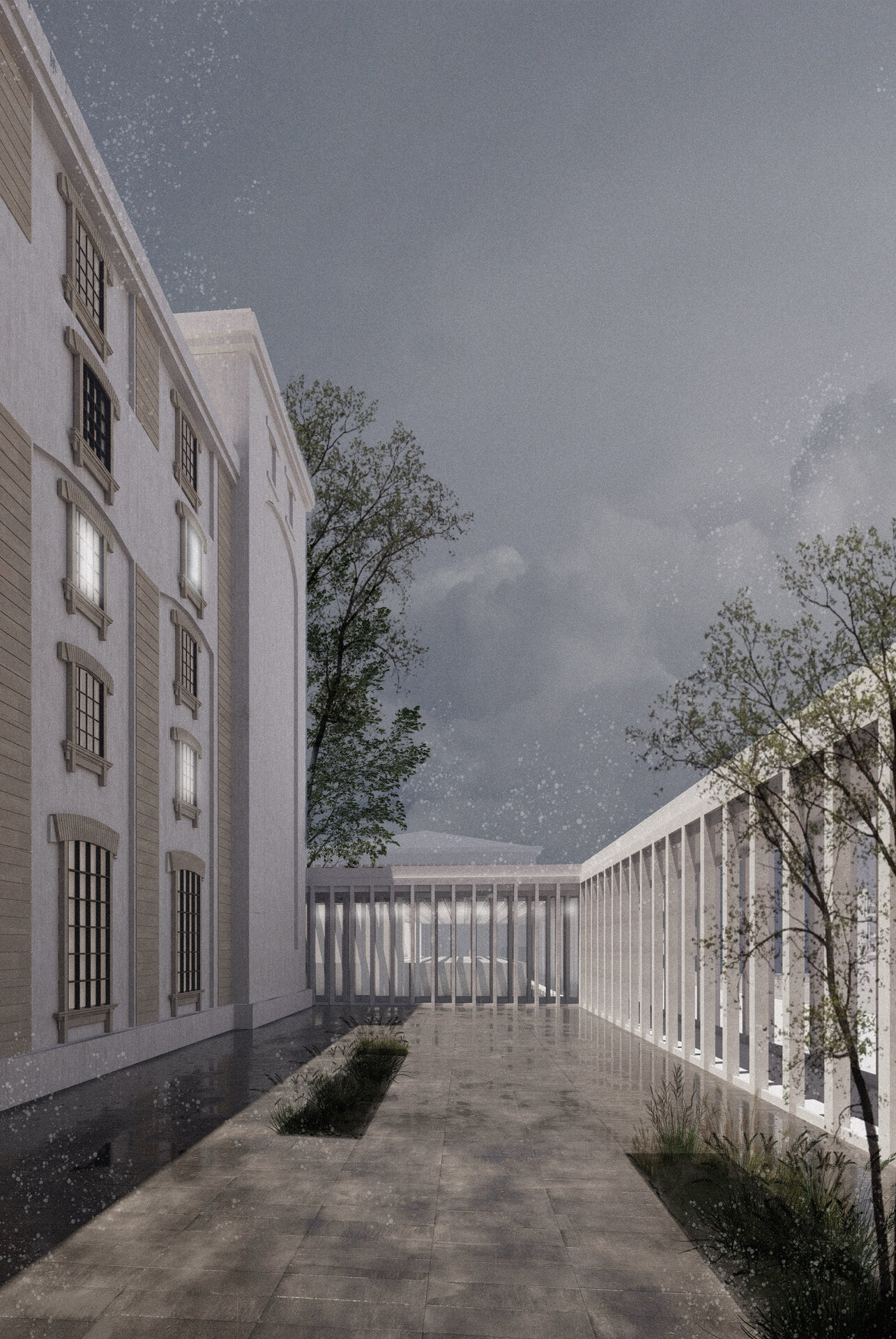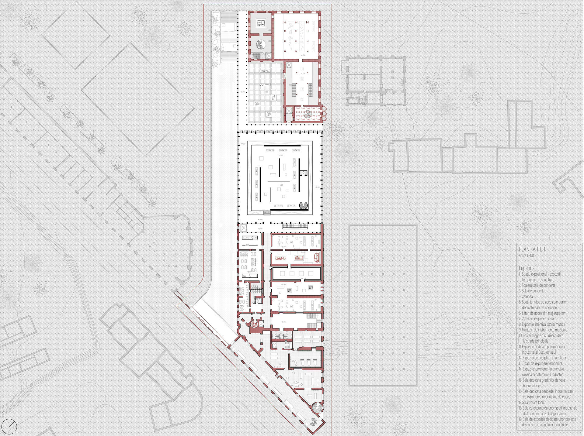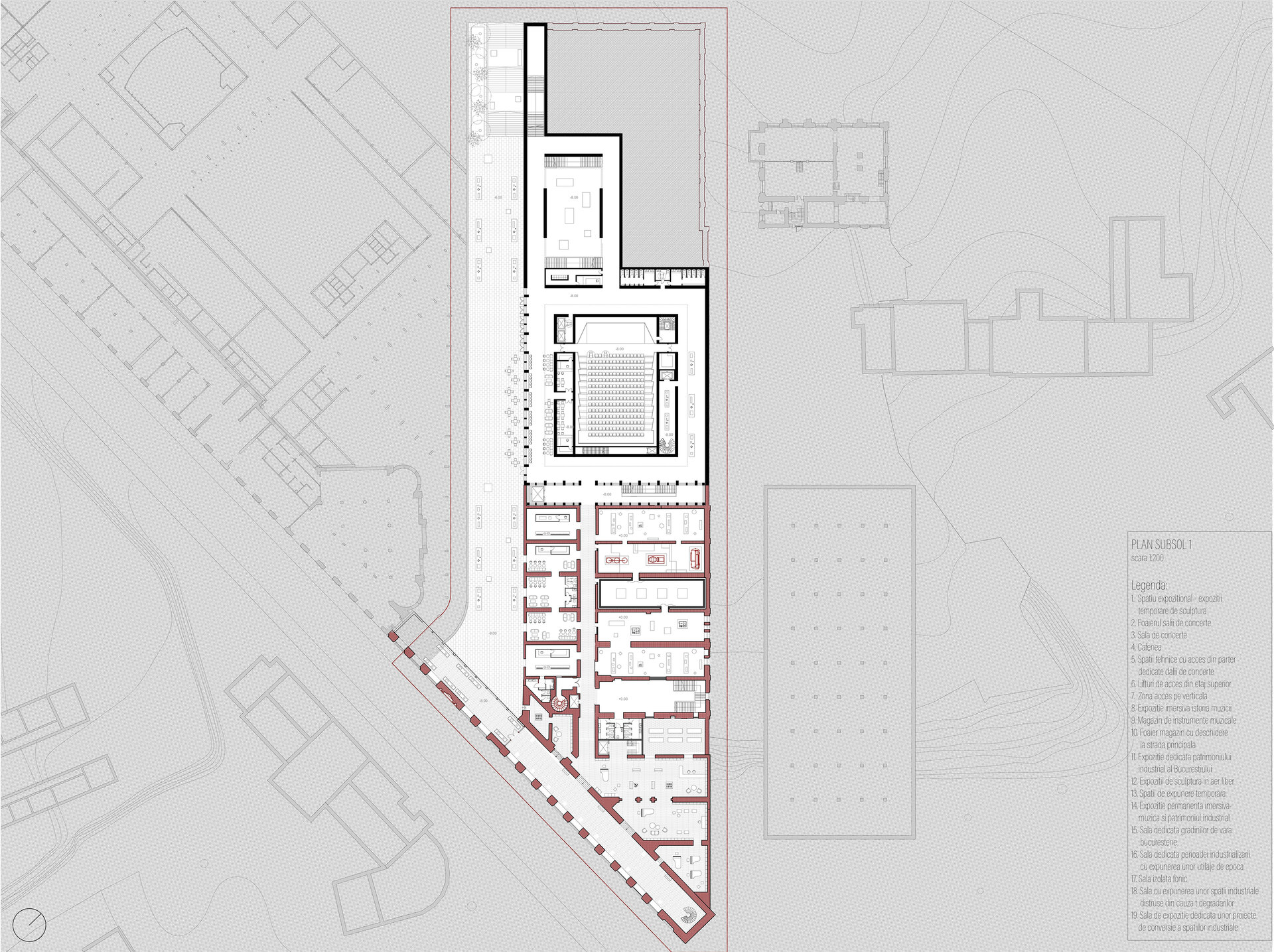 Fabrica de bere Bragadiru reprezintă un simbol important al patrimoniului industrial al Bucureștiului, un ansamblu care evocă sfârșitul secolului XIX, perioadă în care modernizarea orașului prindea contur printr-o arhitectură industrială ambițioasă. Ridicată ca un complex integrat, fabrica a devenit un reper al timpului său, martor al transformărilor urbane și punct de plecare pentru dialogul cu contextul contemporan. Proiectul de conversie pornește de la reflecția asupra zidului ca element fundamental – simbol al durabilității, al memoriei colective și al delimitării spațiului. Într-un peisaj urban marcat de fragilitatea clădirilor abandonate și de dispariția rapidă a memoriei industriale, zidul devine act de rezistență, expresie a continuității și instrument de reconstrucție identitară. Zidurile vechii fabrici devin martori tăcuți ai unei arhitecturi abandonate, păstrând urmele timpului, ale uzurii și ale tăcerii îndelungate. Noua arhitectură nu leacopera, ci le urmează și le completează. Ele nu sunt obstacole, ci puncte de plecare și repere ale memoriei colective. Zidurile noi nu ascund ruina, ci o continuă: nu mai închid, ci definesc; nu mai separă, ci conțin. În cadrul fabricii, acestea refac incinta nu pentru a izola, ci pentru a concentra sensul. Zidul devine plan, traseu, ramă, fundal, susținând funcțiunile propuse și discursul arhitectural despre timp, absență și reconstrucție. Fabrica păstrează astăzi o „muzică tăcută”, o vibrație latentă care pulsează în ziduri, hale și curți interioare. Alegerea funcțiunii este în armonie cu această muzică ascunsă, fără a șterge memoria industrială, ci oferindu-i o nouă voce. Astfel, școala de muzică și muzeul dedicate muzicii apar ca o continuitate firească: sunetele instrumentelor și ritmul lecțiilor trezesc spațiul la viață, transformând tăcerea într-un dialog vibrant între trecut și prezent. Fiecare sală de repetiții, coridor sau curte devine parte a unei simfonii urbane, iar clădirea își redescoperă rolul nu doar ca martor al istoriei, ci și ca generator de cultură, educație și emoție. Noile ziduri devin trasee, suporturi de expunere, ecrane acustice sau fundaluri tăcute, evidențiind ruina și integrând-o într-un discurs contemporan. Proiectul se concentrează pe cele două corpuri principale ale fabricii, spații care au găzduit inițial producția și care se remarcă printr-o arhitectură specifică, foarte expresivă, rezultată din necesități funcționale clare. Aceste clădiri, cu structuri robuste și ritmuri atent calibrate de gol si plin, constituie elementele de bază ale sitului, purtătoare ale identității industriale. Intervenția păstrează și valorifică interioarele existente, restaurându-le și revitalizându-le prin introducerea funcțiunii culturale. Spațiile interioare devin astfel suport pentru expunerea patrimoniului sonor și muzical și pentru experimentarea relației dintre arhitectura industrială și activitatea culturală. Extensia este concepută pe principiul „cub în cub”, facilitând realizarea unei săli de concerte izolate fonic, în exteriorul căreia se dezvoltă o varietate de trasee și pante. Această organizare rezonează cu experiența spațială a vechilor corpuri ale fabricii, amintind de circulația internă și ritmul funcțional al producției. Spațiile comune, circulațiile și pantele create în jurul sălii de concerte contribuie la o experiență complexă și dinamică pentru vizitatori, evocând labirintul intern al vechilor hale și păstrând proporțiile originale ale complexului. Extensia nu este doar un element de legătură, ci un catalizator pentru revitalizarea întregului ansamblu, stimulând interacțiunea între funcțiunea muzeală și experiența arhitecturală. Prin această abordare, proiectul integrează patrimoniul industrial cu o funcțiune culturală contemporană, evidențiind valoarea istorică a sitului și oferind un cadru activ pentru educație și cultură muzicală. Transformarea spațiilor de producție în muzee și săli de concerte permite conservarea și reinterpretarea arhitecturii originale, în timp ce extensia contemporană susține funcționalitatea și creează un dialog vizual și conceptual între trecut și prezent.