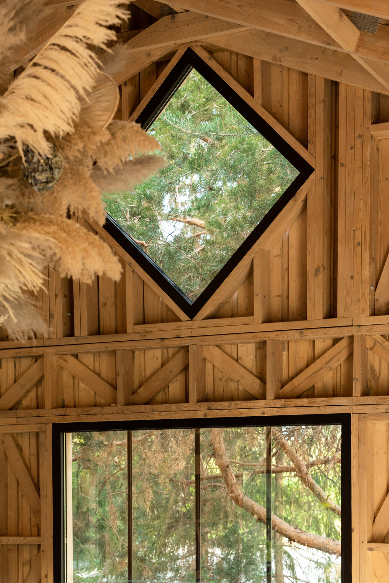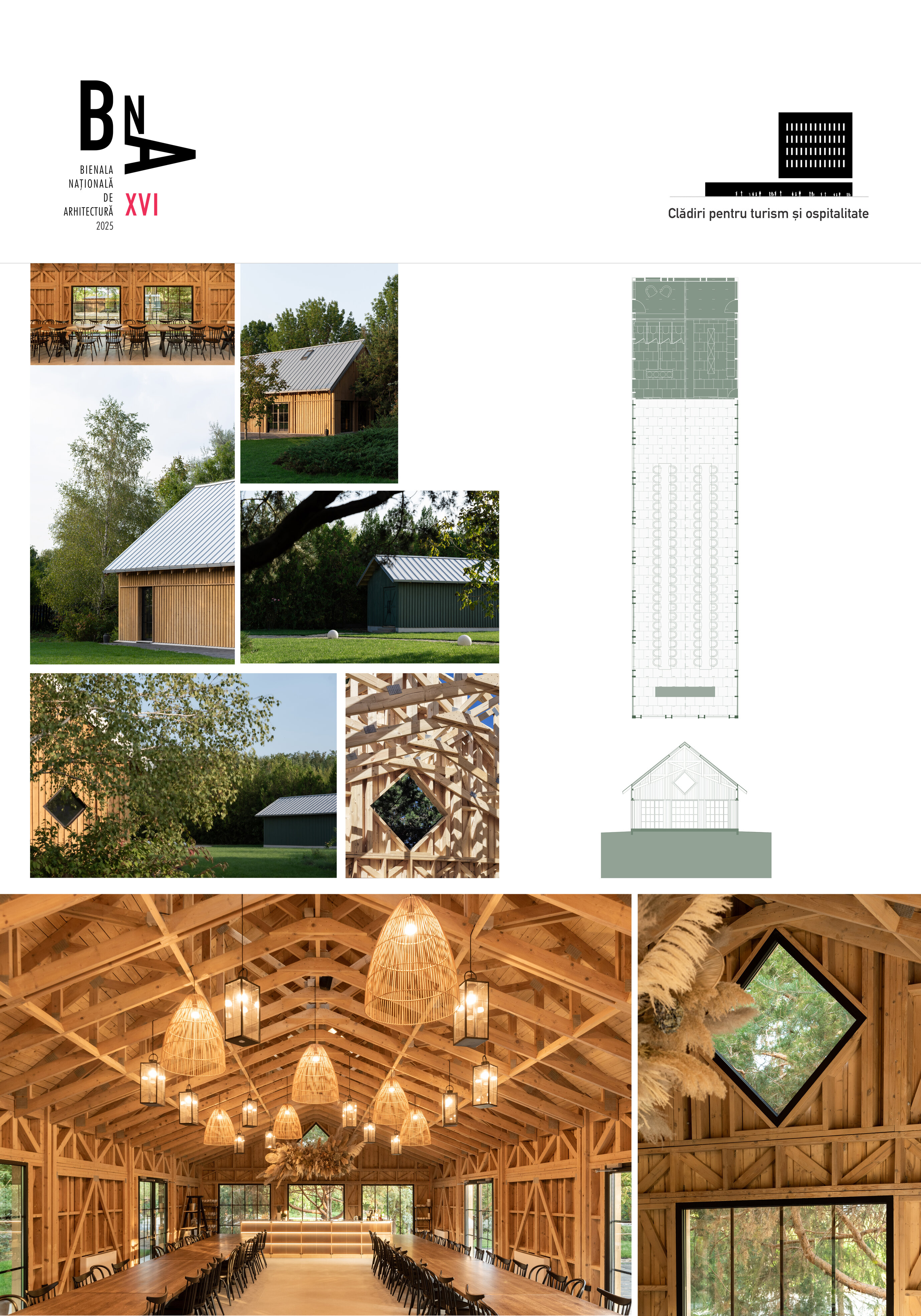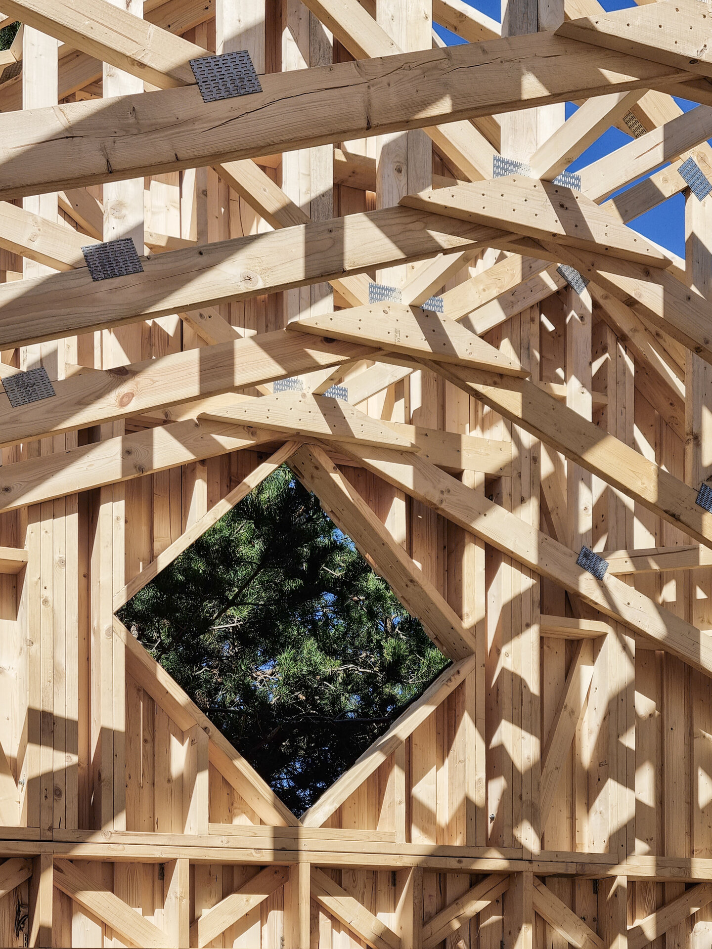 Lemnul a fost ales ca material principal, atât pentru calitățile sale estetice și integrarea firească în peisaj, cât și pentru logica sustenabilității și a execuției rapide. Proiectul se bazează pe o structură simplă, alcătuită din elemente de lemn natural, îmbinate astfel încât să poată susține o deschidere mare fără recurs la elemente suplimentare metalice sau masive. Această soluție a reprezentat una dintre principalele provocări tehnice: menținerea caracterului diafan și deschis al spațiului, fără a compromite rezistența structurală.