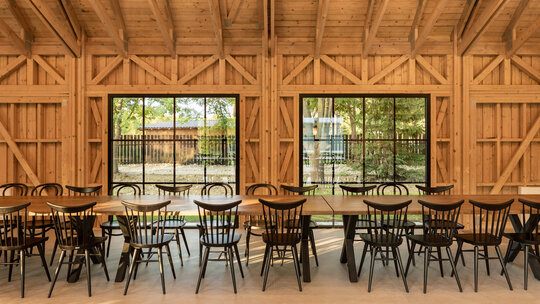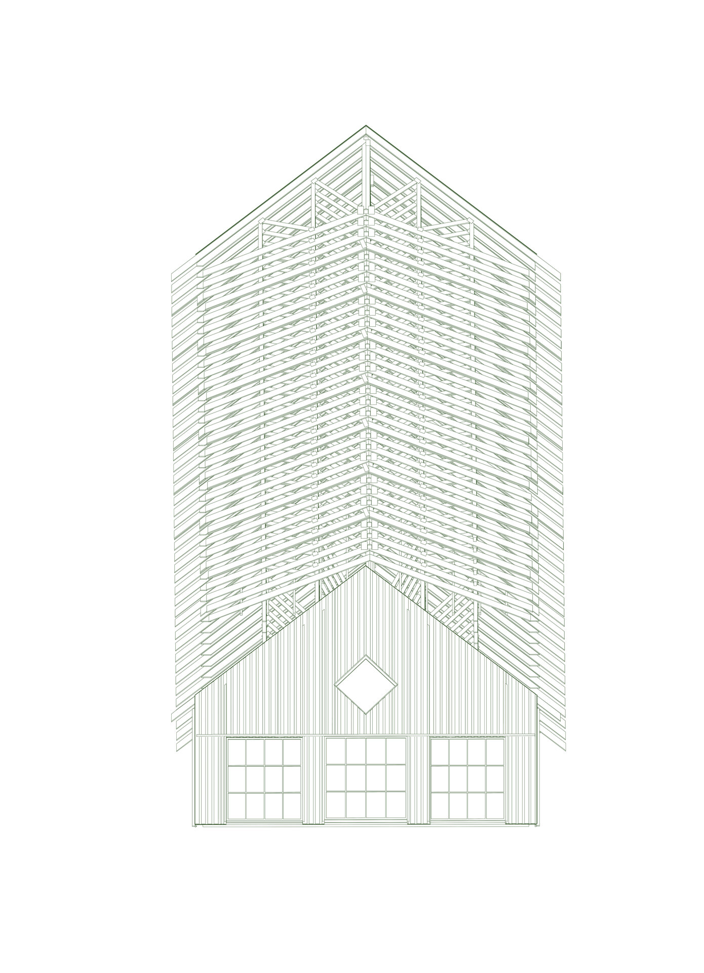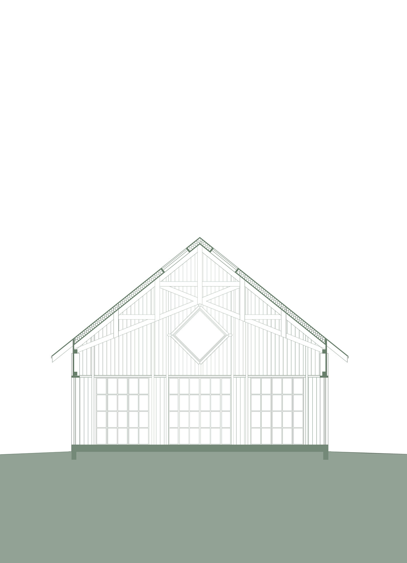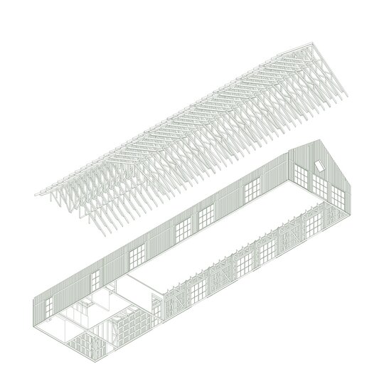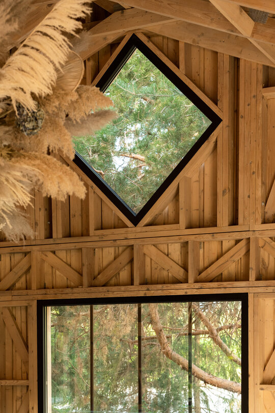 Lemnul a fost ales ca material principal, atât pentru calitățile sale estetice și integrarea firească în peisaj, cât și pentru logica sustenabilității și a execuției rapide. Proiectul se bazează pe o structură simplă, alcătuită din elemente de lemn natural, îmbinate astfel încât să poată susține o deschidere mare fără recurs la elemente suplimentare metalice sau masive. Această soluție a reprezentat una dintre principalele provocări tehnice: menținerea caracterului diafan și deschis al spațiului, fără a compromite rezistența structurală.