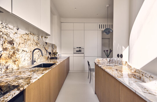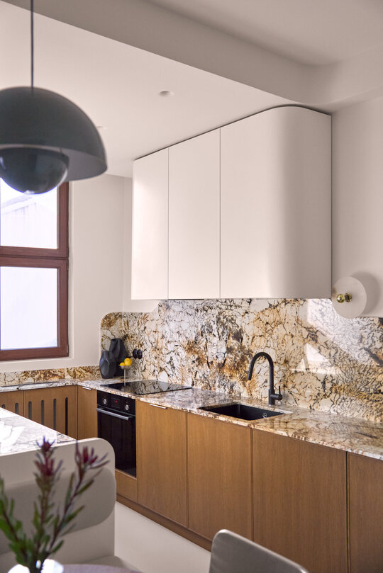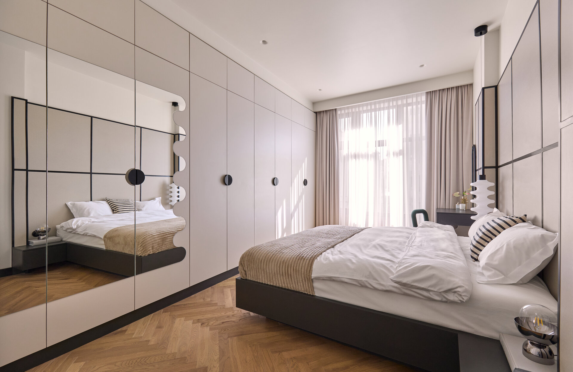 Ca stil, apartamentul se înscrie în zona unui Art Deco reinterpretat – un dialog între geometria riguroasă și volumele fluide, între materialele calde și accentele grafice. Nu este o reproducere fidelă, ci o versiune contemporană, personală, care preia spiritul epocii interbelice și îl adaptează unei locuințe actuale.