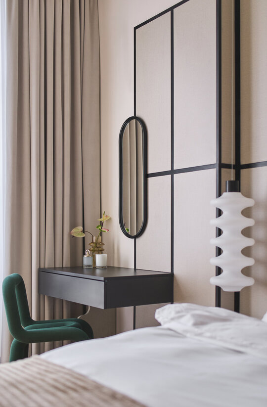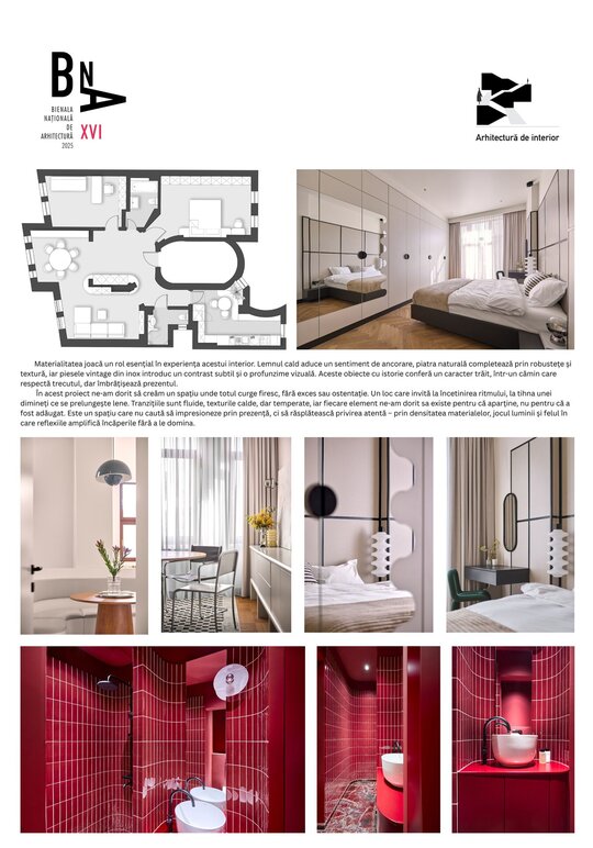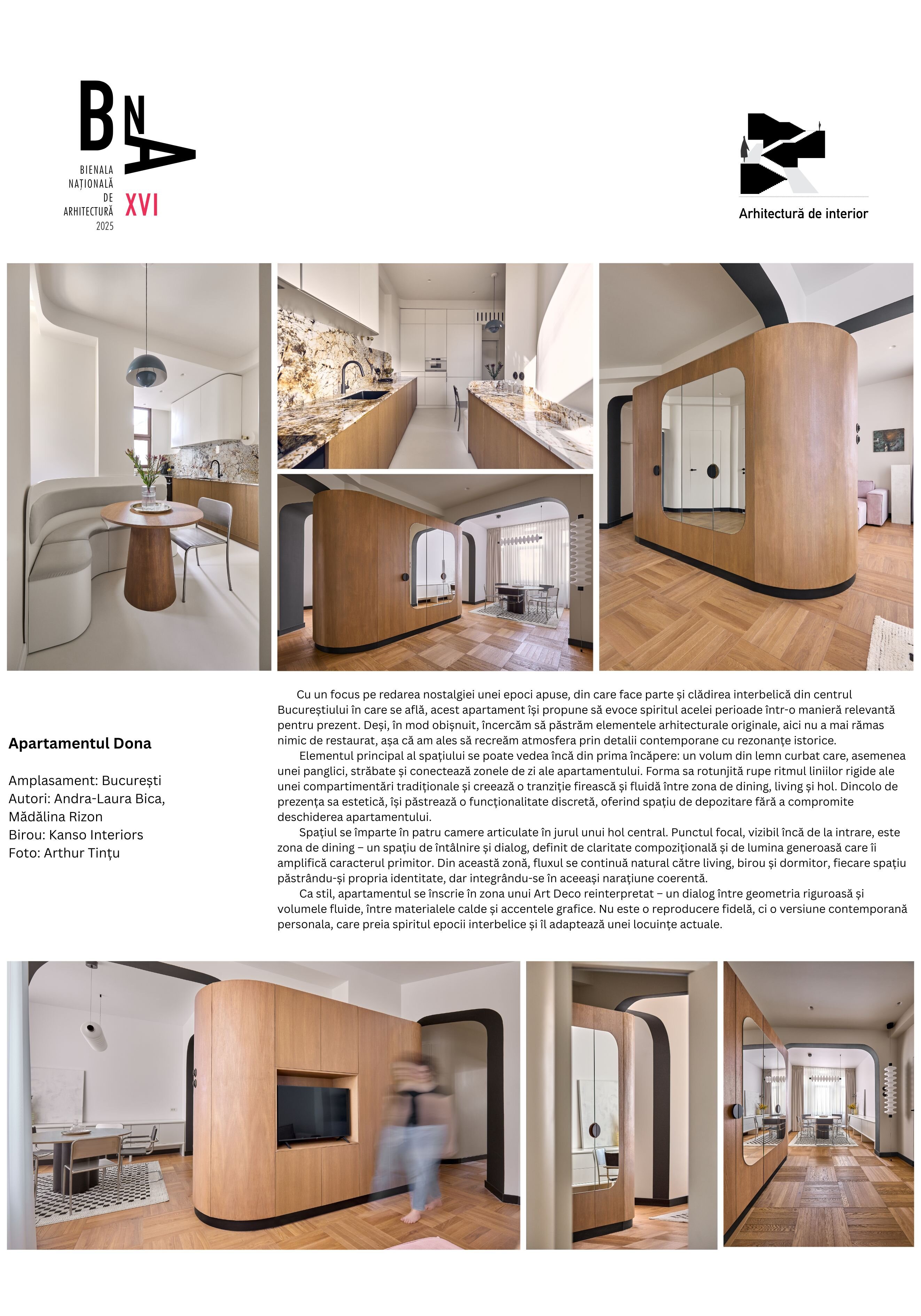 Cu un focus pe redarea nostalgiei unei epoci apuse, din care face parte și clădirea interbelică din centrul Bucureștiului în care se află, acest apartament își propune să evoce spiritul acelei perioade într-o manieră relevantă pentru prezent. Deși, în mod obișnuit, încercăm să păstrăm elementele arhitecturale originale, aici nu a mai rămas nimic de restaurat, așa că am ales să recreăm atmosfera prin detalii contemporane cu rezonanțe istorice.