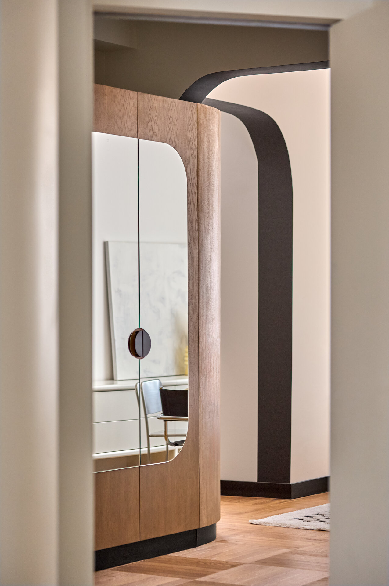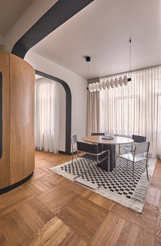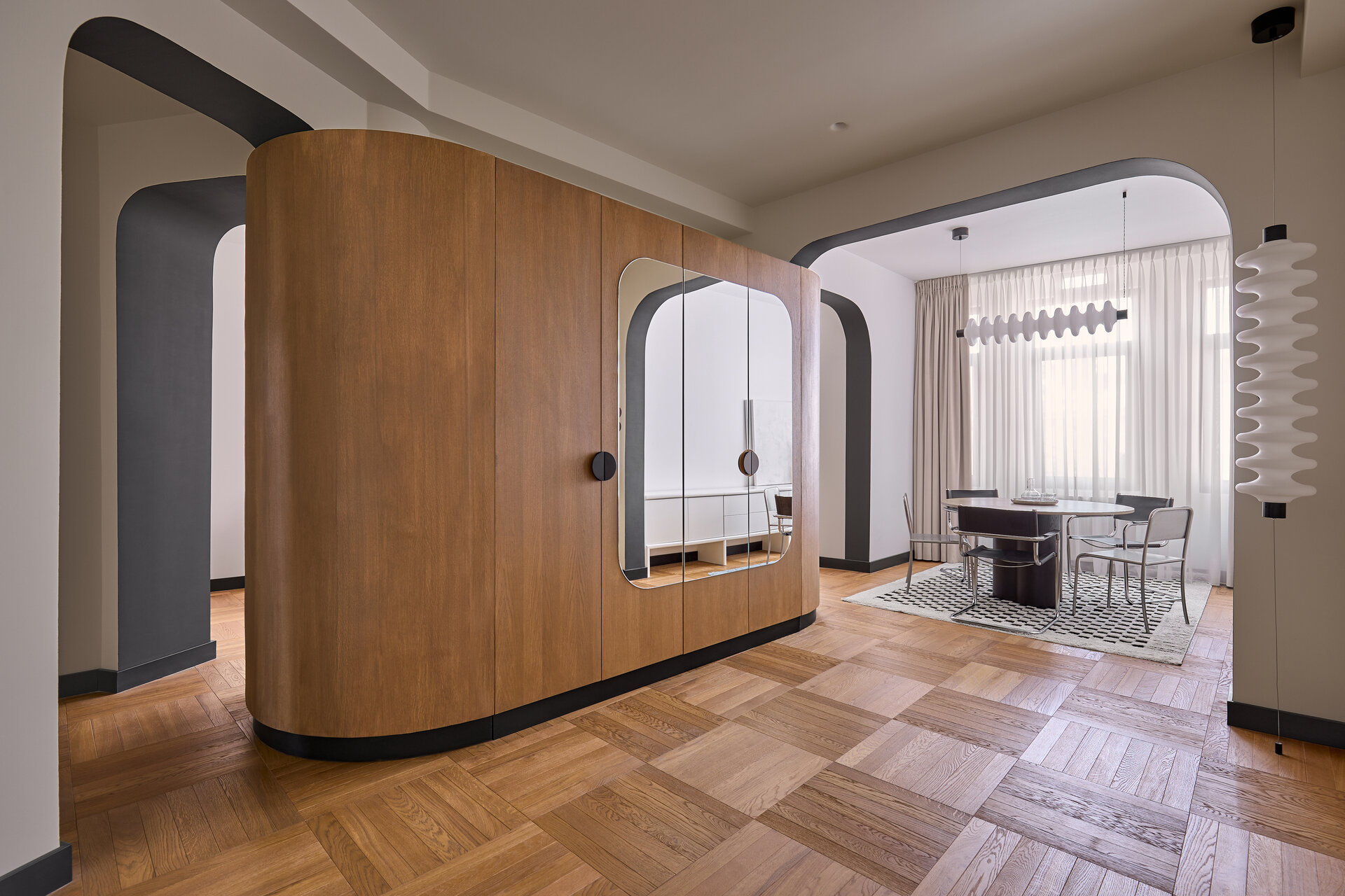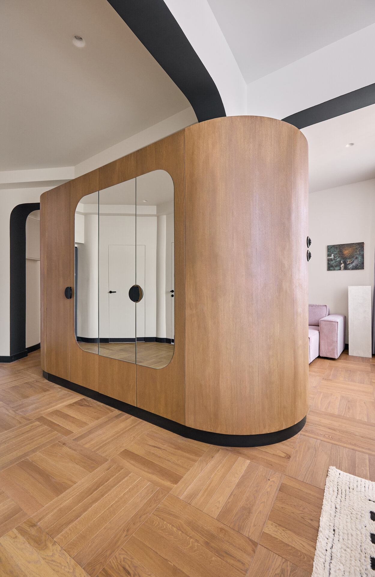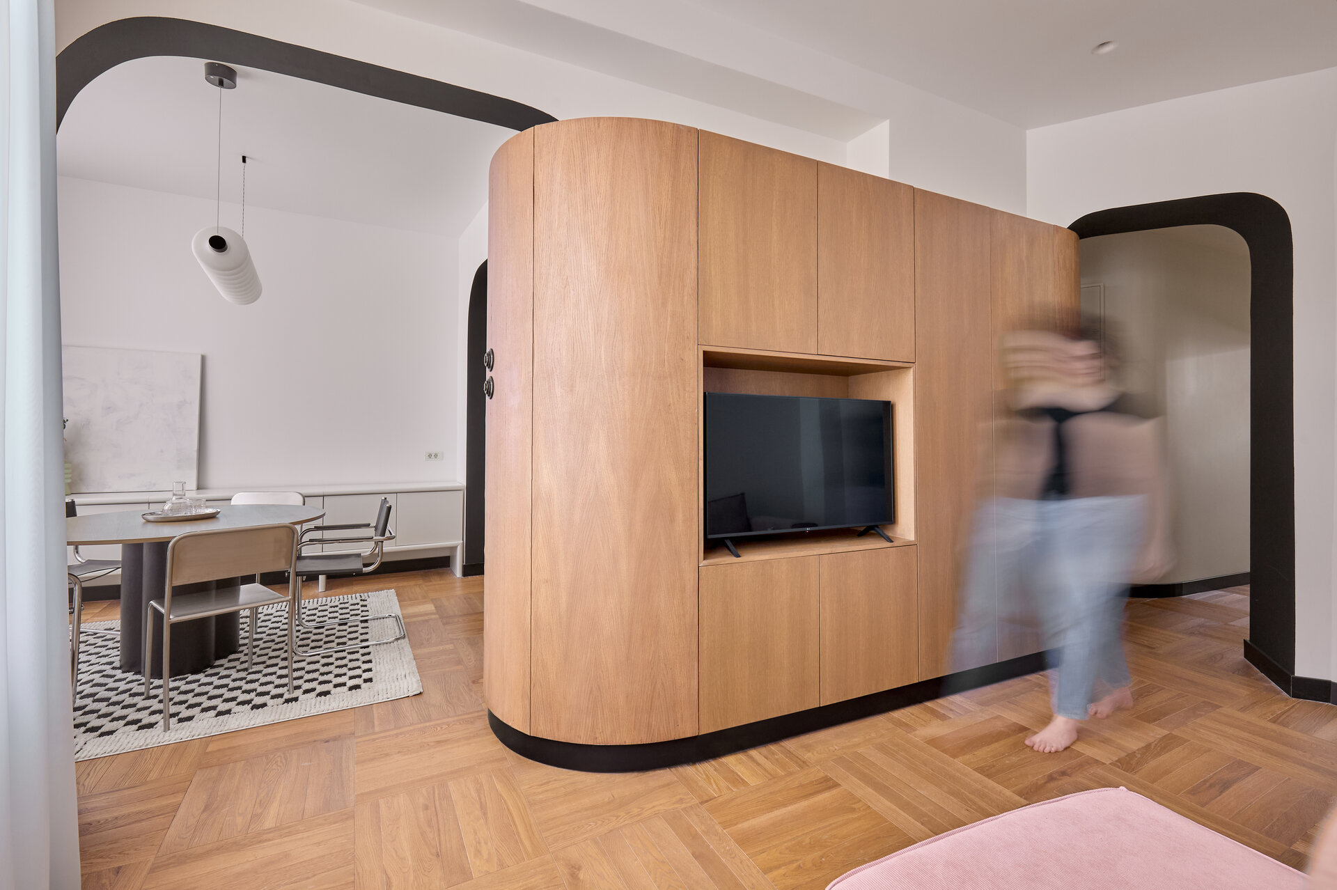 Elementul principal al spațiului se poate vedea încă din prima încăpere: un volum din lemn curbat care, asemenea unei panglici, străbate și conectează zonele de zi ale apartamentului. Forma sa rotunjită rupe ritmul liniilor rigide ale unei compartimentări tradiționale și creează o tranziție firească și fluidă între zona de dining, living și hol. Dincolo de prezența sa estetică, își păstrează o funcționalitate discretă, oferind spațiu de depozitare fără a compromite deschiderea apartamentului.