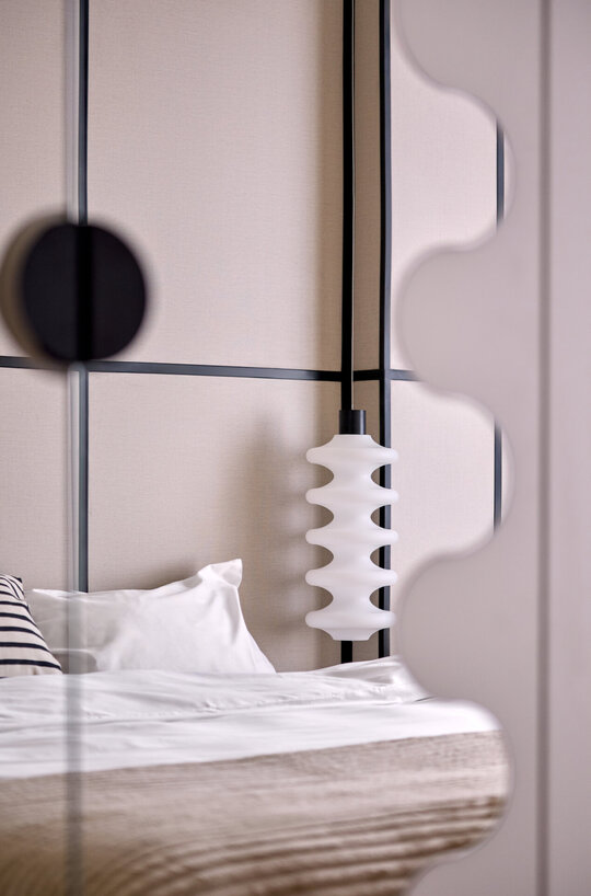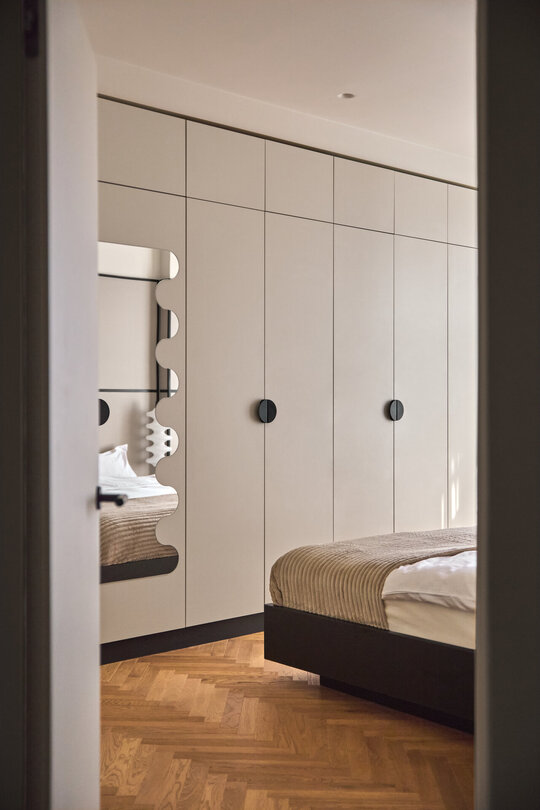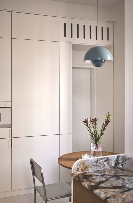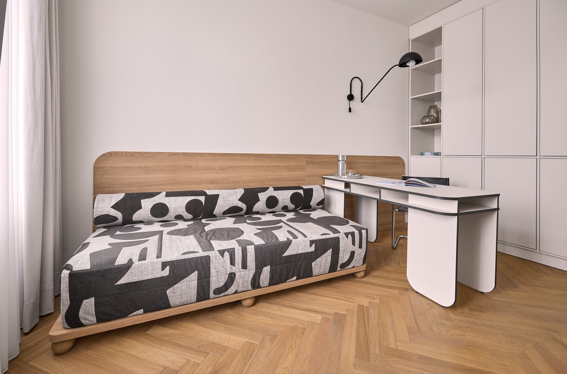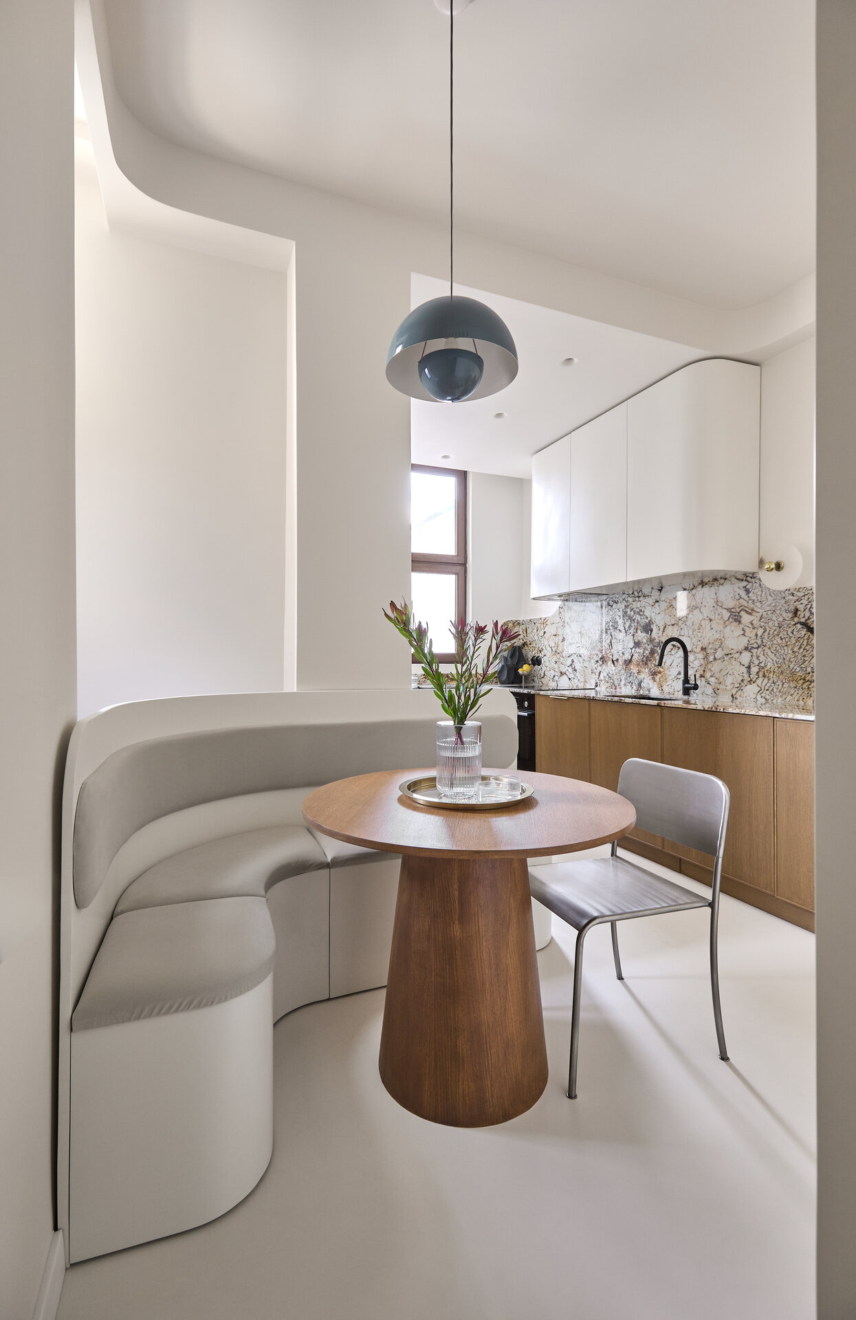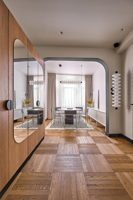 Elementul principal al spațiului se poate vedea încă din prima încăpere: un volum din lemn curbat care, asemenea unei panglici, străbate și conectează zonele de zi ale apartamentului. Forma sa rotunjită rupe ritmul liniilor rigide ale unei compartimentări tradiționale și creează o tranziție firească și fluidă între zona de dining, living și hol. Dincolo de prezența sa estetică, își păstrează o funcționalitate discretă, oferind spațiu de depozitare fără a compromite deschiderea apartamentului.
