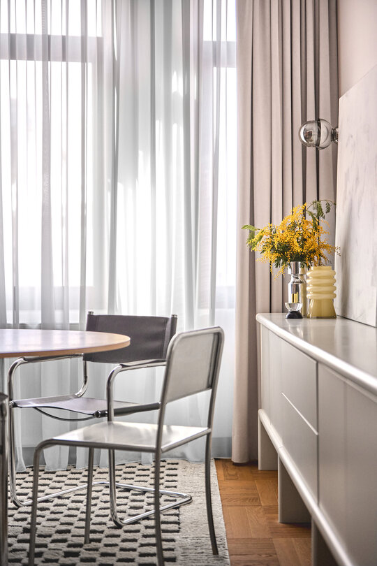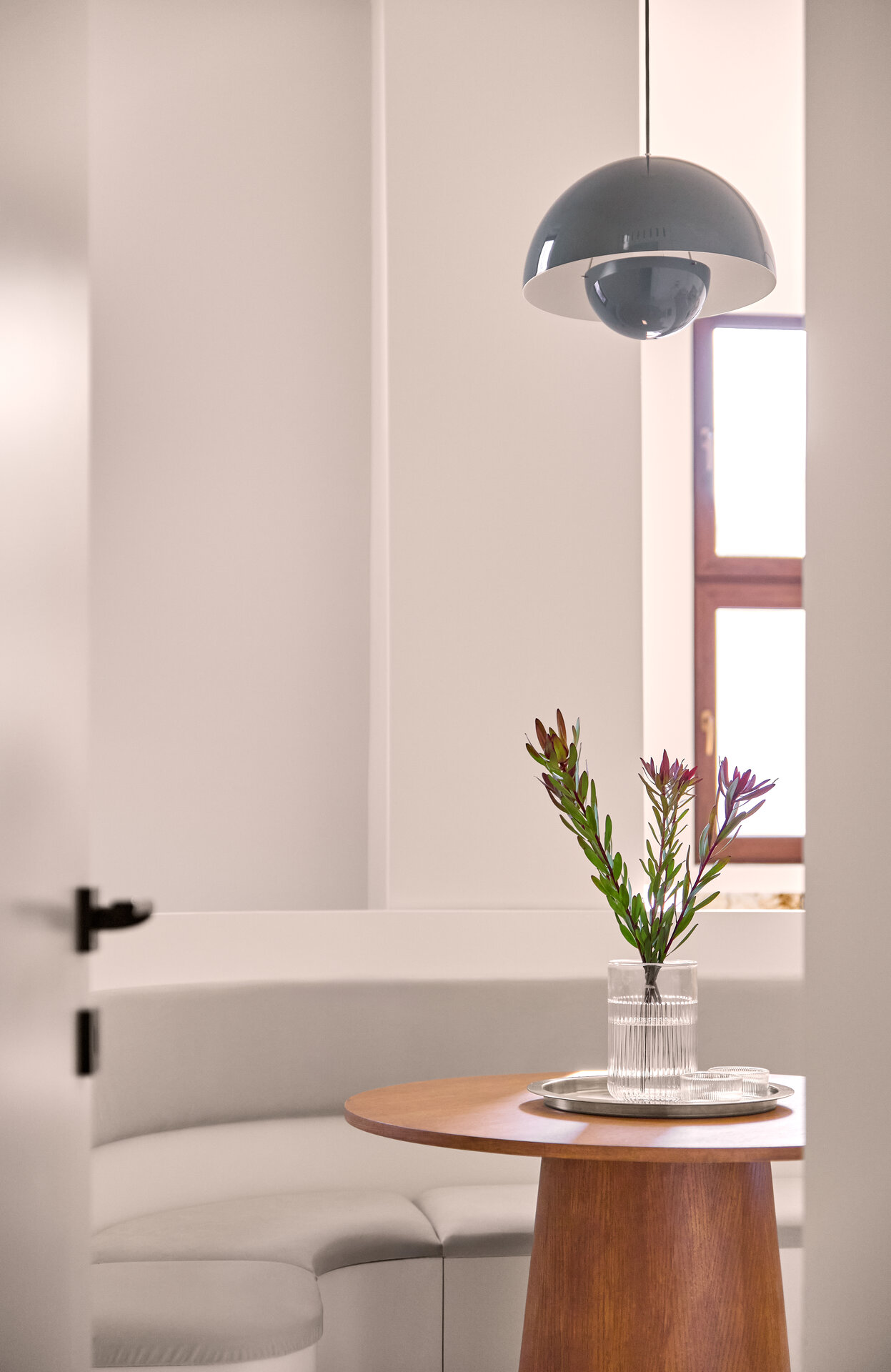 Spațiul se împarte în patru camere articulate în jurul unui hol central. Punctul focal, vizibil încă de la intrare, este zona de dining – un spațiu de întâlnire și dialog, definit de claritate compozițională și de lumina generoasă care îi amplifică caracterul primitor. Din această zonă, fluxul se continuă natural către living, birou și dormitor, fiecare spațiu păstrându-și propria identitate, dar integrându-se în aceeași narațiune coerentă.