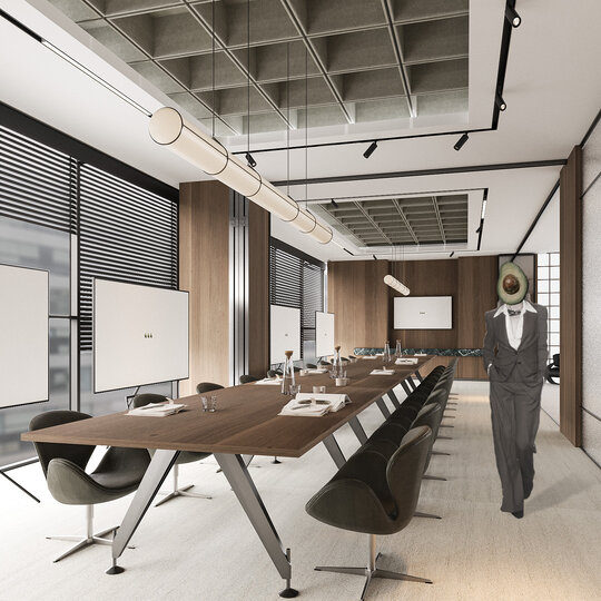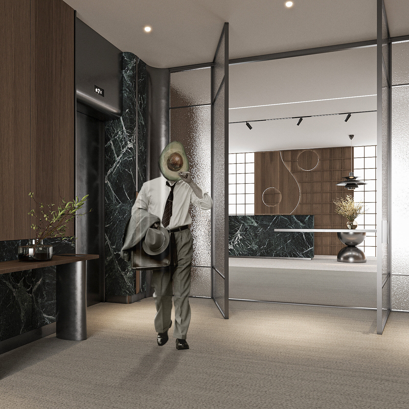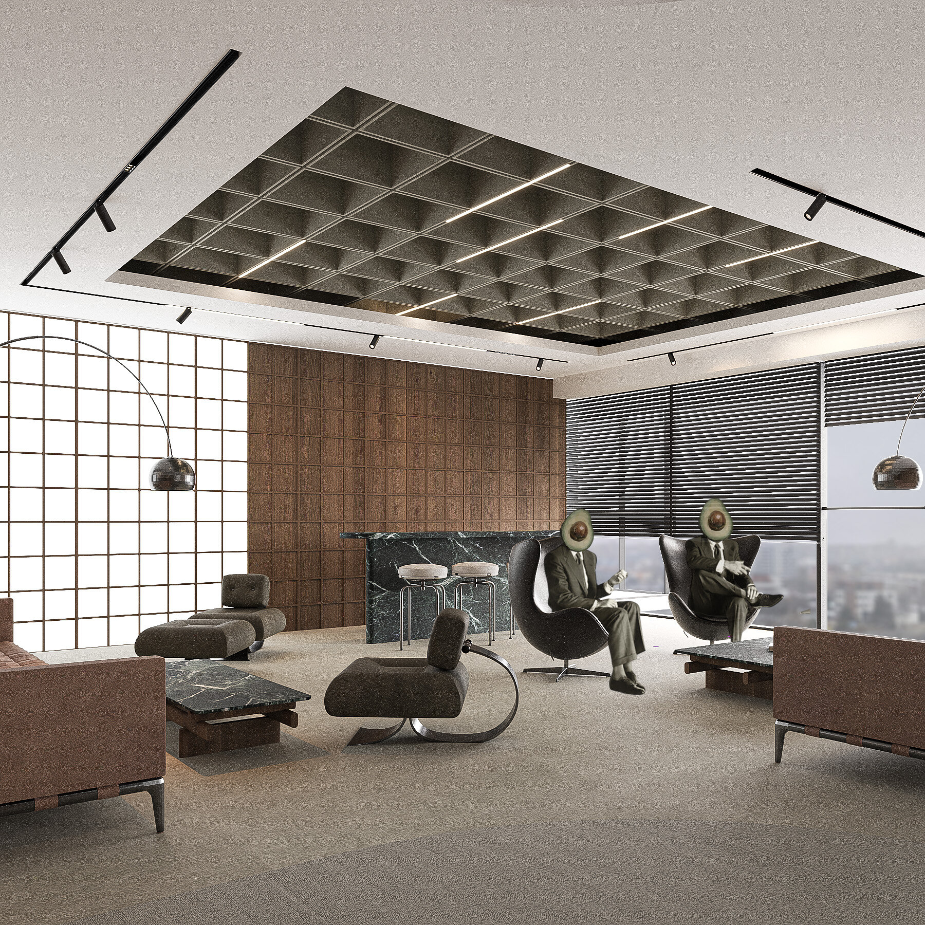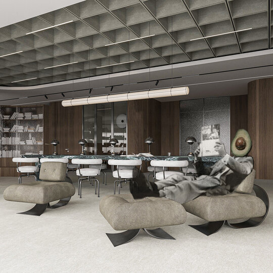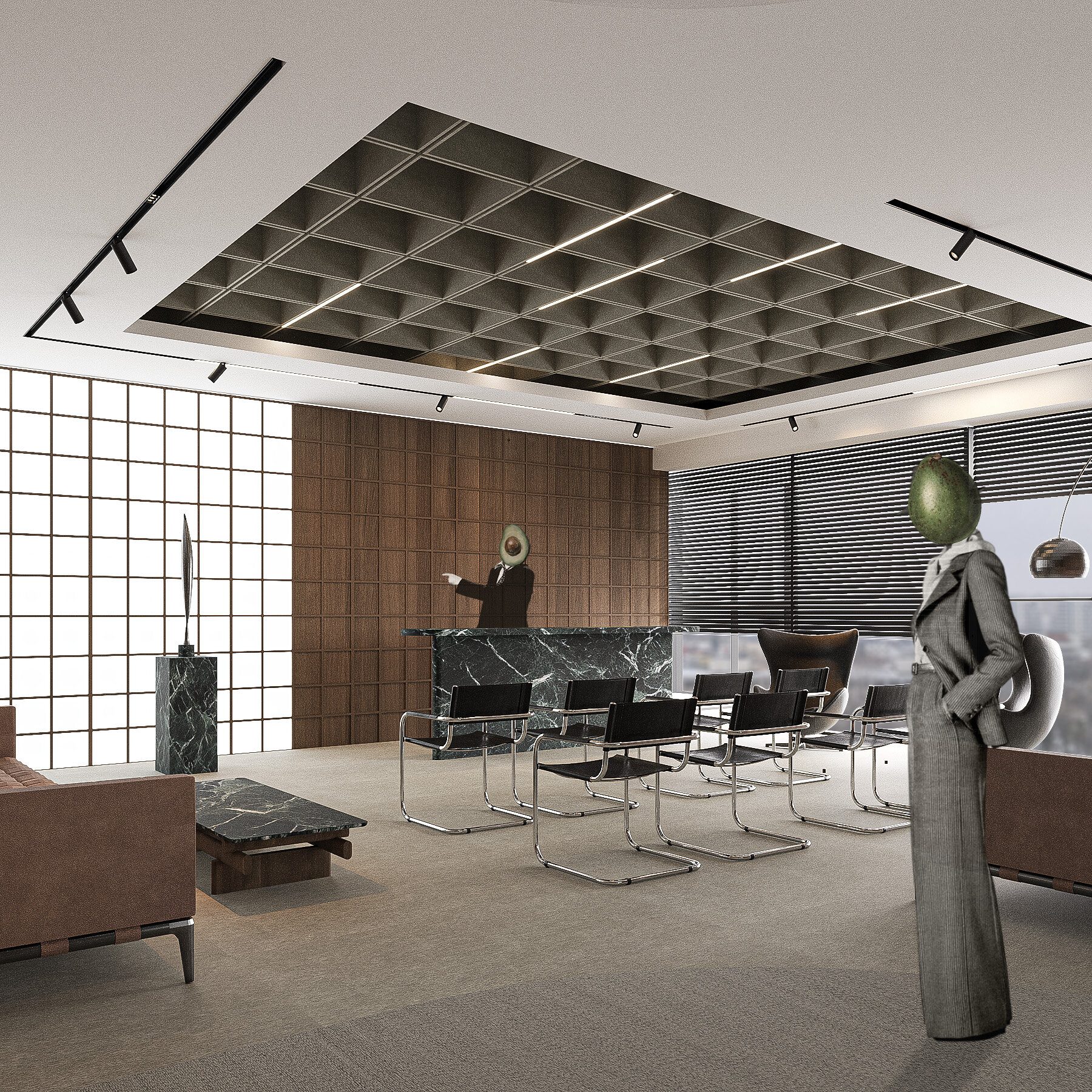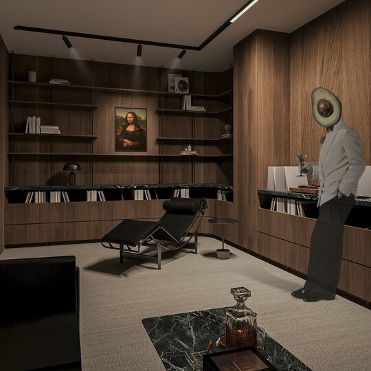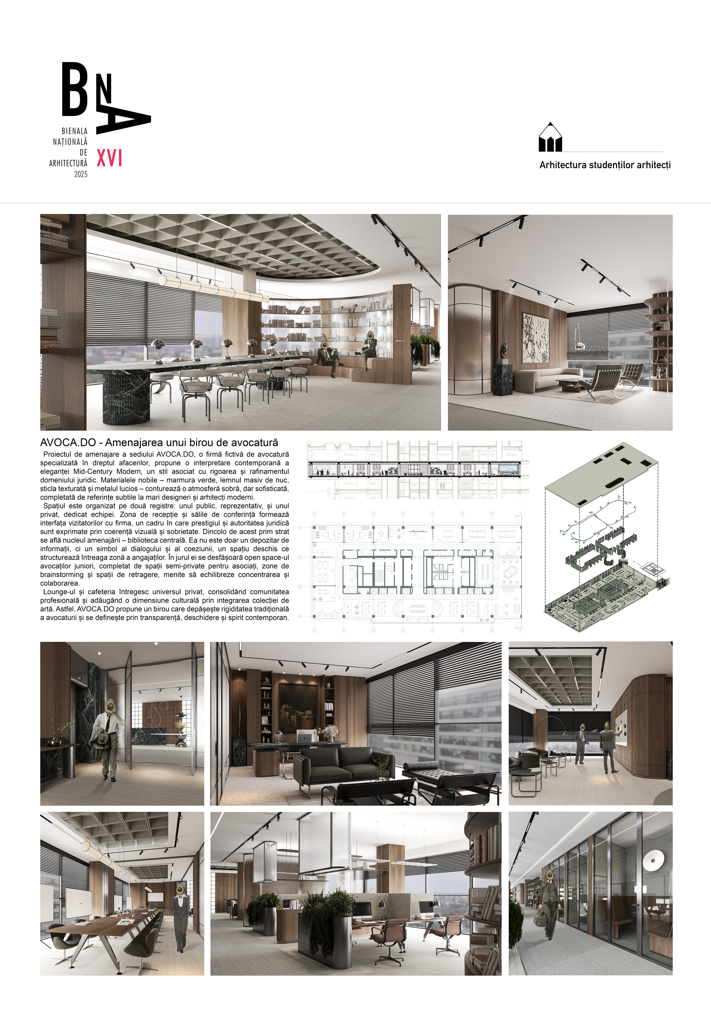 Amenajarea sediului AVOCA.DO, o firmă de avocatură fictivă specializată în dreptul afacerilor și condusă de doi parteneri seniori, se construiește pe temelia unui limbaj vizual inspirat din eleganța atemporală a stilului Mid-Century Modern, asociat frecvent cu domeniul juridic prin echilibrul său între rigoare și rafinament. Această alegere reflectă atât stabilitatea și prestigiul profesiei, cât și dorința de a proiecta un mediu contemporan, care să sprijine colaborarea și coeziunea echipei. Liniile clare, proporțiile echilibrate și materialele nobile – marmura verde, lemnul masiv de nuc, sticla texturată și metalul lucios – definesc o atmosferă sobră, dar sofisticată, completată de referințe la operele unor arhitecți și designeri faimoși, reinterpretate într-un cadru actual.