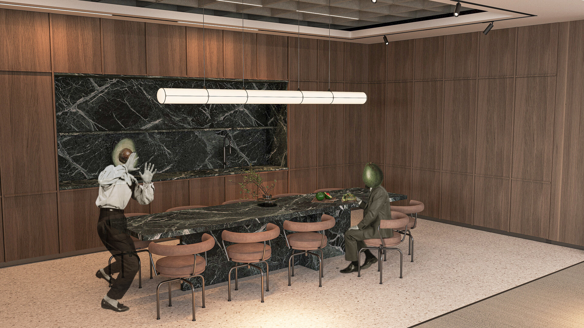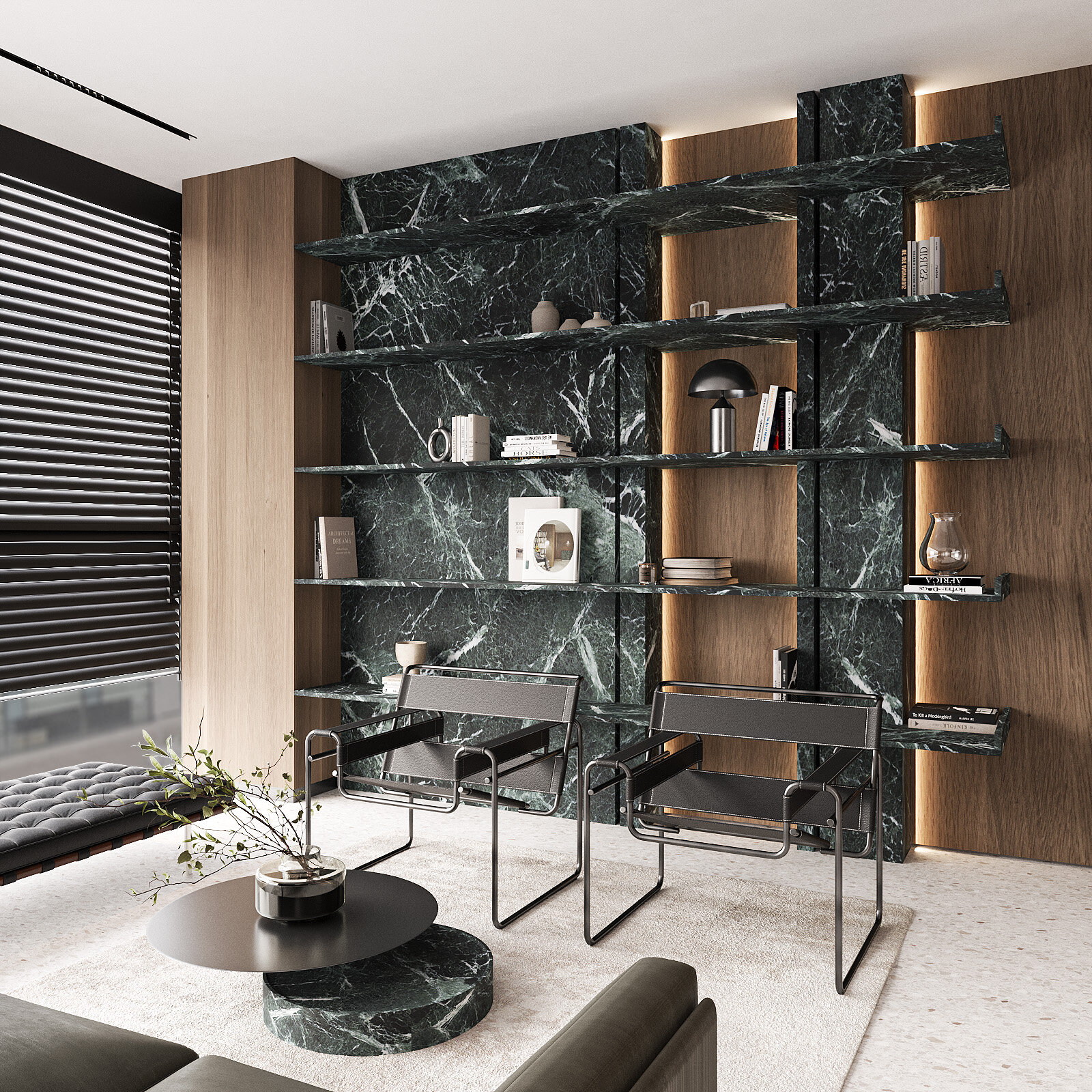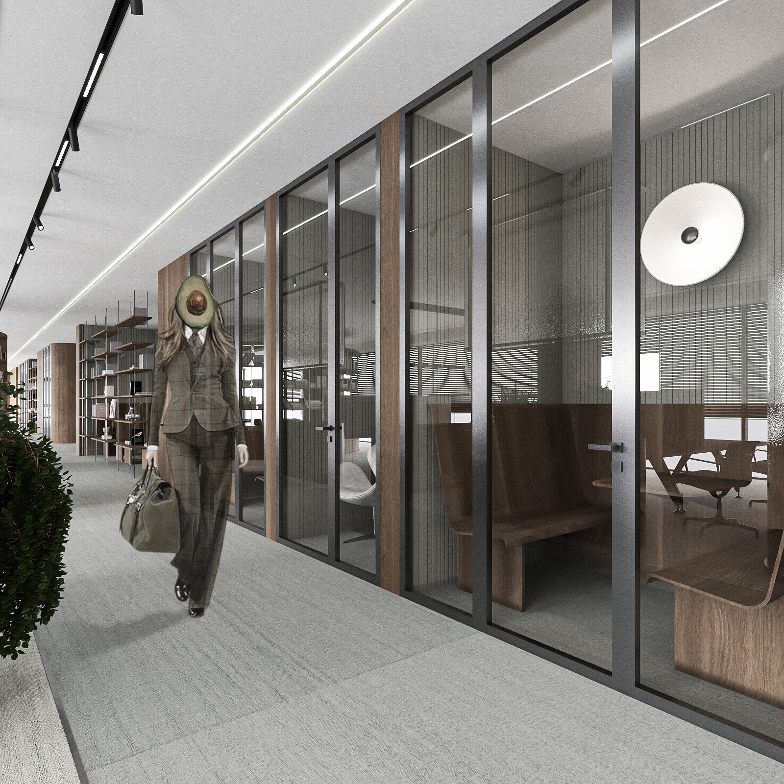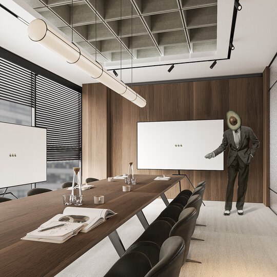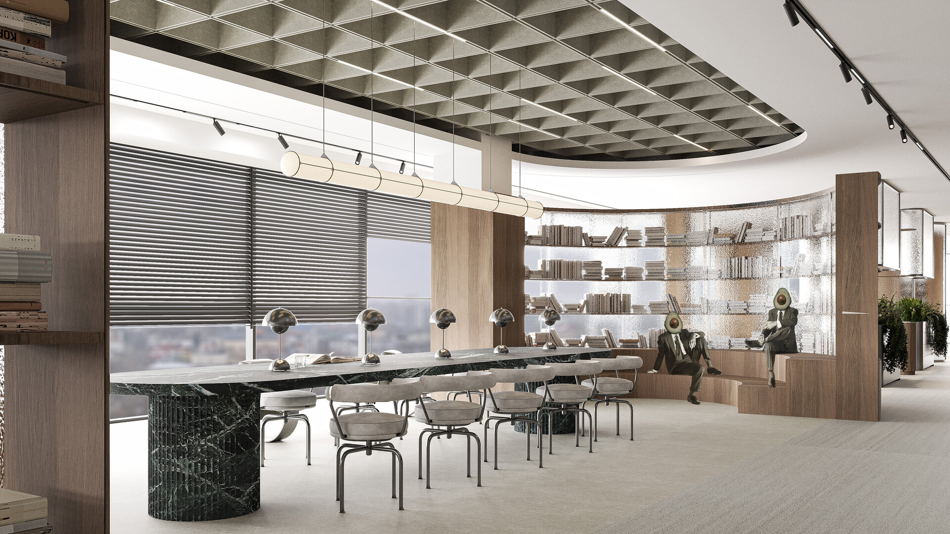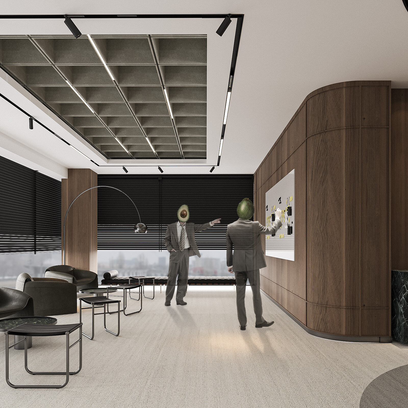 Amenajarea sediului AVOCA.DO, o firmă de avocatură fictivă specializată în dreptul afacerilor și condusă de doi parteneri seniori, se construiește pe temelia unui limbaj vizual inspirat din eleganța atemporală a stilului Mid-Century Modern, asociat frecvent cu domeniul juridic prin echilibrul său între rigoare și rafinament. Această alegere reflectă atât stabilitatea și prestigiul profesiei, cât și dorința de a proiecta un mediu contemporan, care să sprijine colaborarea și coeziunea echipei. Liniile clare, proporțiile echilibrate și materialele nobile – marmura verde, lemnul masiv de nuc, sticla texturată și metalul lucios – definesc o atmosferă sobră, dar sofisticată, completată de referințe la operele unor arhitecți și designeri faimoși, reinterpretate într-un cadru actual.