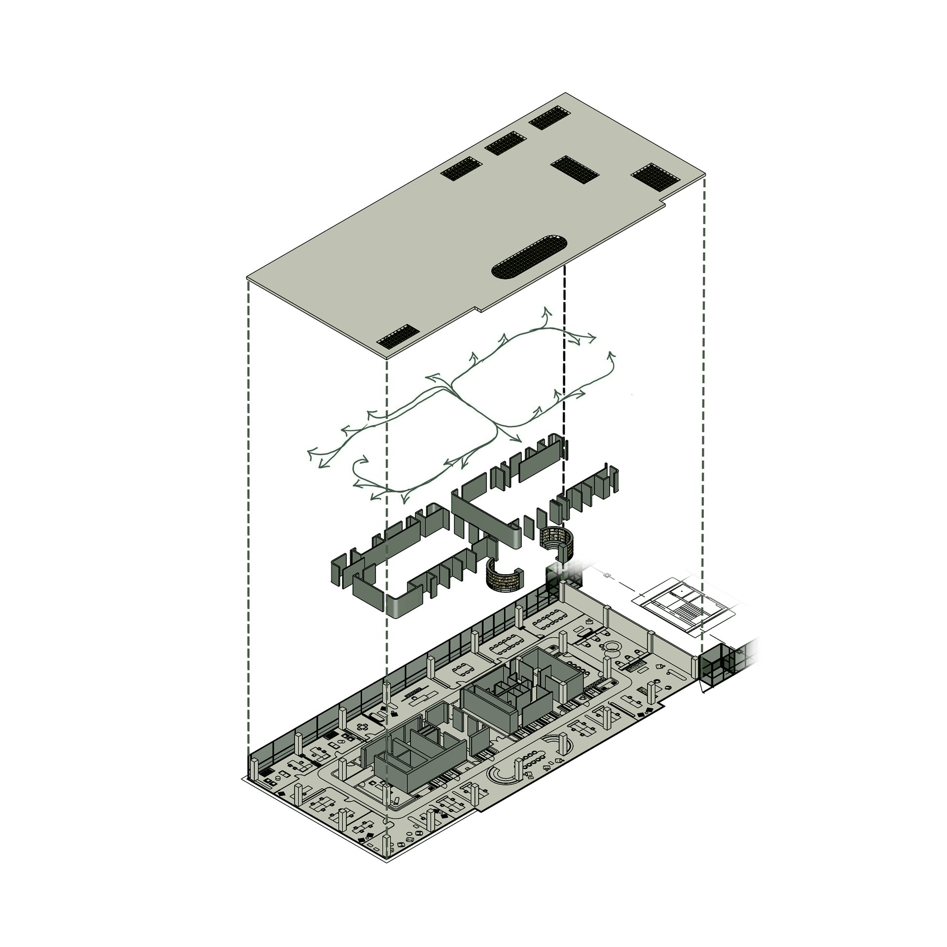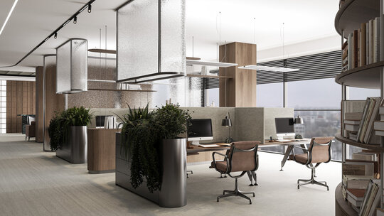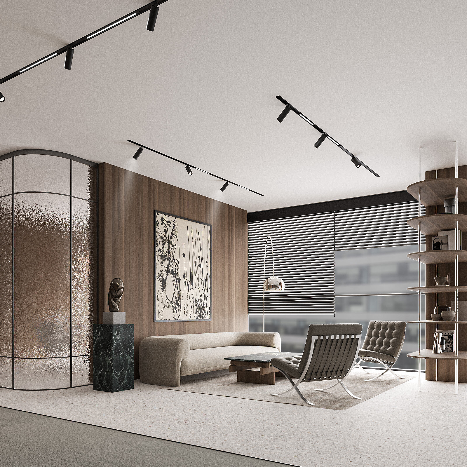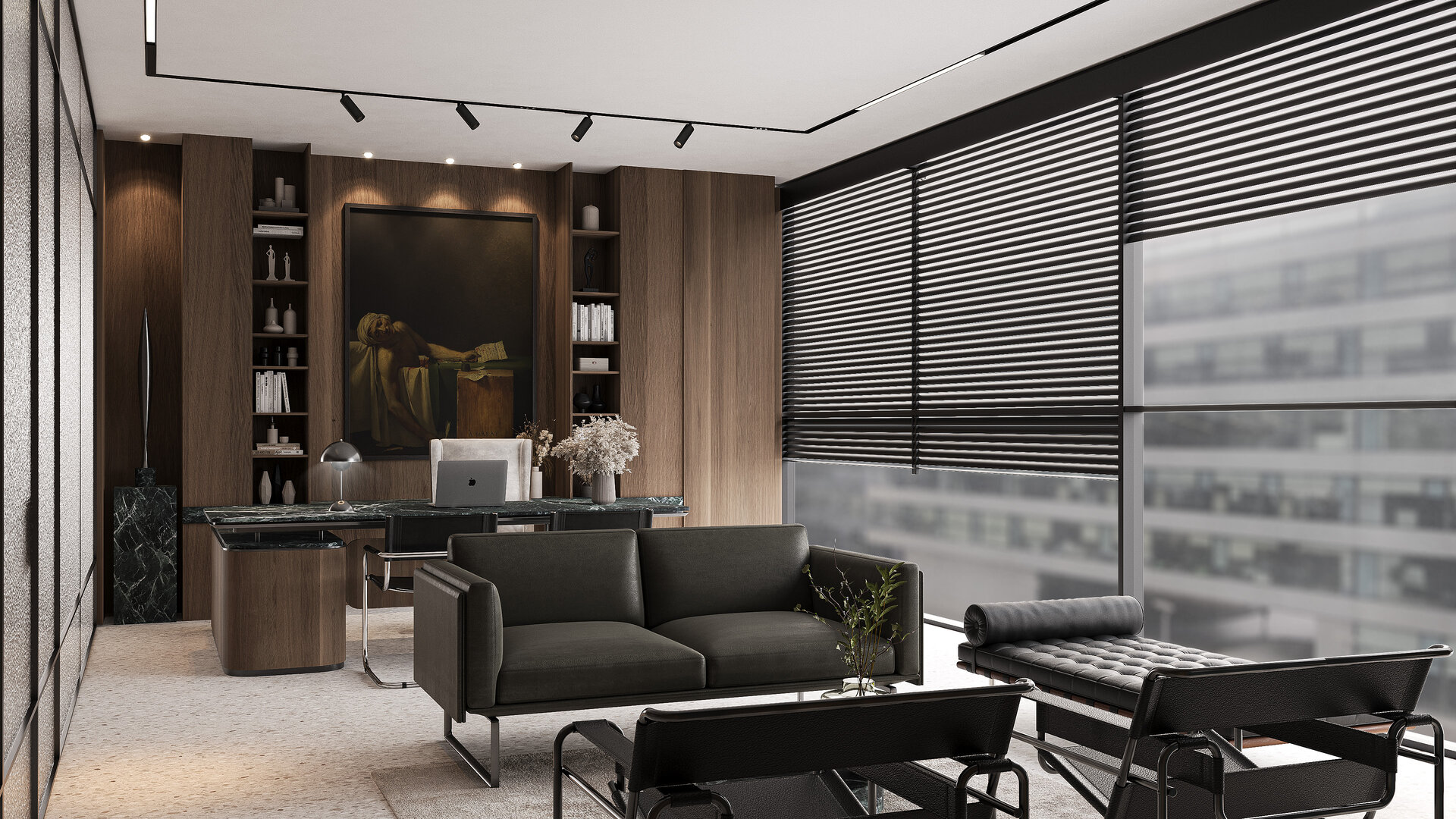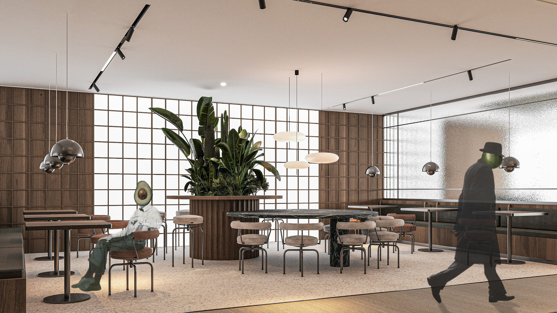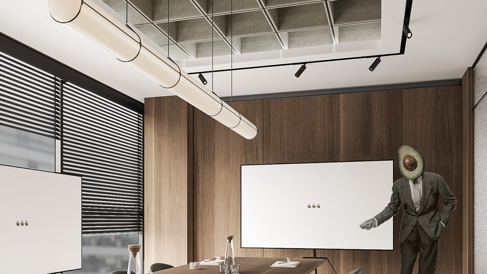 Amenajarea sediului AVOCA.DO, o firmă de avocatură fictivă specializată în dreptul afacerilor și condusă de doi parteneri seniori, se construiește pe temelia unui limbaj vizual inspirat din eleganța atemporală a stilului Mid-Century Modern, asociat frecvent cu domeniul juridic prin echilibrul său între rigoare și rafinament. Această alegere reflectă atât stabilitatea și prestigiul profesiei, cât și dorința de a proiecta un mediu contemporan, care să sprijine colaborarea și coeziunea echipei. Liniile clare, proporțiile echilibrate și materialele nobile – marmura verde, lemnul masiv de nuc, sticla texturată și metalul lucios – definesc o atmosferă sobră, dar sofisticată, completată de referințe la operele unor arhitecți și designeri faimoși, reinterpretate într-un cadru actual.
