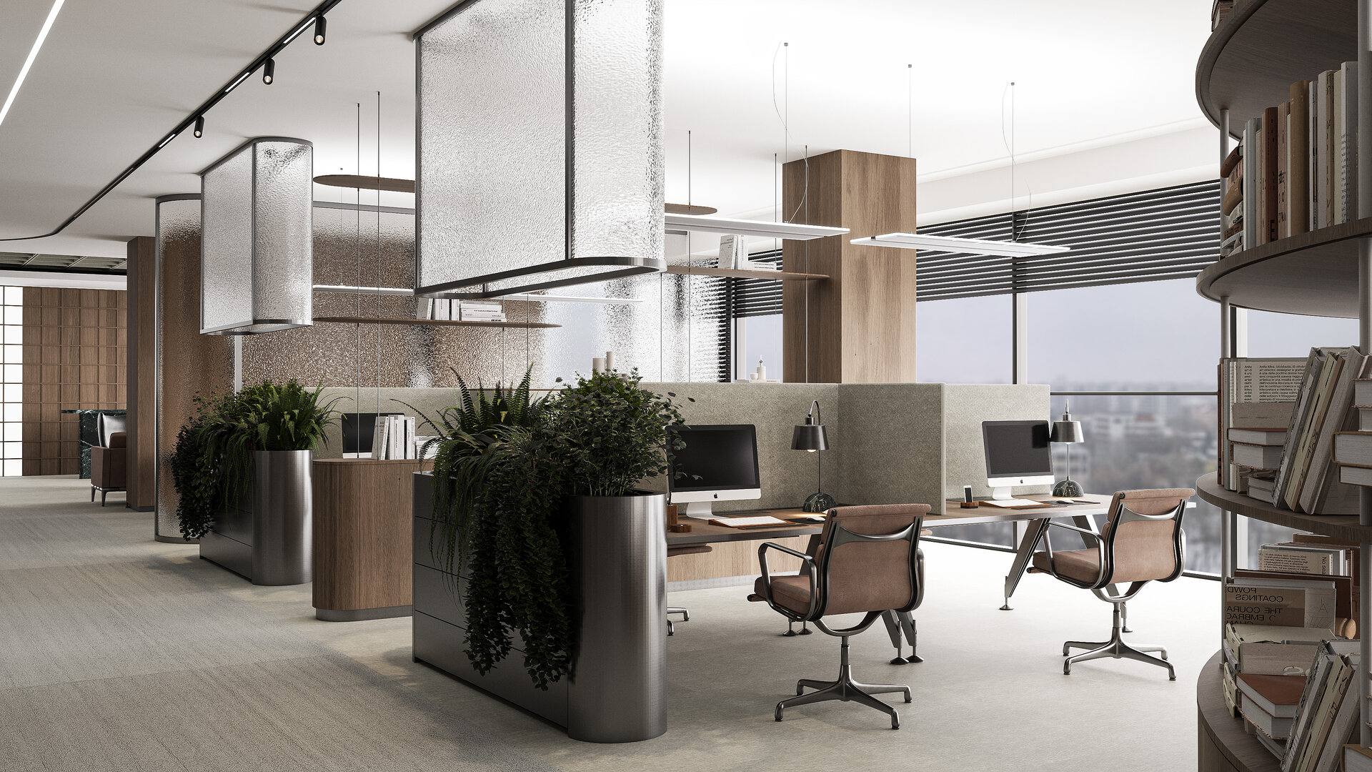Dincolo de această primă scenografie se află nucleul amenajării – biblioteca centrală. Amplasată ca un punct de referință vizual și funcțional, ea devine atât un depozitar de cunoaștere, cât și un spațiu de întâlnire și reflecție pentru întreaga echipă. Biblioteca funcționează ca un simbol al dialogului și al coeziunii, iar poziționarea ei centrală permite organizarea zonelor de lucru în jurul acestui nucleu. Open space-ul destinat avocaților juniori se desfășoară în jurul bibliotecii, păstrând transparența și comunicarea, dar fiind completat de spații mai intime pentru asociați.