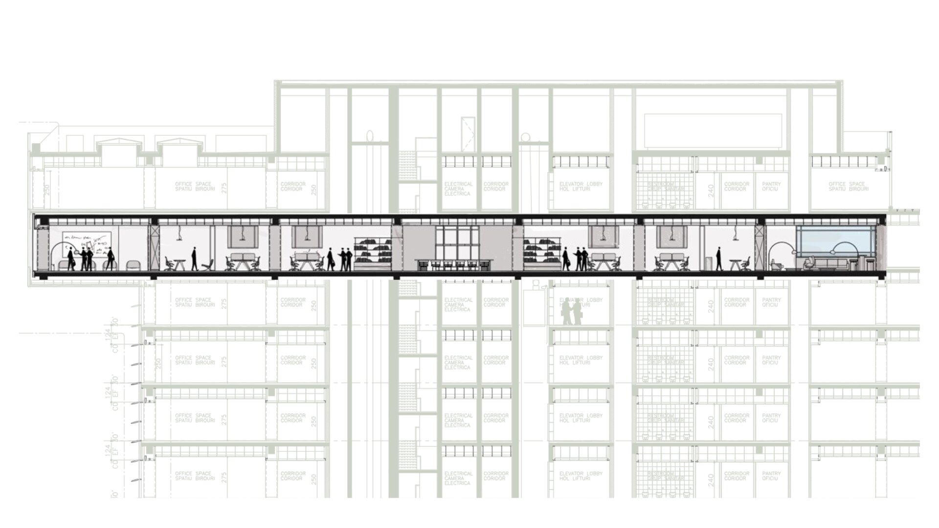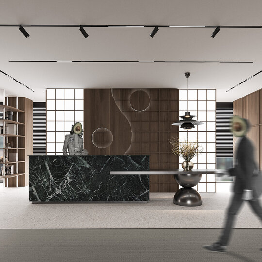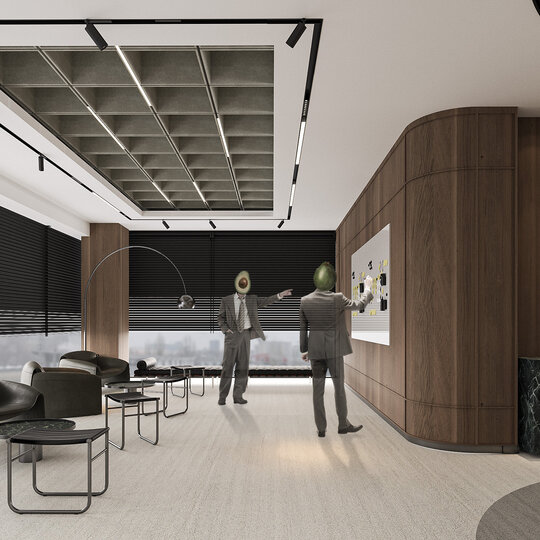 Spațiul este conceput ca un parcurs cu două registre interconectate: unul public, reprezentativ, și unul privat, rezervat în principal echipei. Vizitatorul este introdus printr-o zonă de recepție impunătoare, care se deschide treptat către sălile de conferință și birourile avocaților seniori. Aceste spații, cu un caracter mai sobru și rafinat, reprezintă interfața firmei cu exteriorul, acolo unde prestigiul și autoritatea juridică sunt comunicate printr-un cadru coerent și elegant.