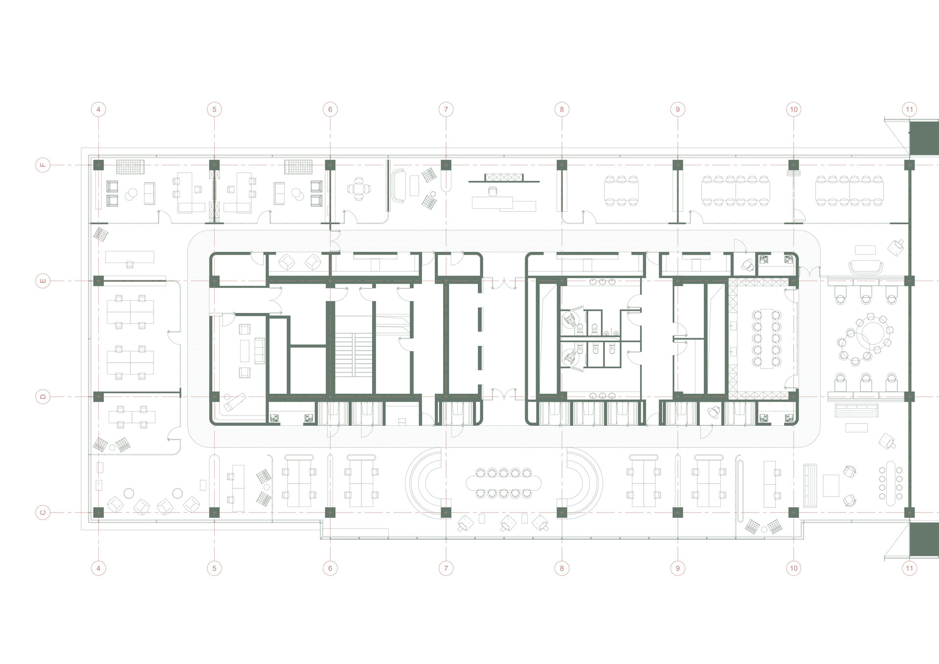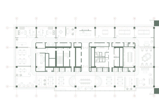 Lounge-ul și cafeteria completează zona privată, adăugând dimensiunea socială a proiectului. Lounge-ul, conceput ca un spațiu de relaxare, poate fi transformat într-o sală de licitații pentru colecția de artă contemporană a firmei, conferind spațiului o dimensiune culturală aparte. Această funcțiune suplimentară reflectă deschiderea companiei către dialogul cu mediul artistic și comunitatea, consolidând identitatea sa rafinată.