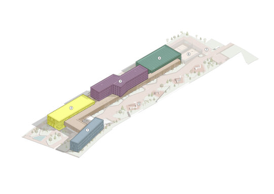 Configurația generală a ansamblului este gândită pe principiul fragmentării controlate. Patru volume principale, fiecare cu regim de înălțime și identitate funcțională proprie, sunt dispuse pe o bază comună și articulate la nivelul parterului printr-un dialog direct cu solul și spațiile exterioare. Această bază funcționează ca o platformă comunitară, un spațiu al întâlnirilor și al traversărilor cotidiene, unde interiorul și exteriorul comunică permanent. Peste această fundație fragmentată se suprapune un volum suplimentar, amplasat la etajul întâi, care devine elementul unificator al întregului ansamblu. Acest corp de legătură funcționează ca o punte arhitecturală și funcțională, reunind cele patru entități distincte într-o compoziție coerentă și într-un organism unitar.