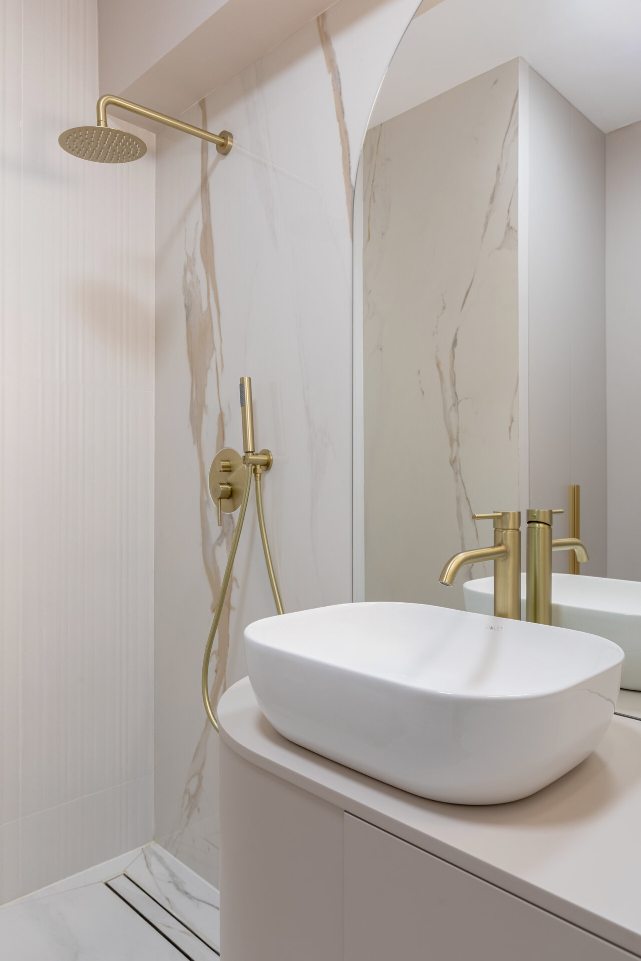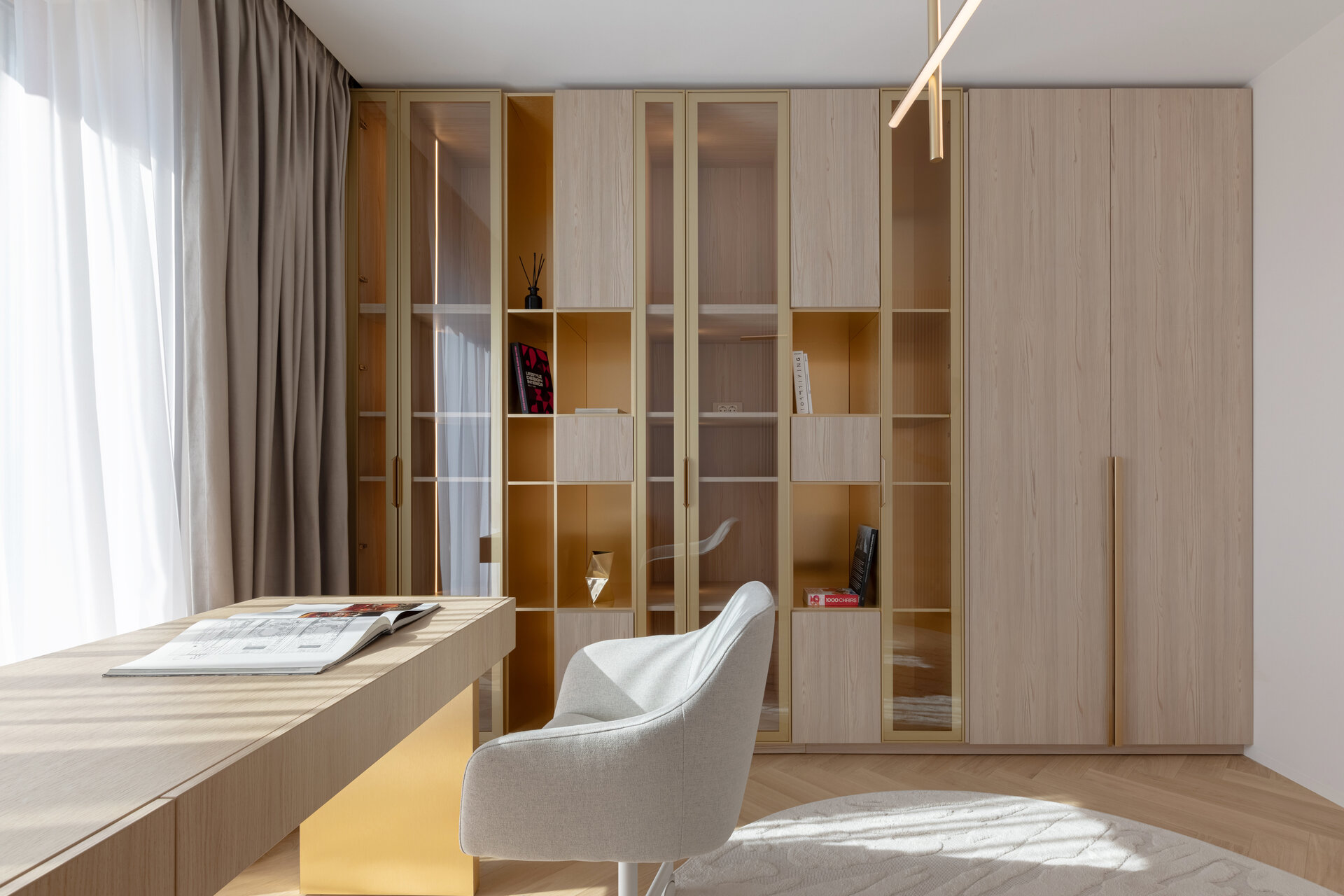 Este un spațiu menit să te țină concentrat, așa că am adoptat o rigoare carteziană exprimată de mobilier sau de corpurile de iluminat. Alegerea nuantelor aurii și textura lemnului, au fost influențate de abundența luminii de la vest.