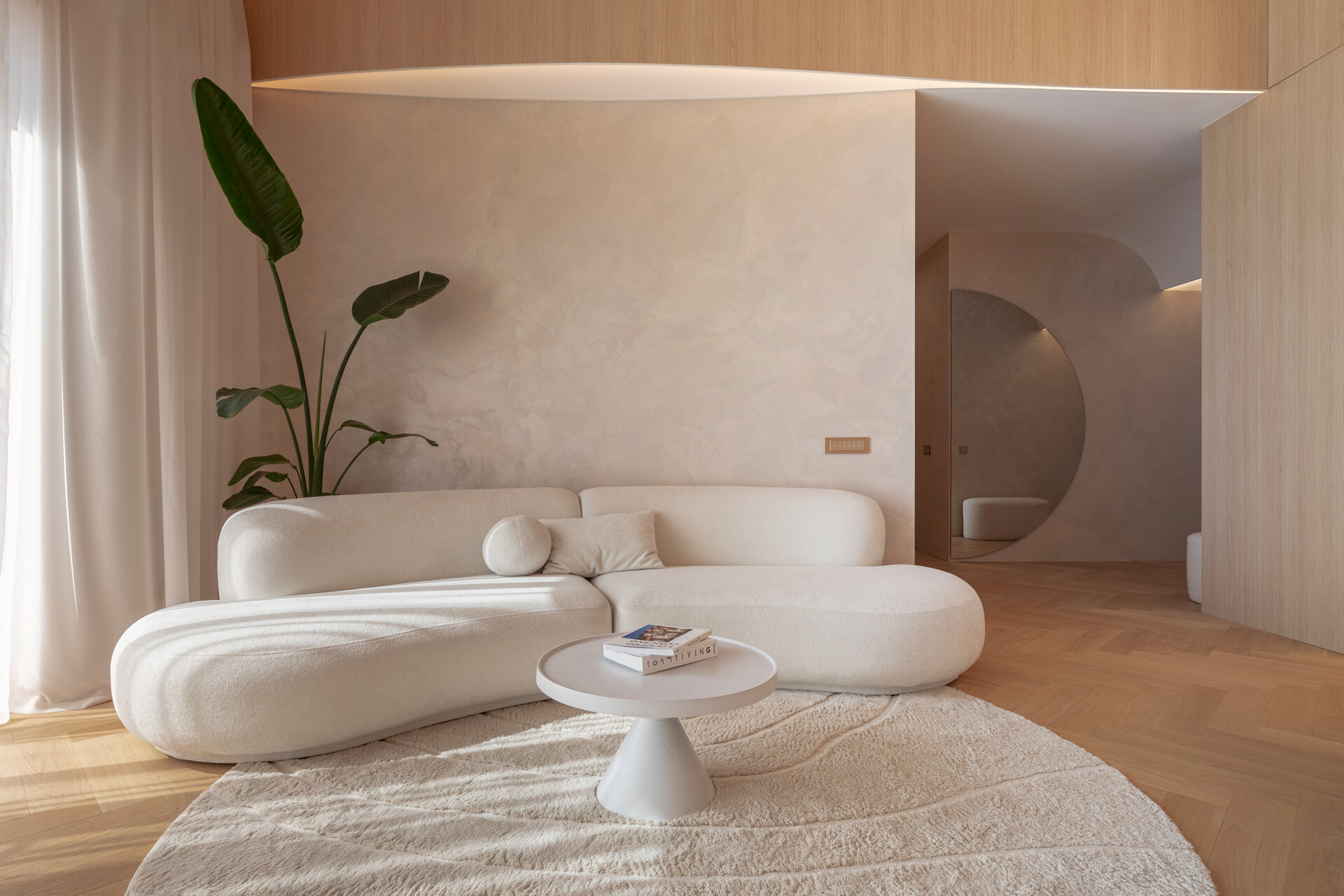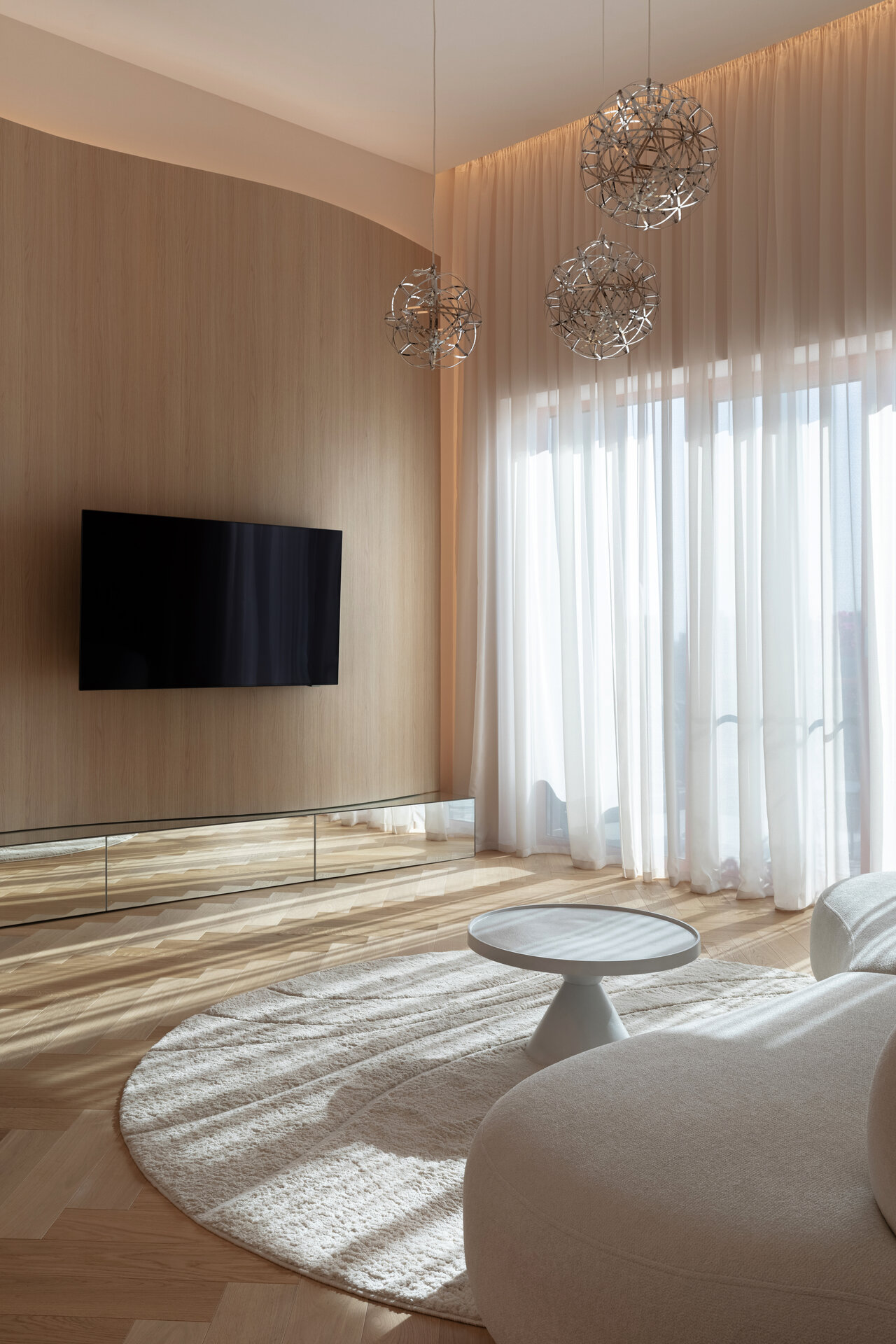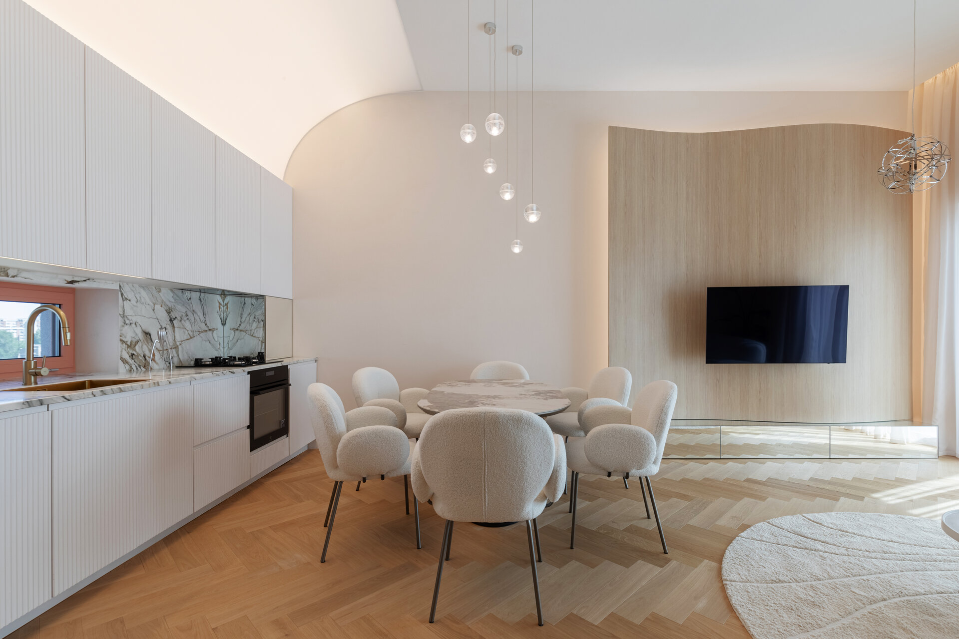 Zona de zi, care se unește cu bucătăria, beneficiază de înălțime mare și vitraje generoase, fiind foarte luminată după amiază. Ca urmare, am decis să folosim texturi naturale și nuanțe calde aplicate atât suprafețelor rotunjite ale mobilierului, cât și cadrului arhitectural nou creat (concavitatea din spatele canapelei, grinda luminoasă de deasupra ei, un fald sculptural pentru TV, un ecran de barisol care unește mobilierul de bucătărie cu tavanul).