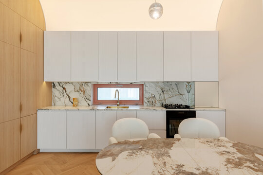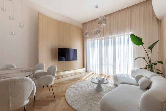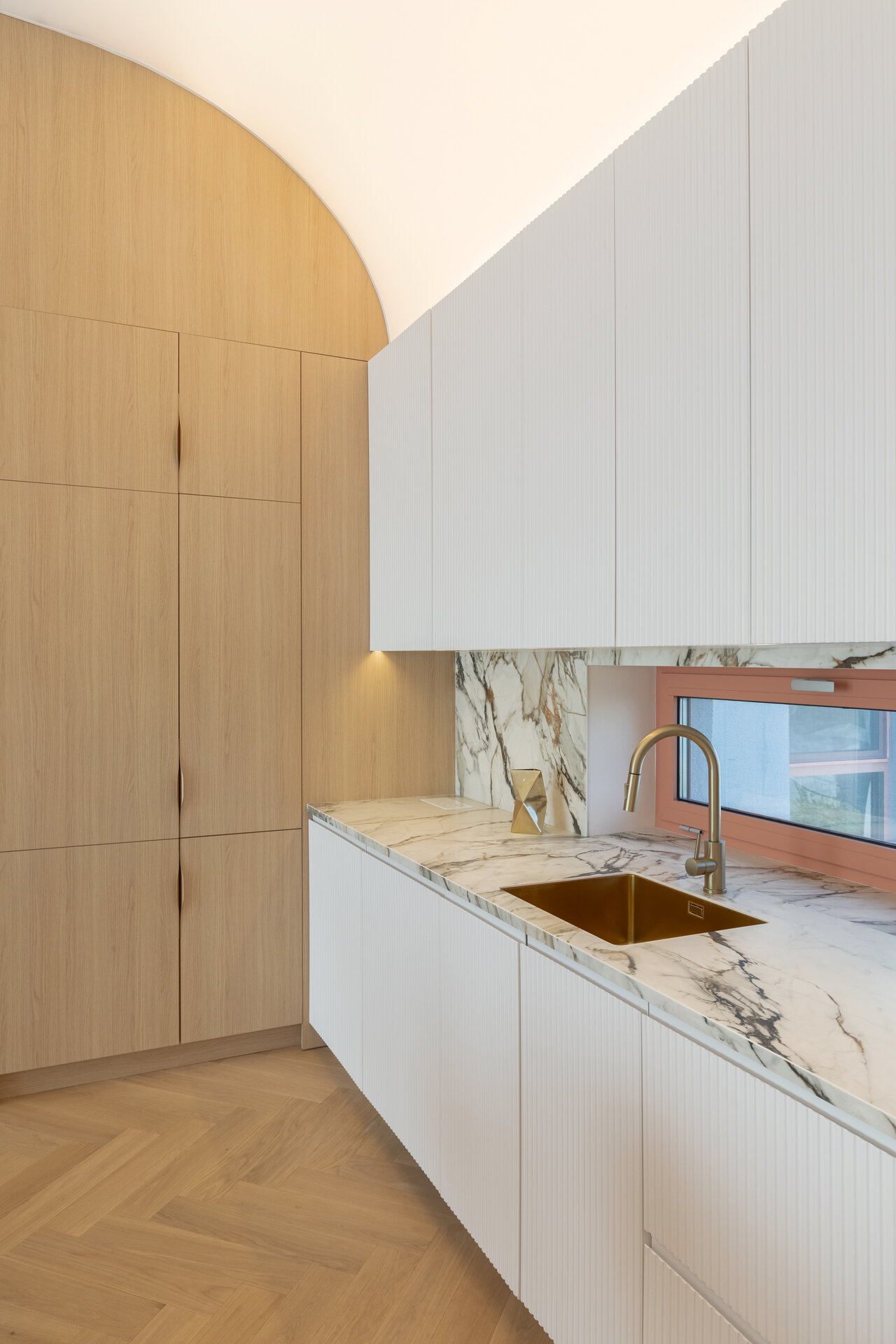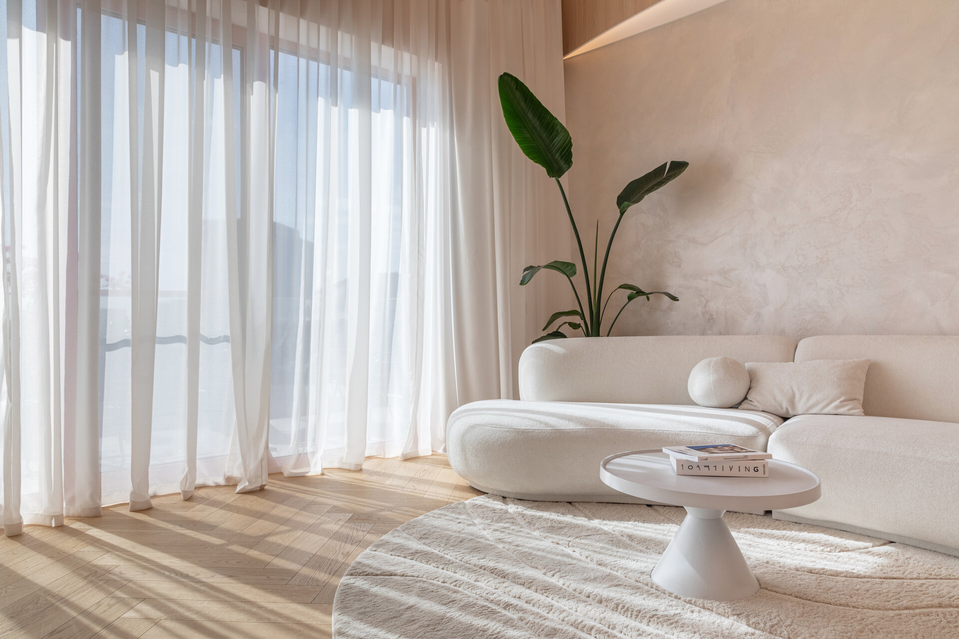 Zona de zi, care se unește cu bucătăria, beneficiază de înălțime mare și vitraje generoase, fiind foarte luminată după amiază. Ca urmare, am decis să folosim texturi naturale și nuanțe calde aplicate atât suprafețelor rotunjite ale mobilierului, cât și cadrului arhitectural nou creat (concavitatea din spatele canapelei, grinda luminoasă de deasupra ei, un fald sculptural pentru TV, un ecran de barisol care unește mobilierul de bucătărie cu tavanul).