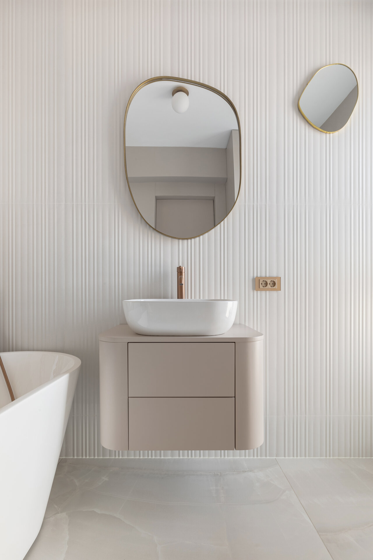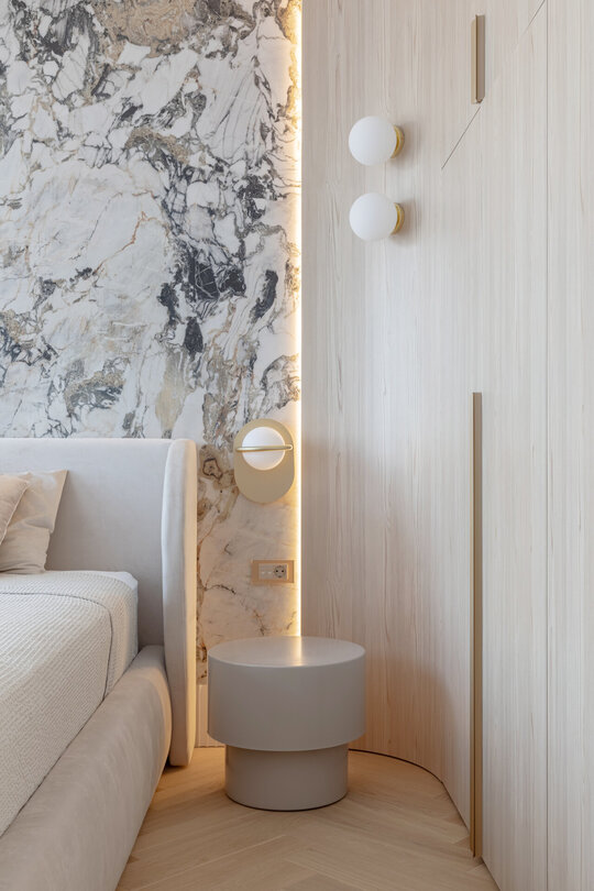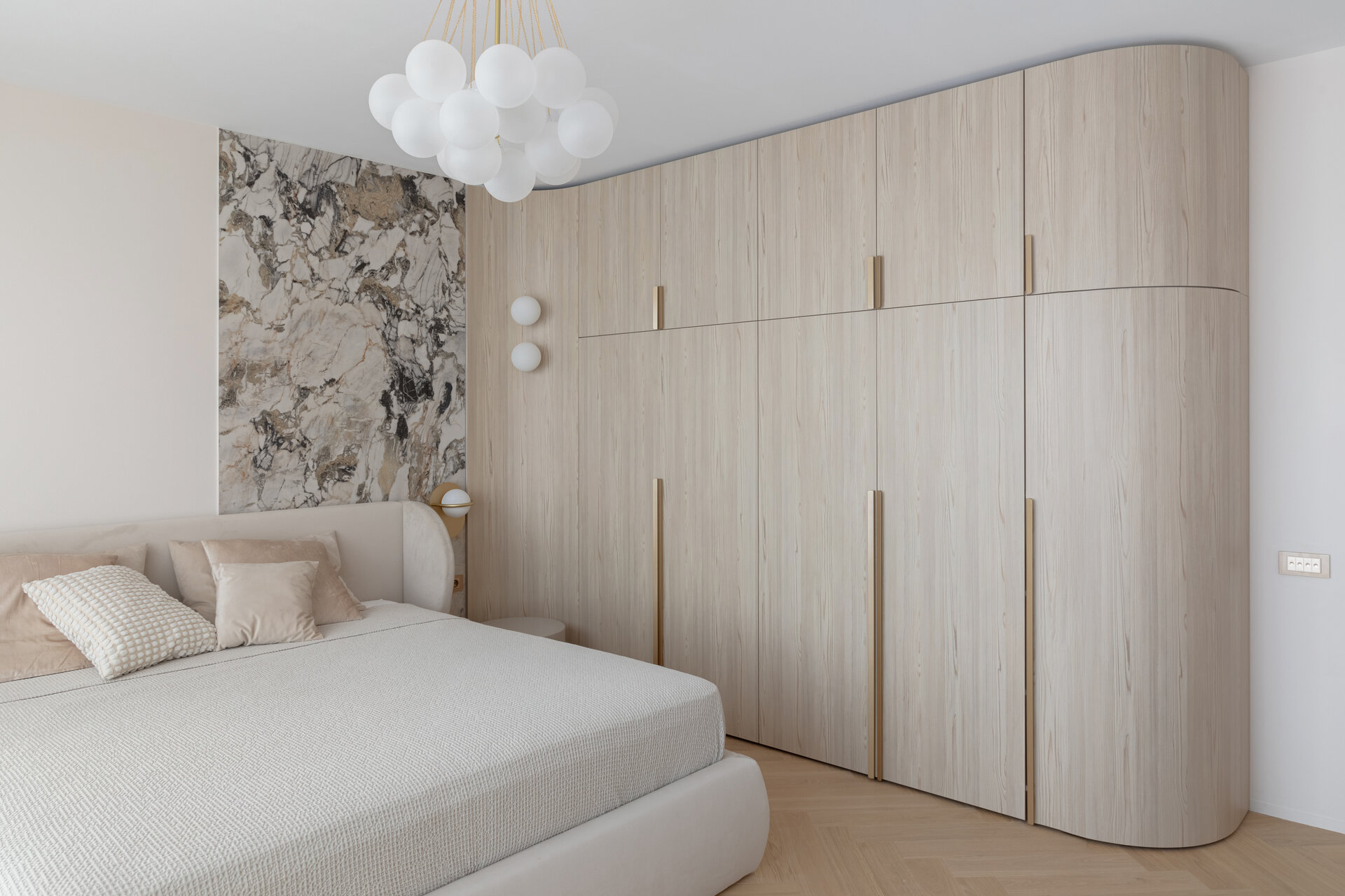 În dormitorul matrimonial alăturarea fragmentară dintre piatră și lemn creează un fundal pictural. Predomină suprafețele curbe, fie că vorbim despre tăblia patului, dressing, noptiere sau oglinzi.