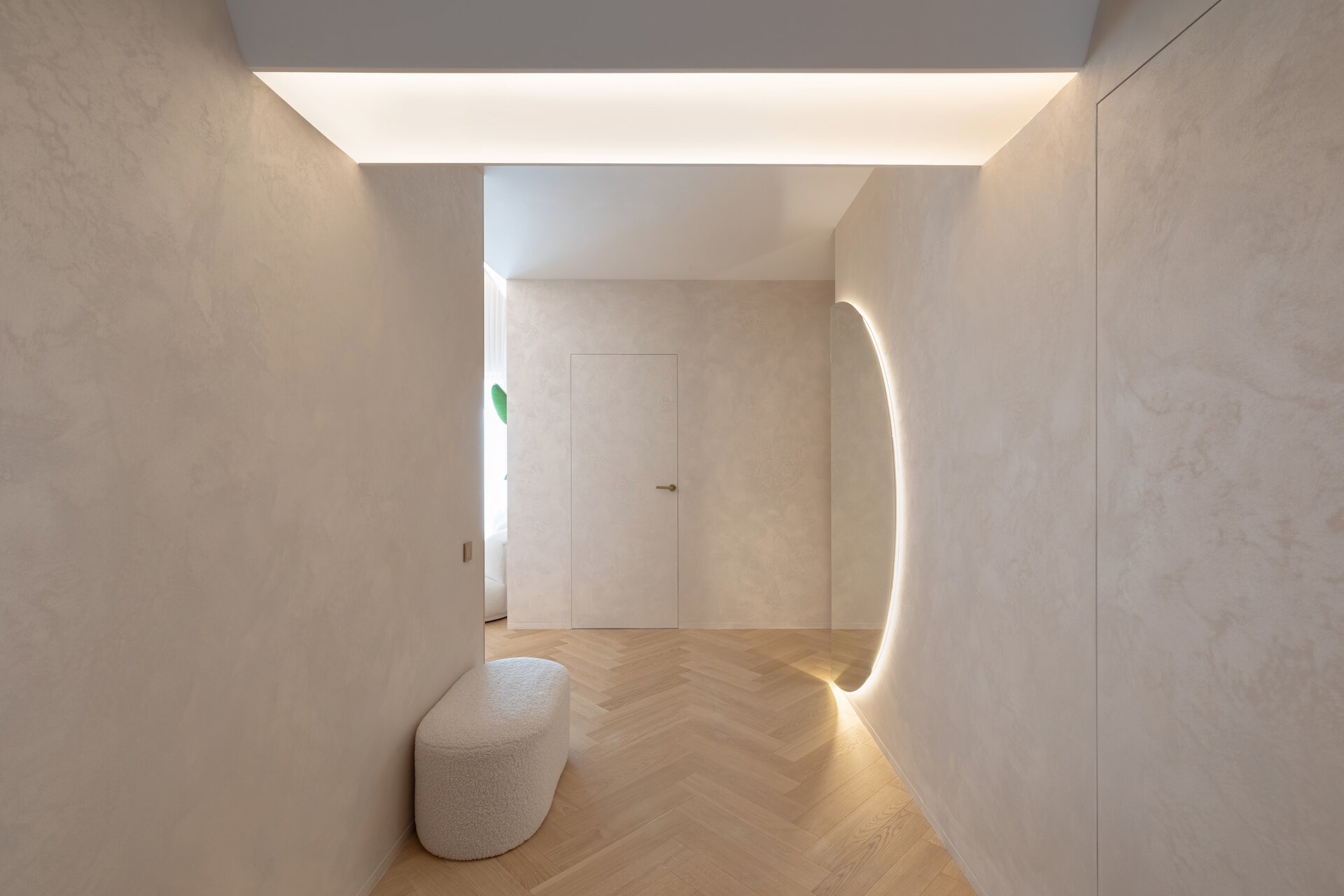 Holul de acces te conduce cu lejeritate în toate încăperile, oferă un spațiu convenabil de depozitare și transformă o grindă existentă într-un obiect arhitectural de iluminat, asemenea unui prag. Oglinda marchează existența unui colț și oferă indicii despre ce urmează.