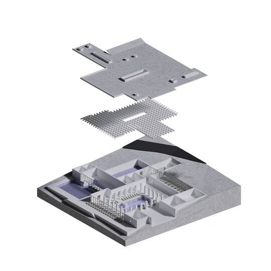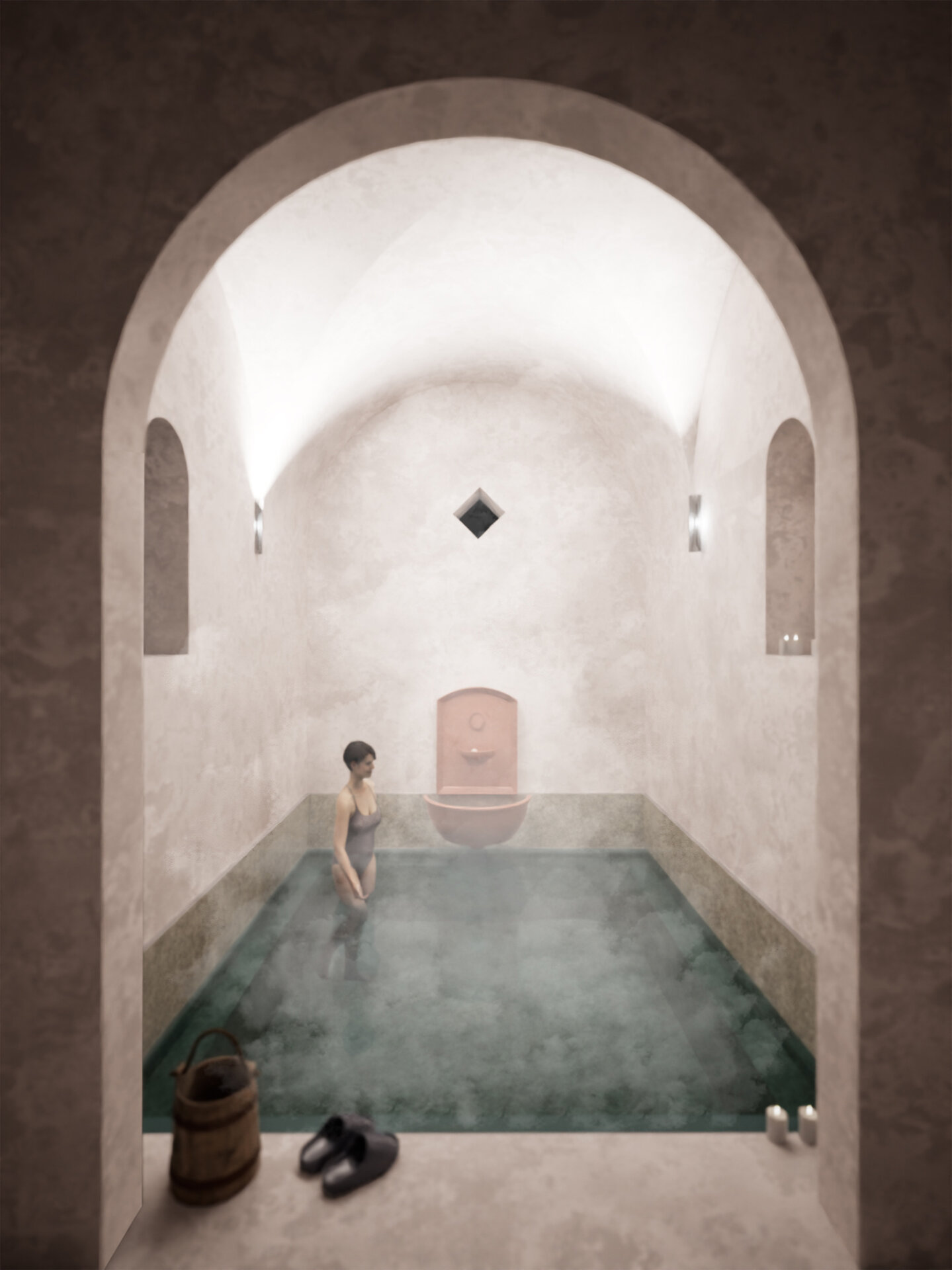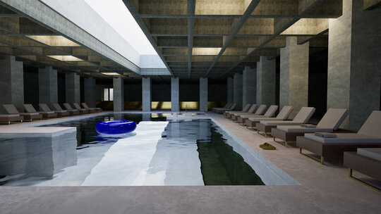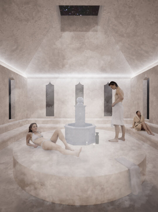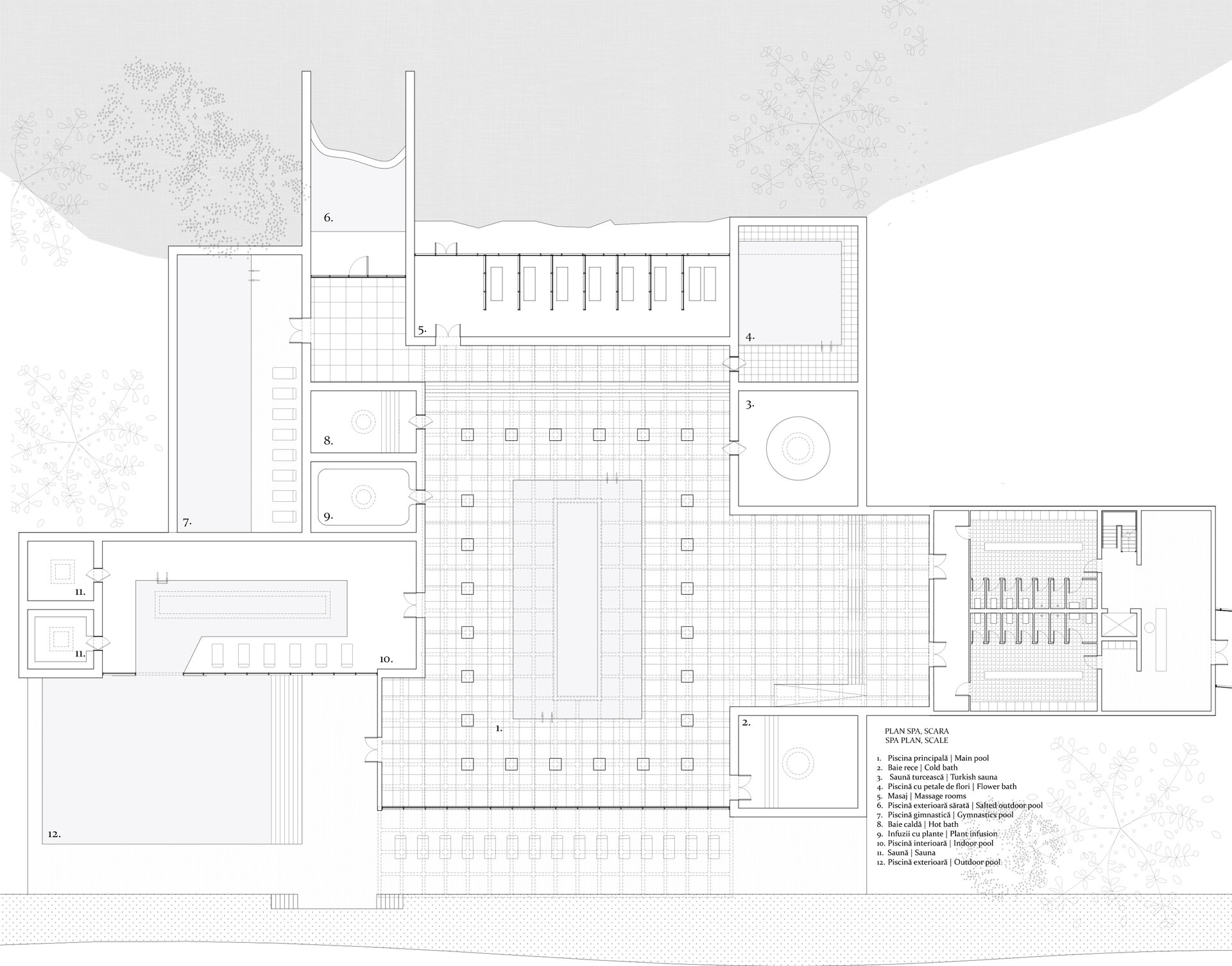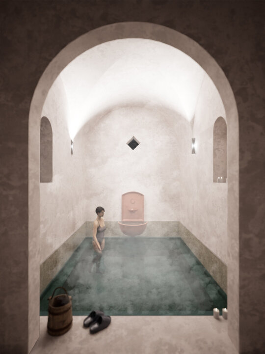Lumina naturală joacă un rol esențial. Golurile în placa zonei de spa crează un joc continuu între umbră și strălucire.
