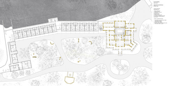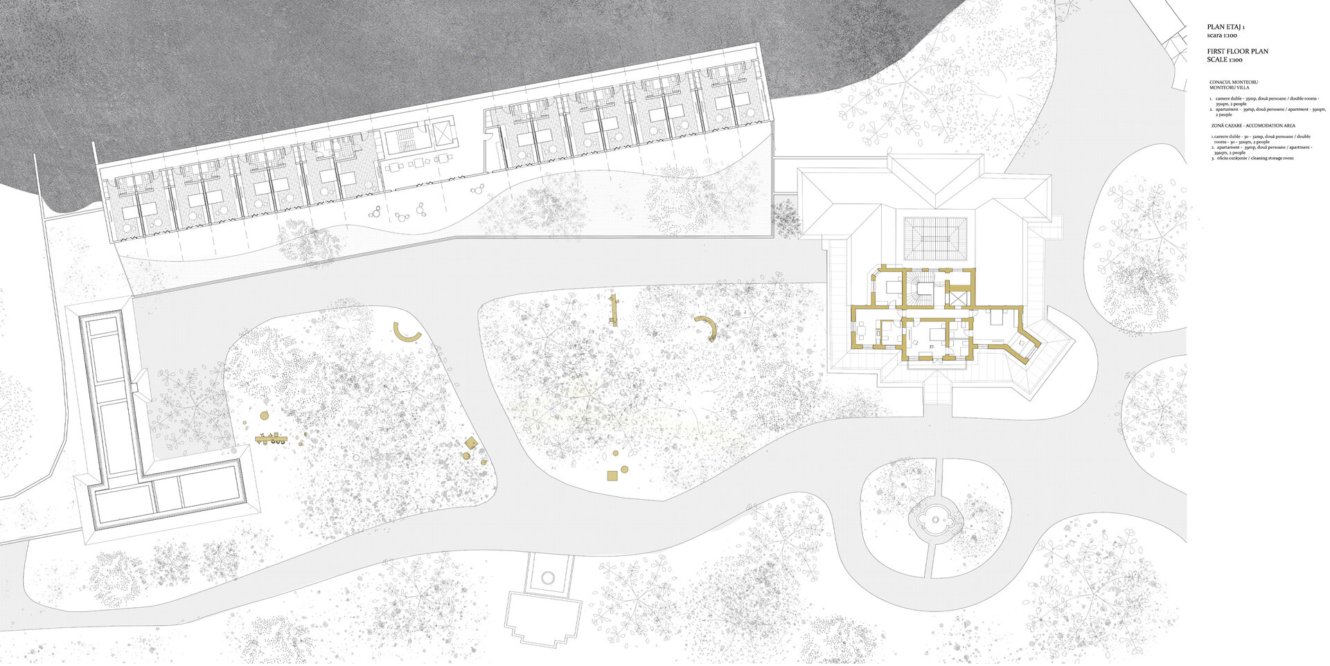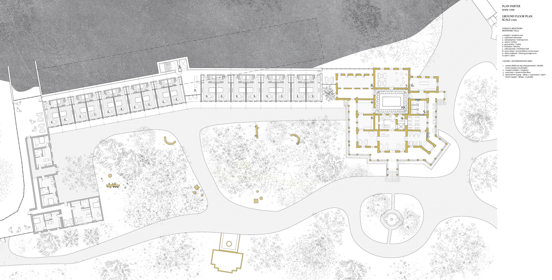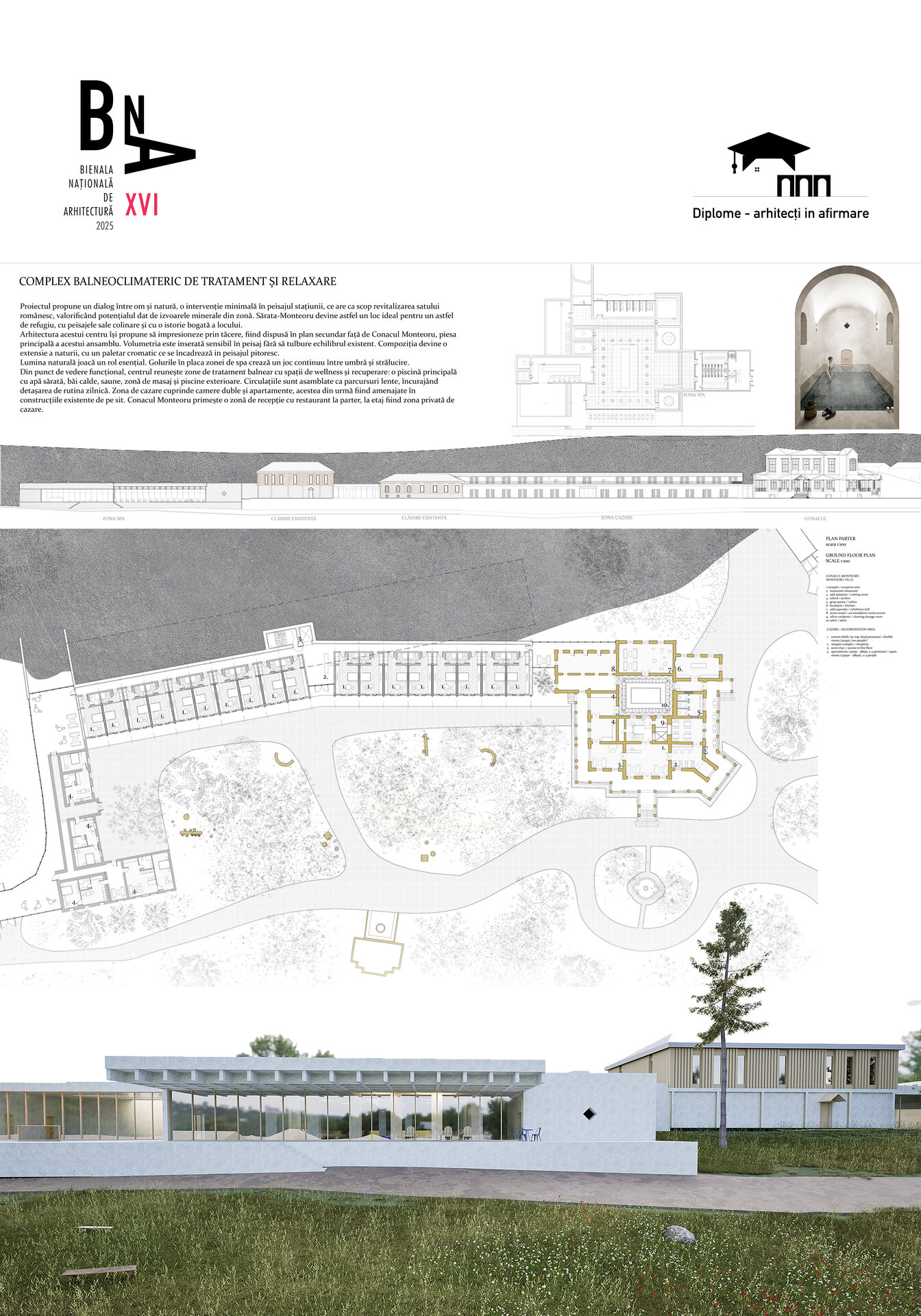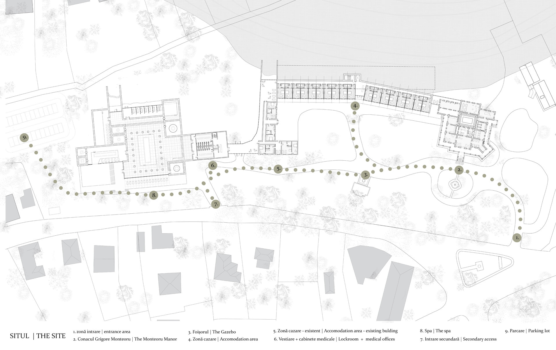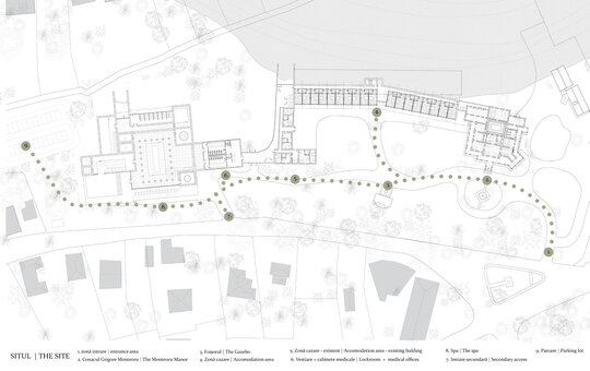 Din punct de vedere funcțional, centrul reunește zone de tratament balnear cu spații de wellness și recuperare: o piscină principală cu apă sărată, băi calde, saune, zonă de masaj și piscine exterioare. Circulațiile sunt asamblate ca parcursuri lente, încurajând detașarea de rutina zilnică. Zona de cazare cuprinde camere duble și apartamente, acestea din urmă fiind amenajate în construcțiile existente de pe sit. Conacul Monteoru primește o zonă de recepție cu restaurant la parter, la etaj fiind zona privată de cazare.
