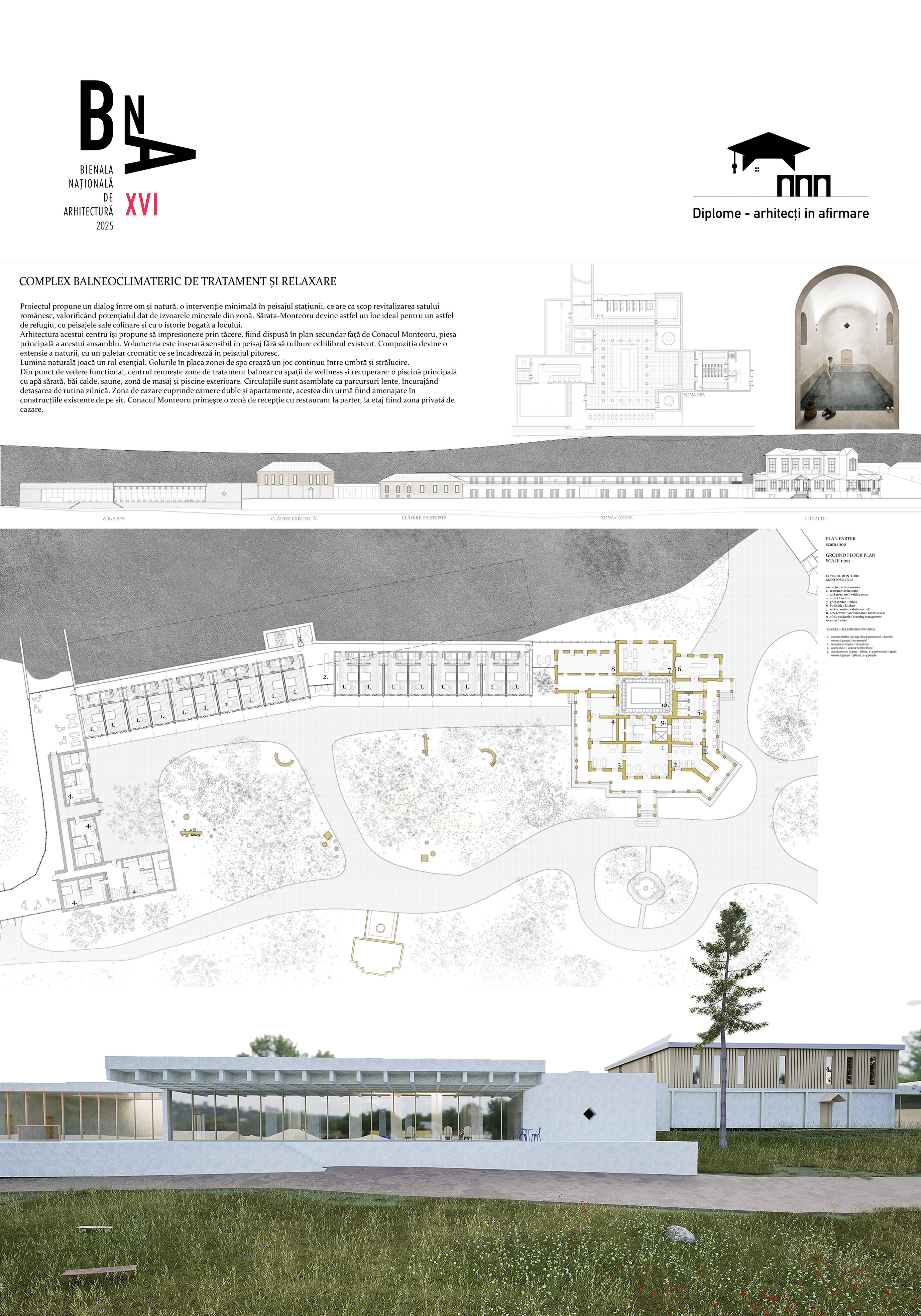 Proiectul propune un dialog între om și natură, o intervenție minimală în peisajul stațiunii, ce are ca scop revitalizarea satului românesc, valorificând potențialul dat de izvoarele minerale din zonă. Sărata-Monteoru devine astfel un loc ideal pentru un astfel de refugiu, cu peisajele sale colinare și cu o istorie bogată a locului.