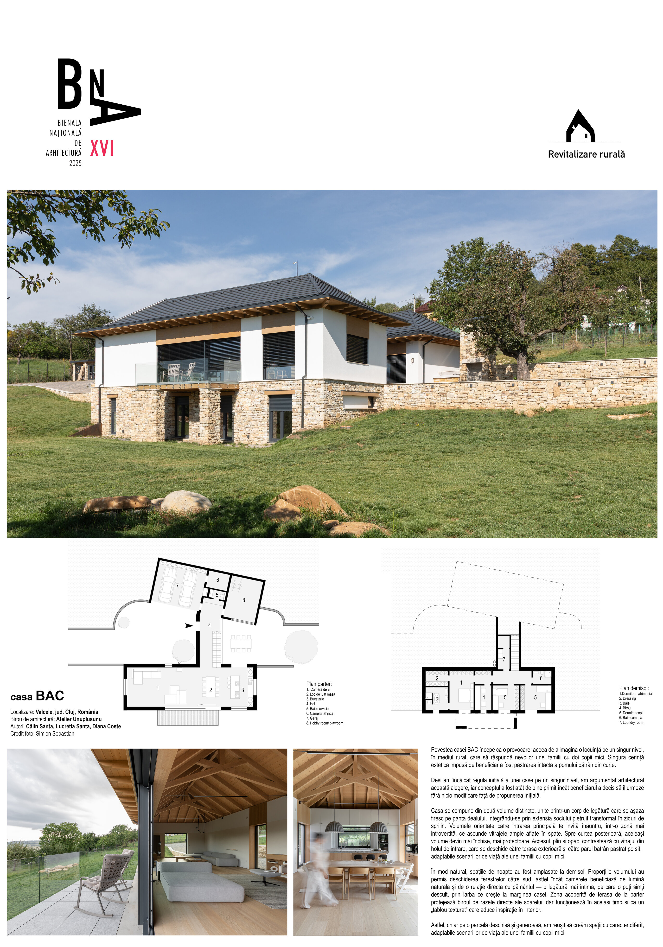 Povestea casei BAC începe ca o provocare: aceea de a imagina o locuință pe un singur nivel, în mediul rural, care să răspundă nevoilor unei familii cu doi copii mici. Singura cerință estetică impusă de beneficiar a fost păstrarea intactă a pomului bătrân din curte.